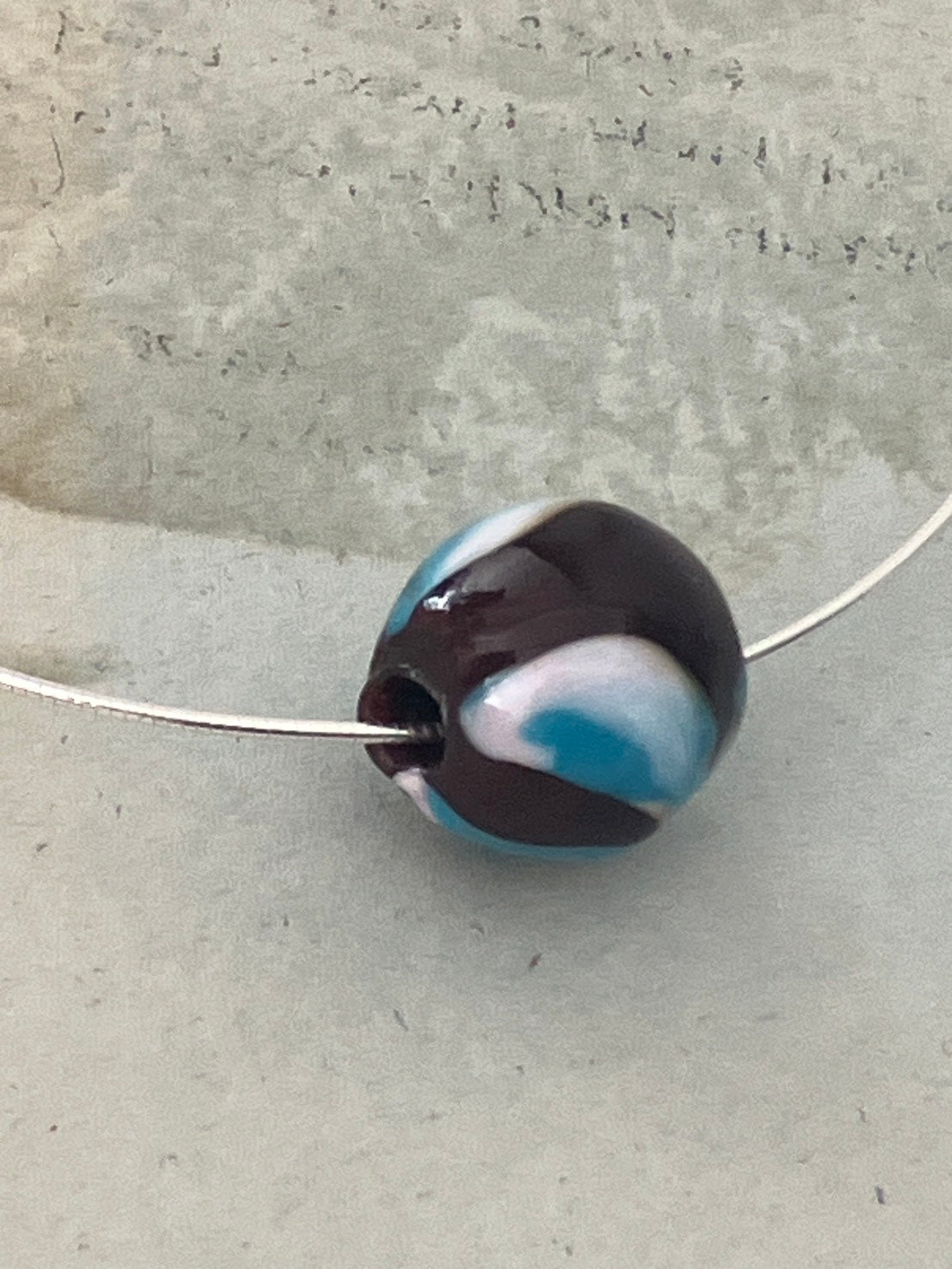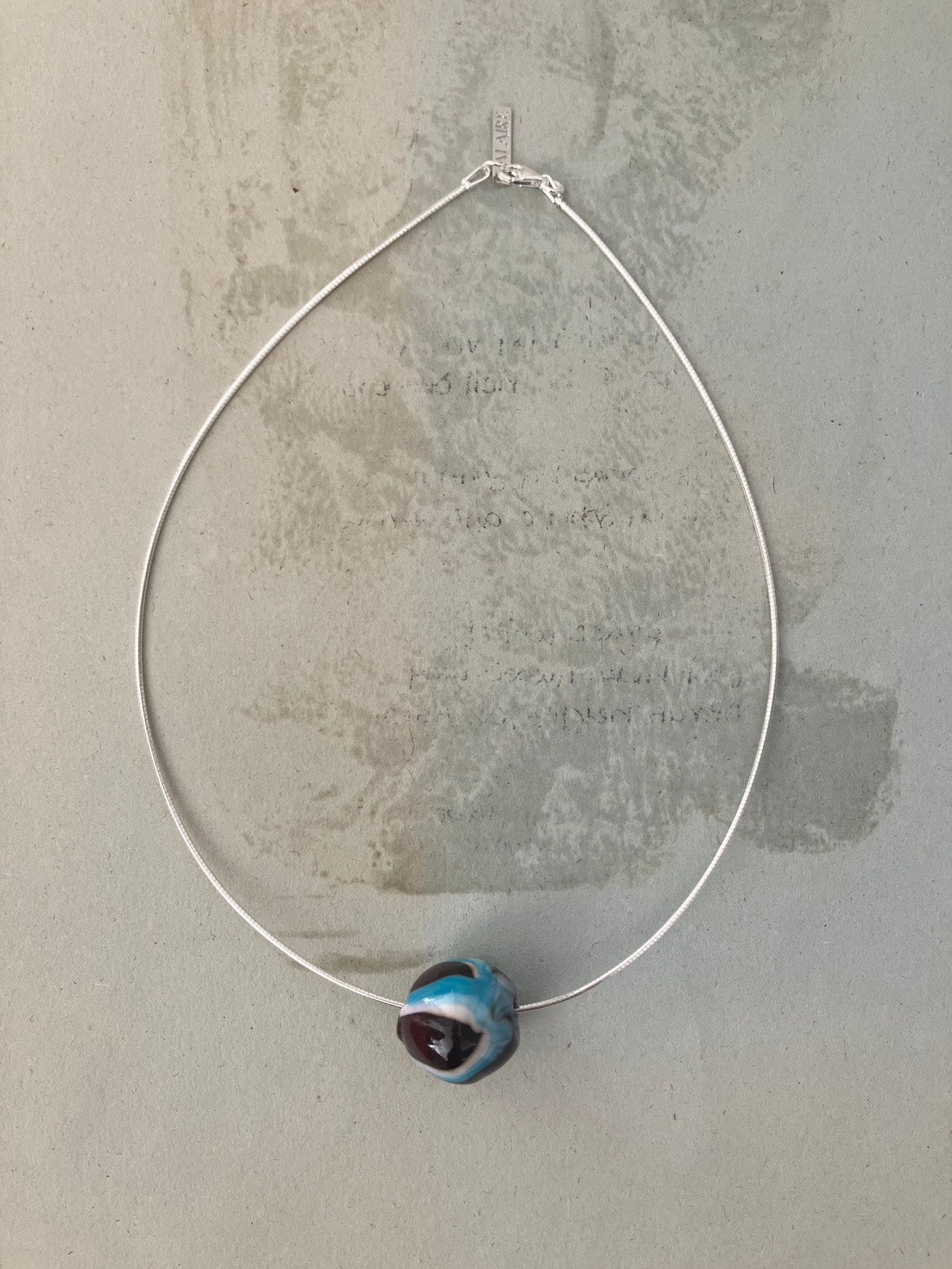 手作りのガラスビーズで出来たキャンディのネックレス。Choco Carameloは、チョコレートのような奥行きのある美味しそうなブラウンに、ターコイズブルーとホワイトが溶け込むマーブルカラー。