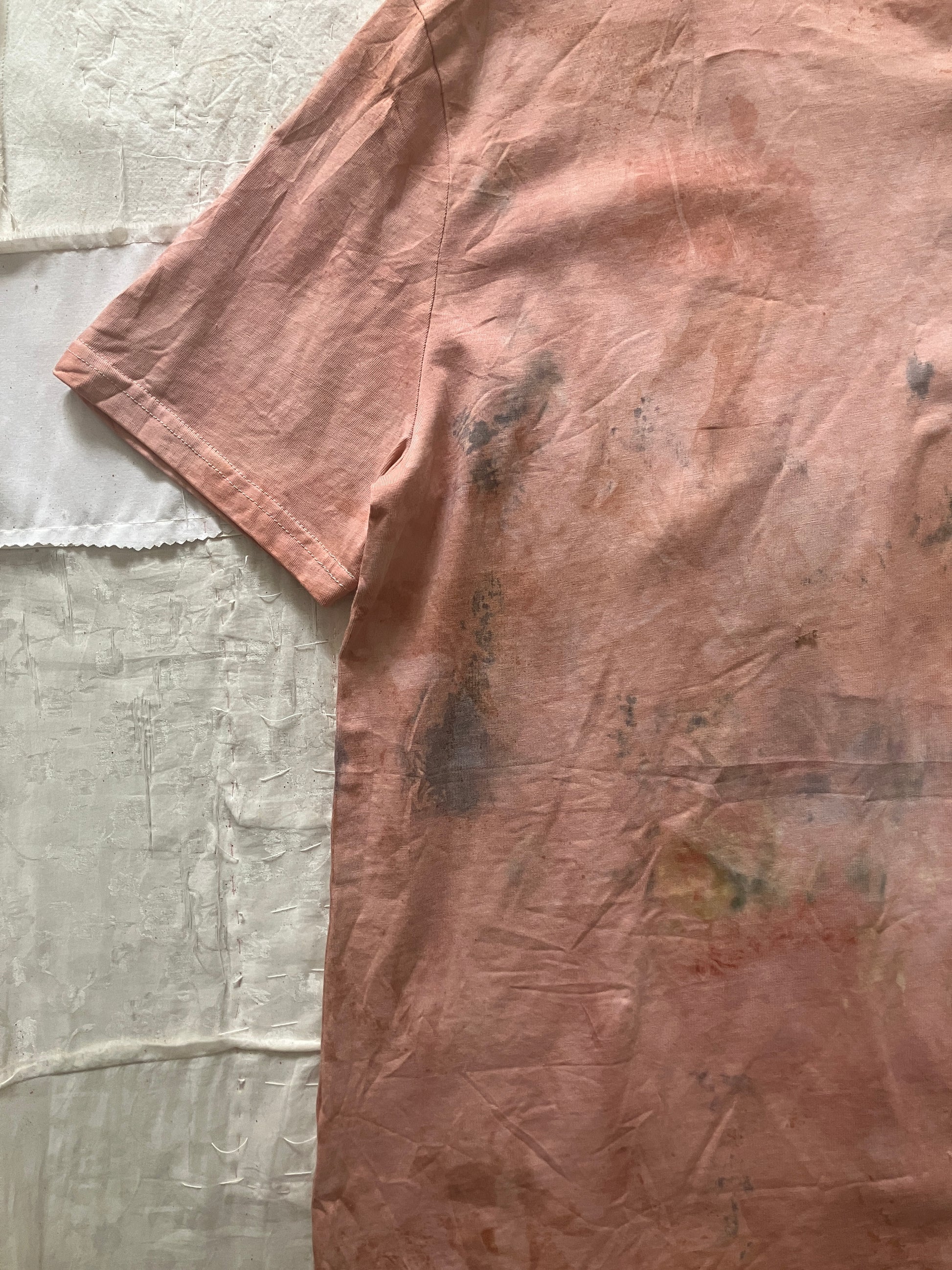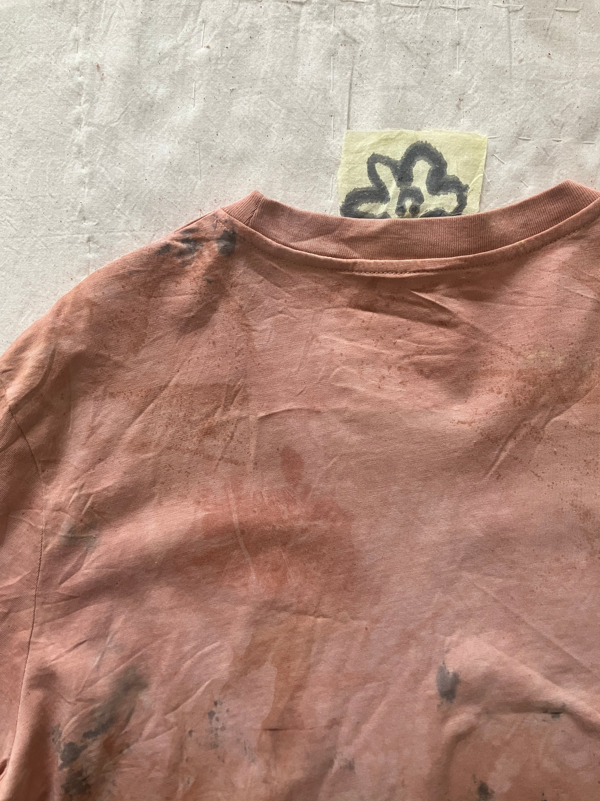 植物の皮やお花、雑草などを使って自作した天然顔料で染めたTシャツ。