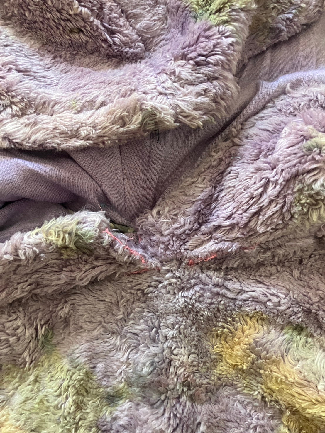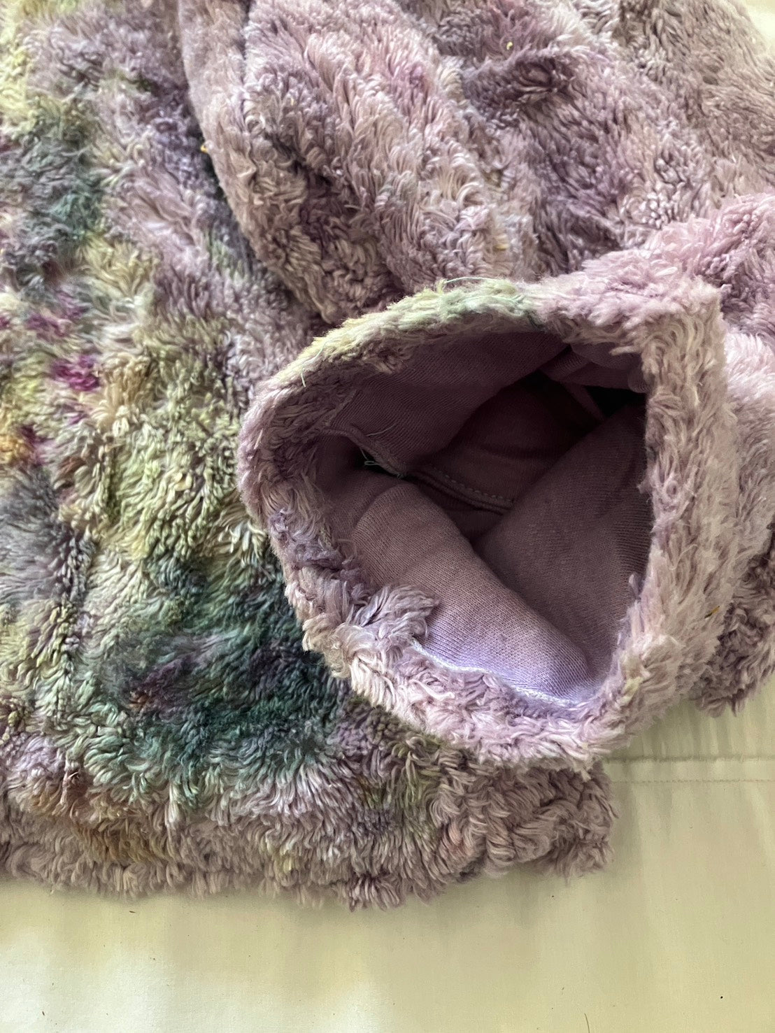 ヘンプファーをお花で染めて手作りした、一点もののフーディ。