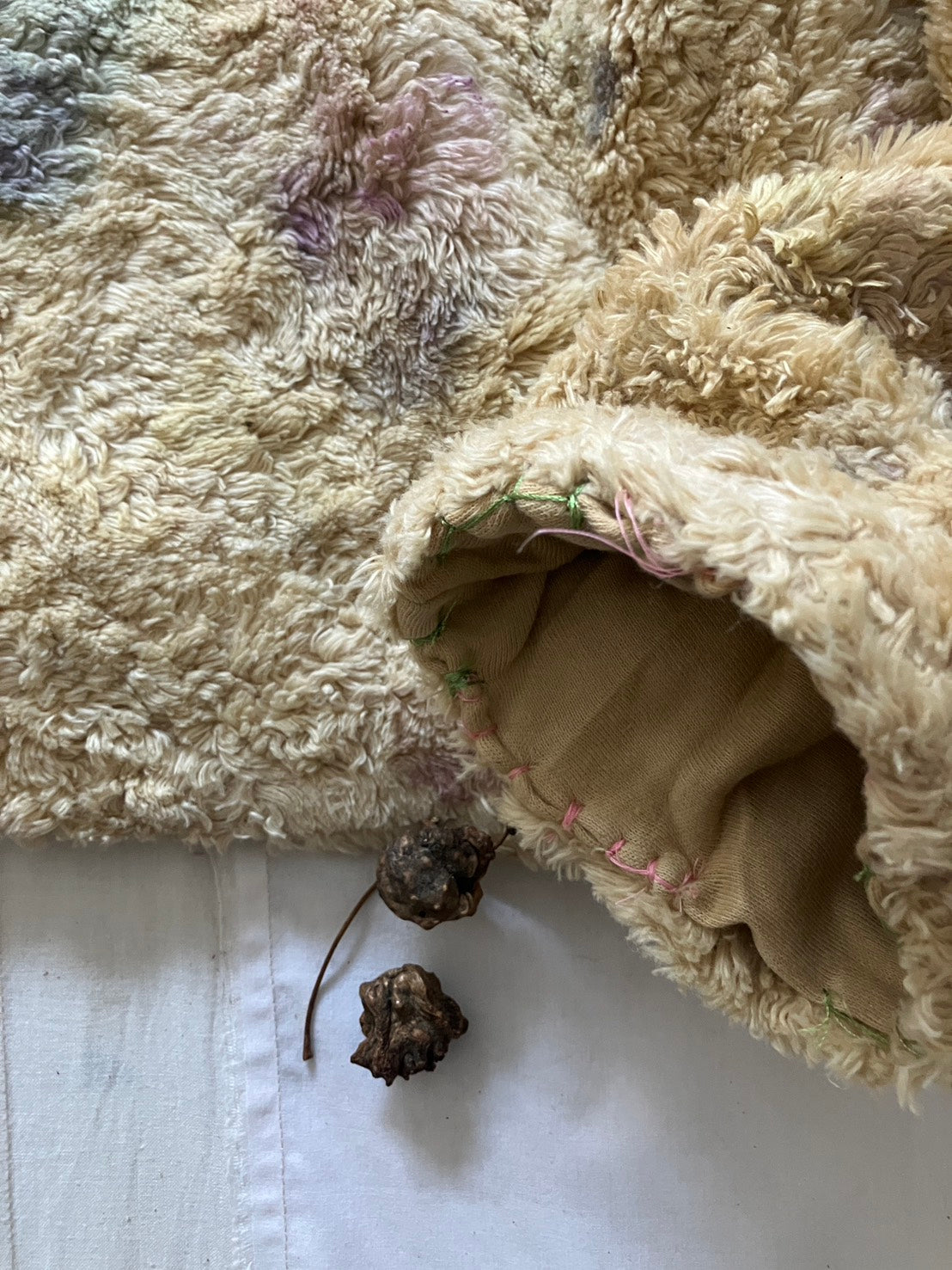 全体の淡いブラウンは、秋に採集したオークガルの染料で染められた色。オークガルは「オークアップル」とも呼ばれ、小さなハチがドングリに卵を産み付けることで形成されます。古くから染色等に使われてきた伝統的な天然素材です。
