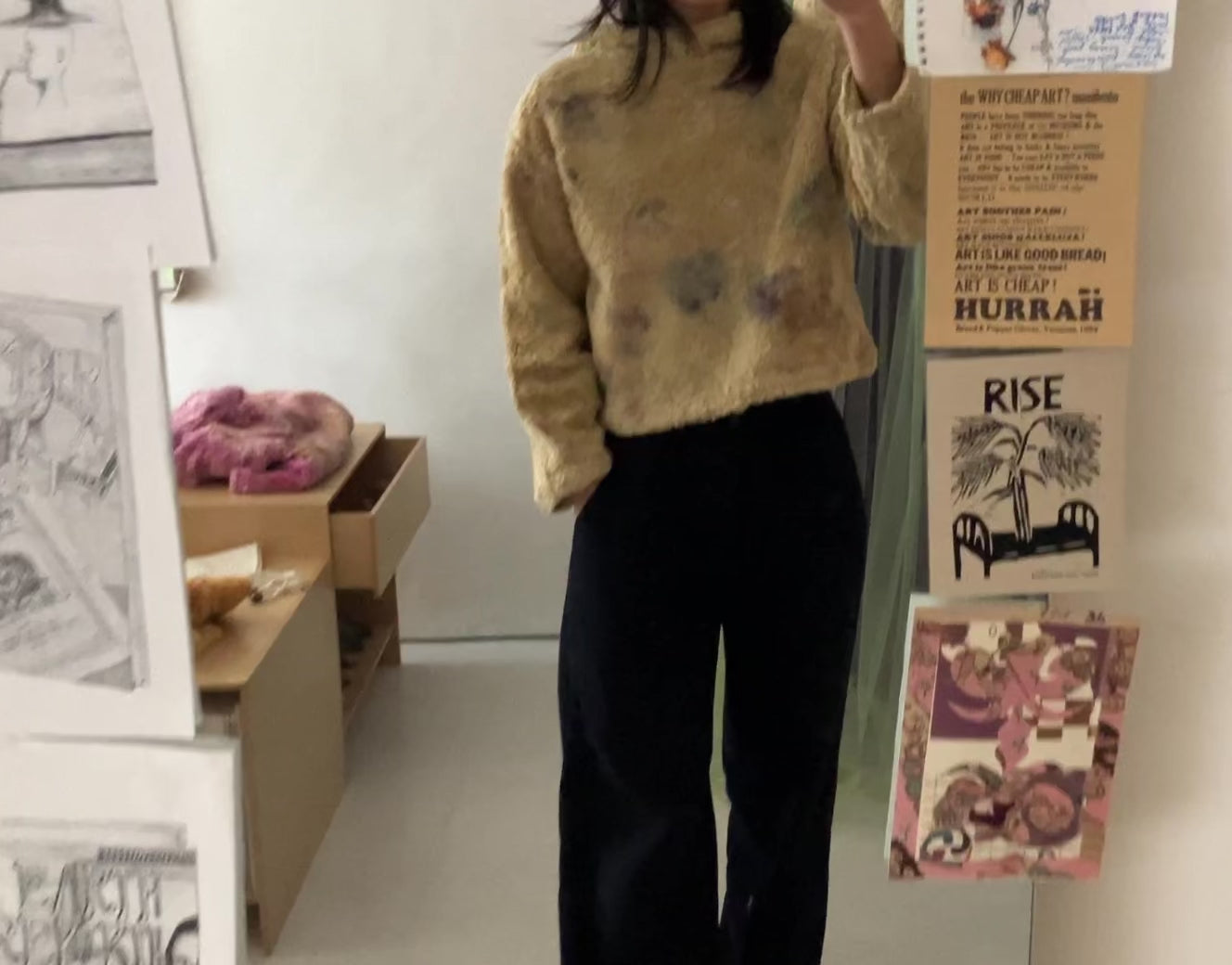 ヘンプファーをお花で染めて手作りした、一点もののフーディ。