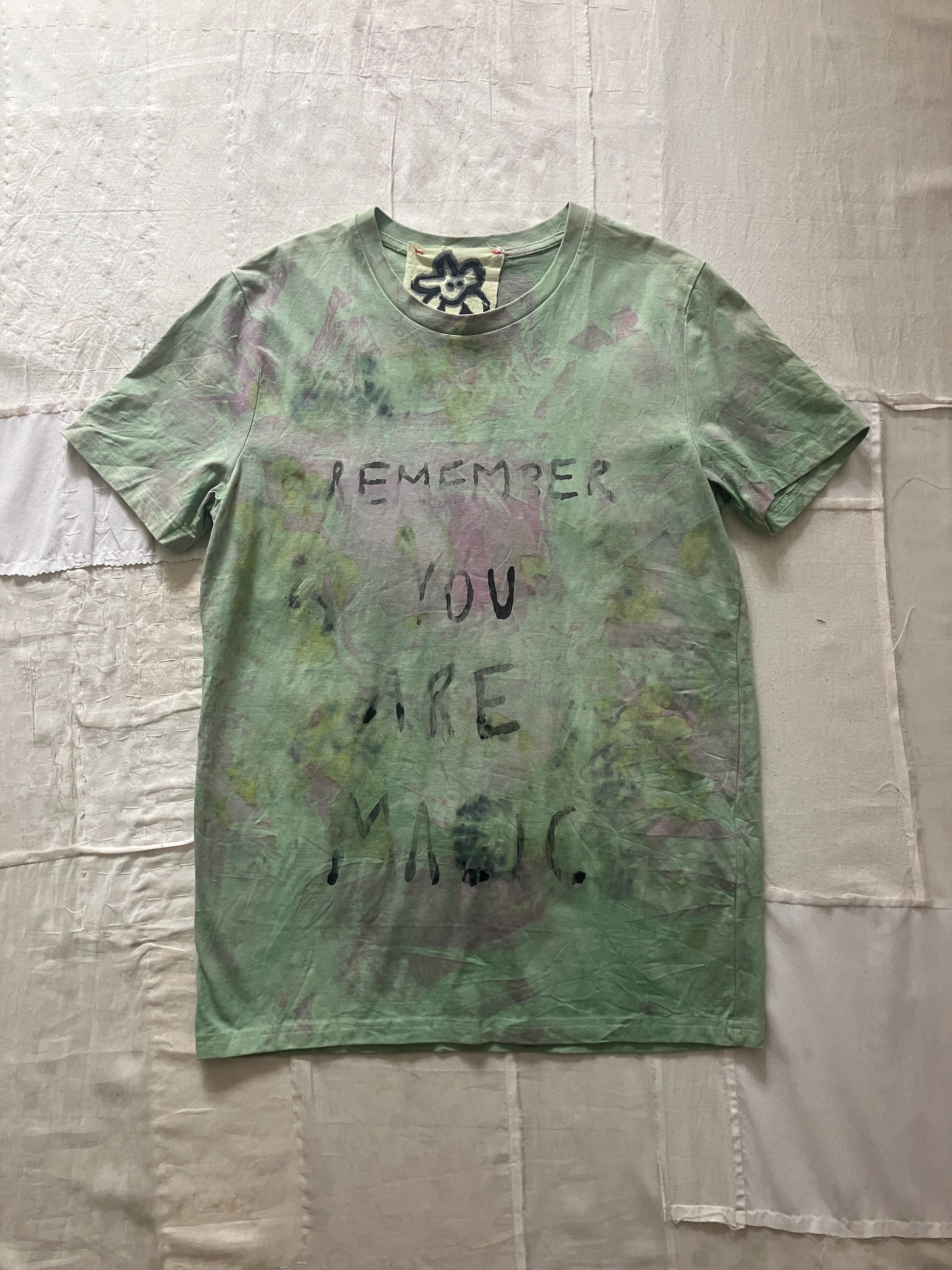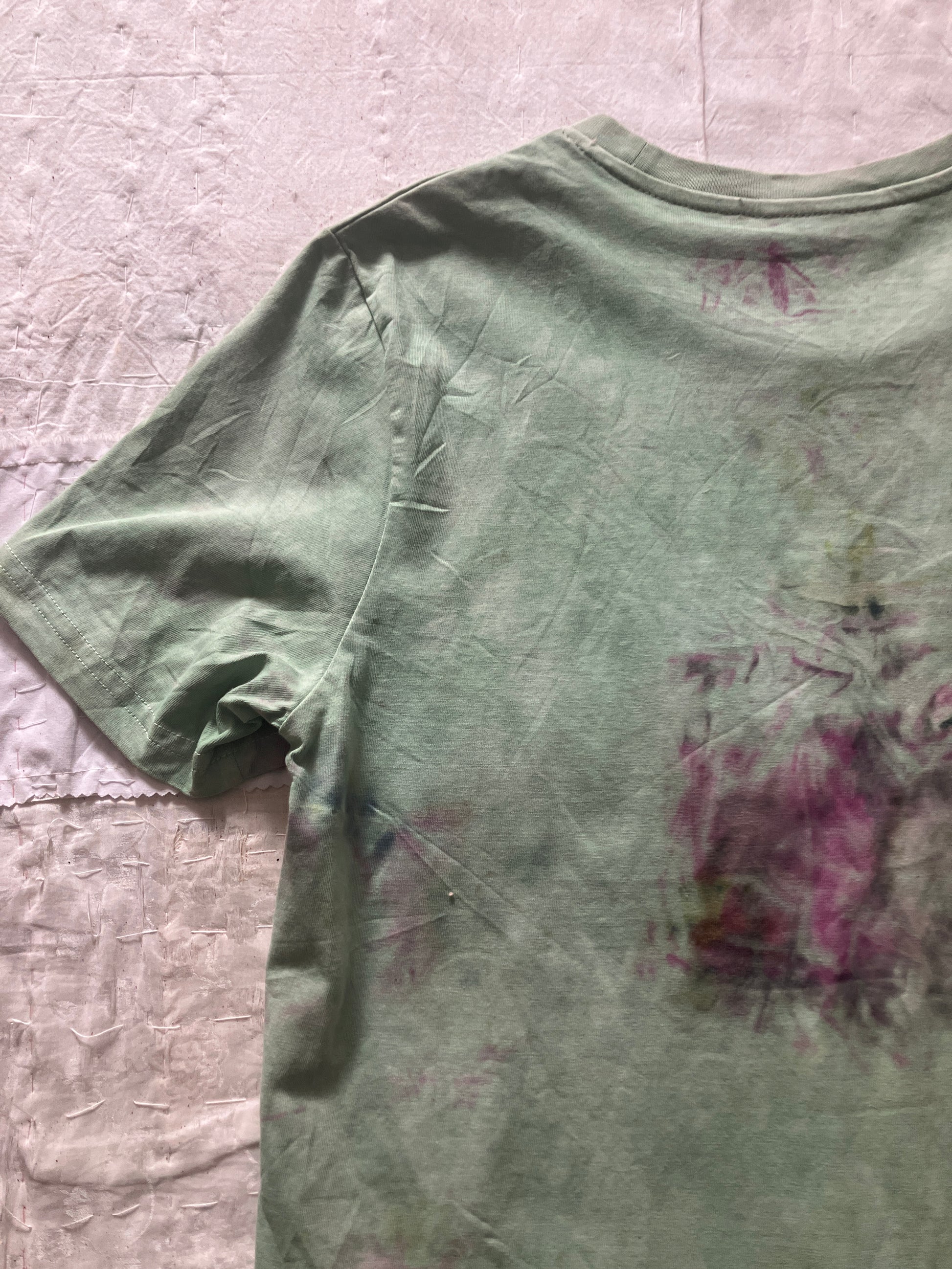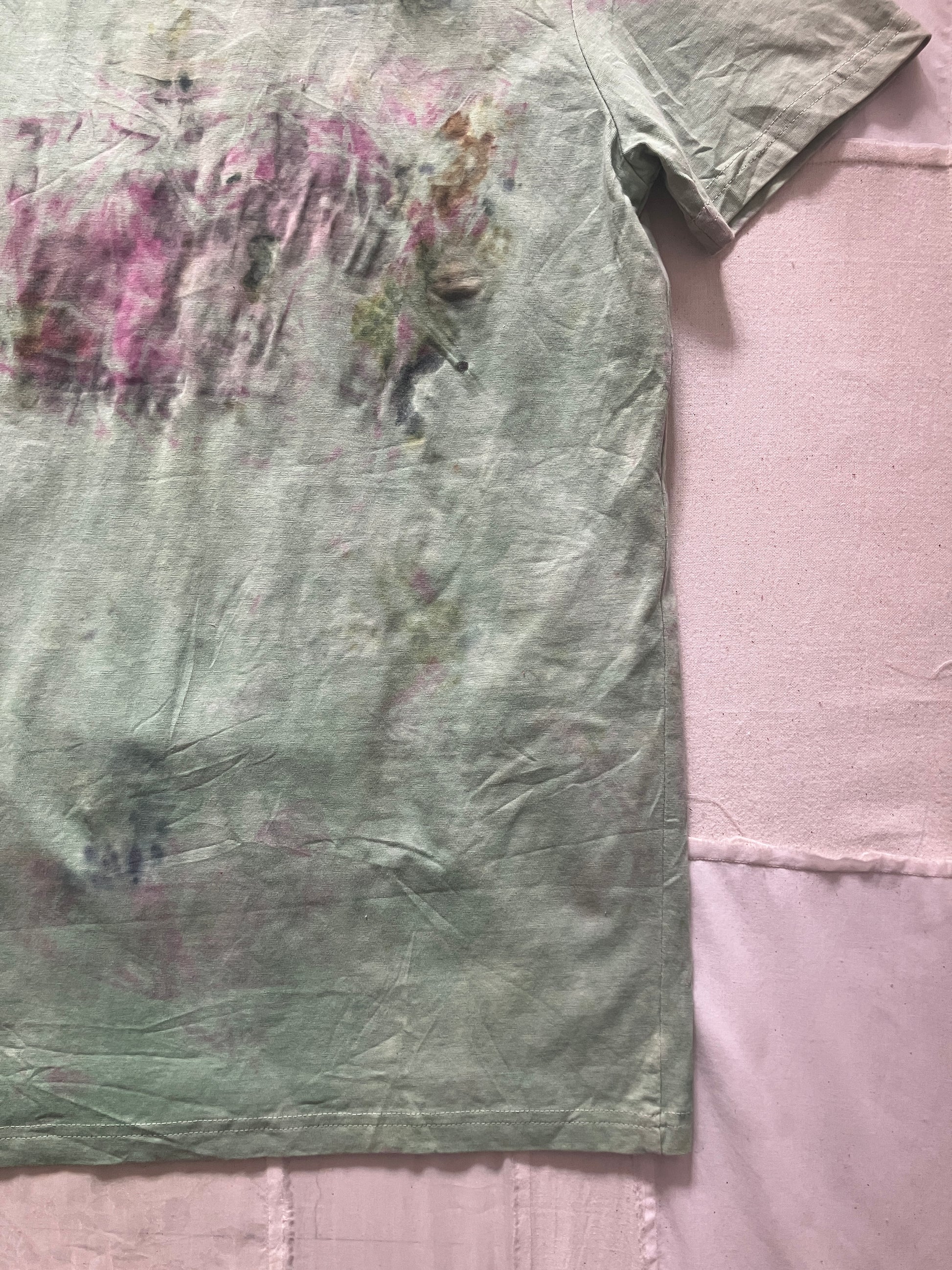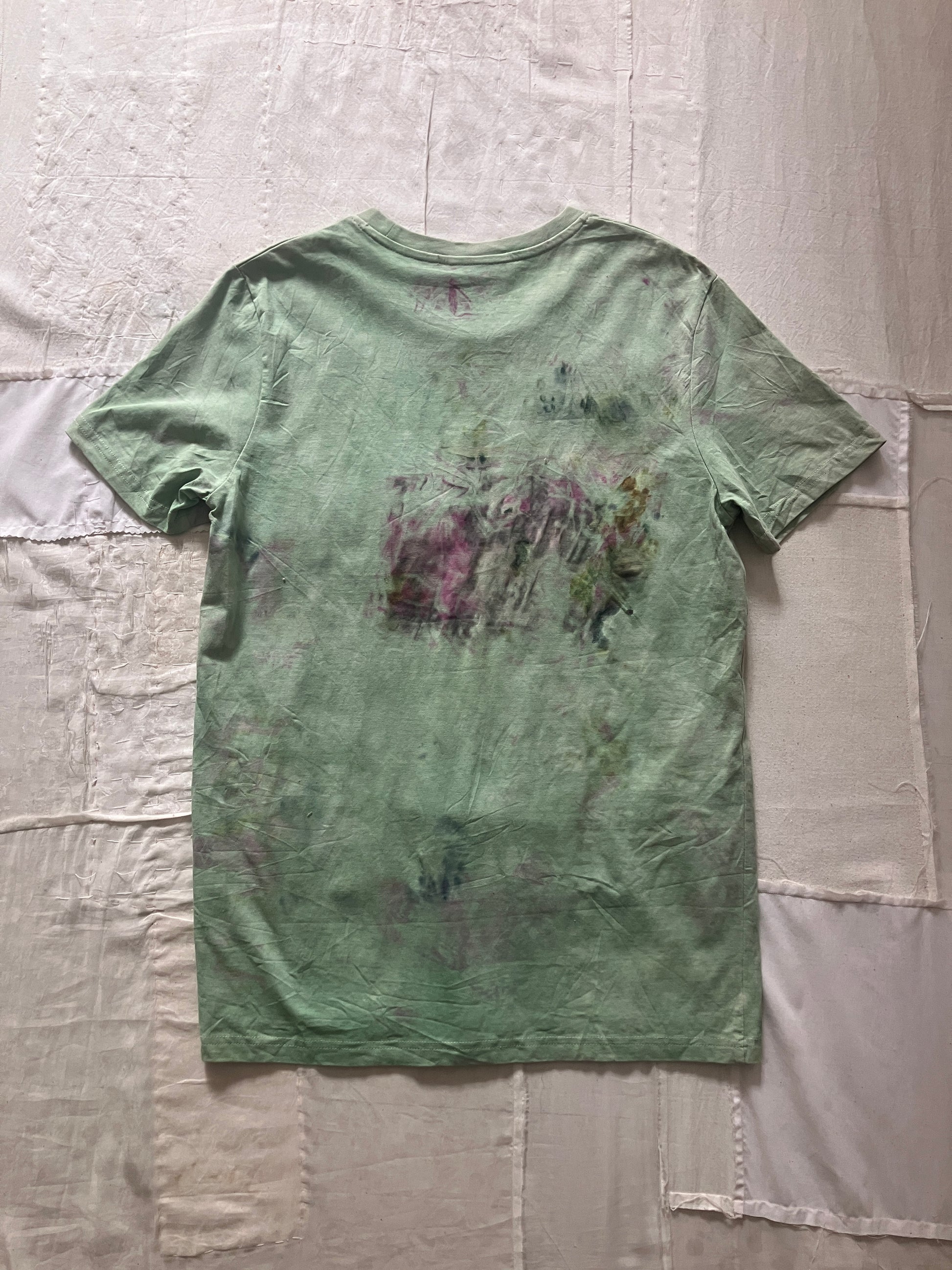 植物の皮やお花、雑草などを使って自作した天然顔料で染めたTシャツ。