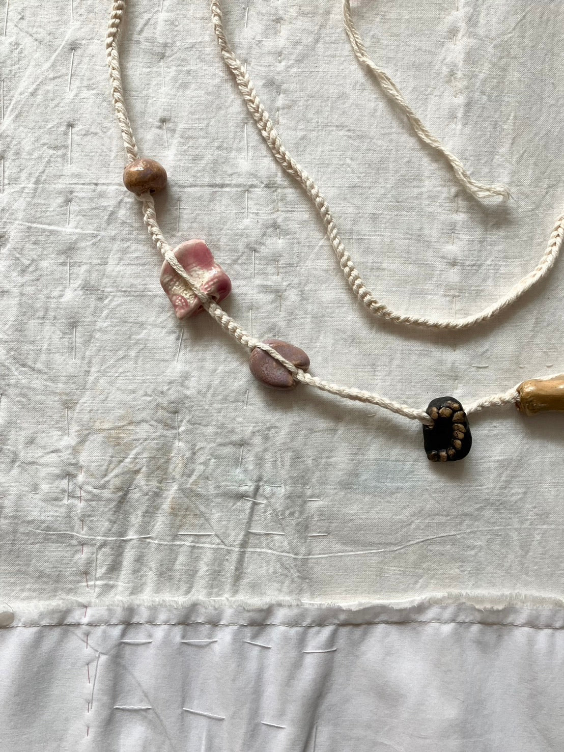 海の瞬間とその動きをイメージしたハンドメイドのセラミックをあしらった手編みベルト。