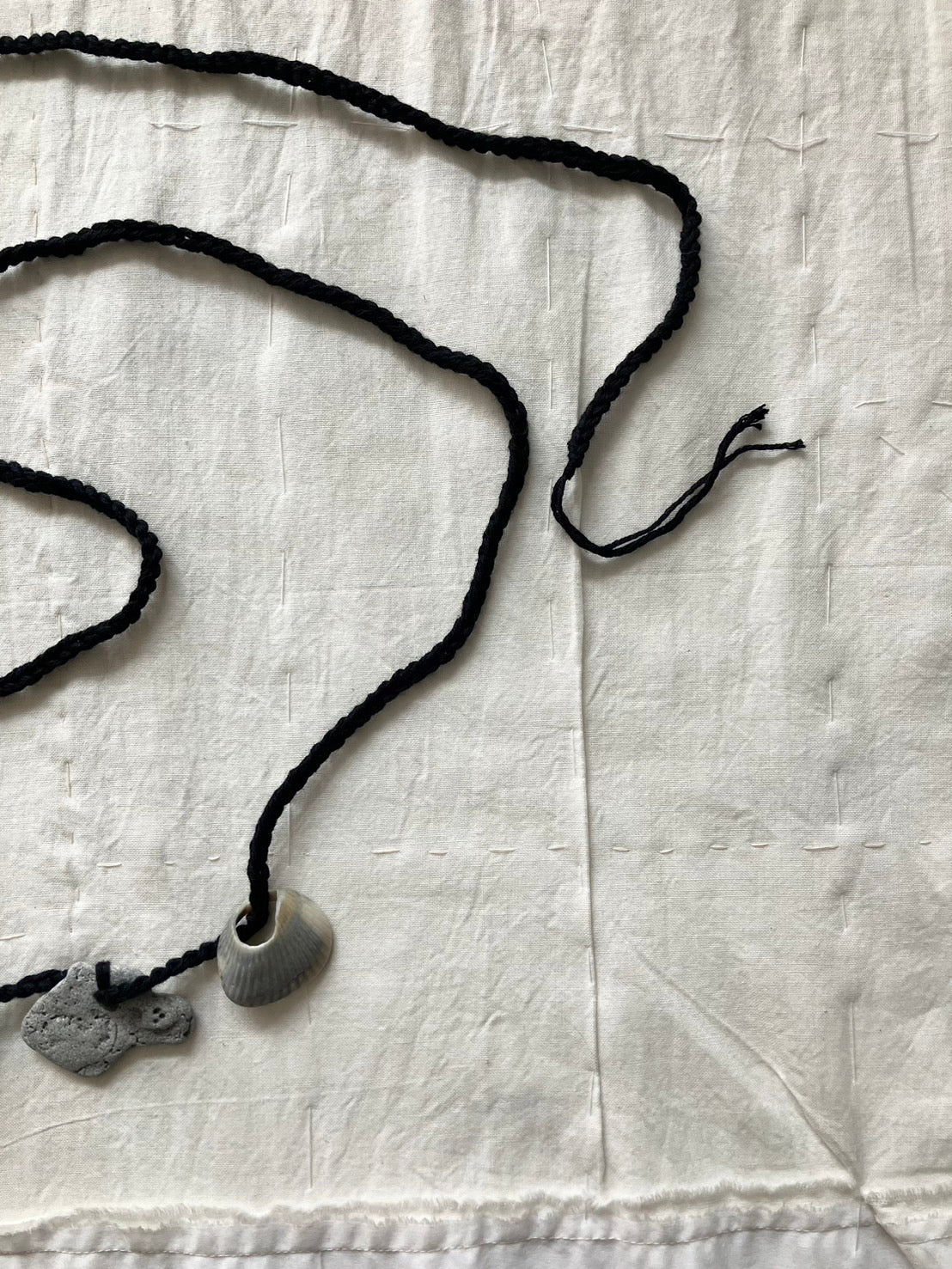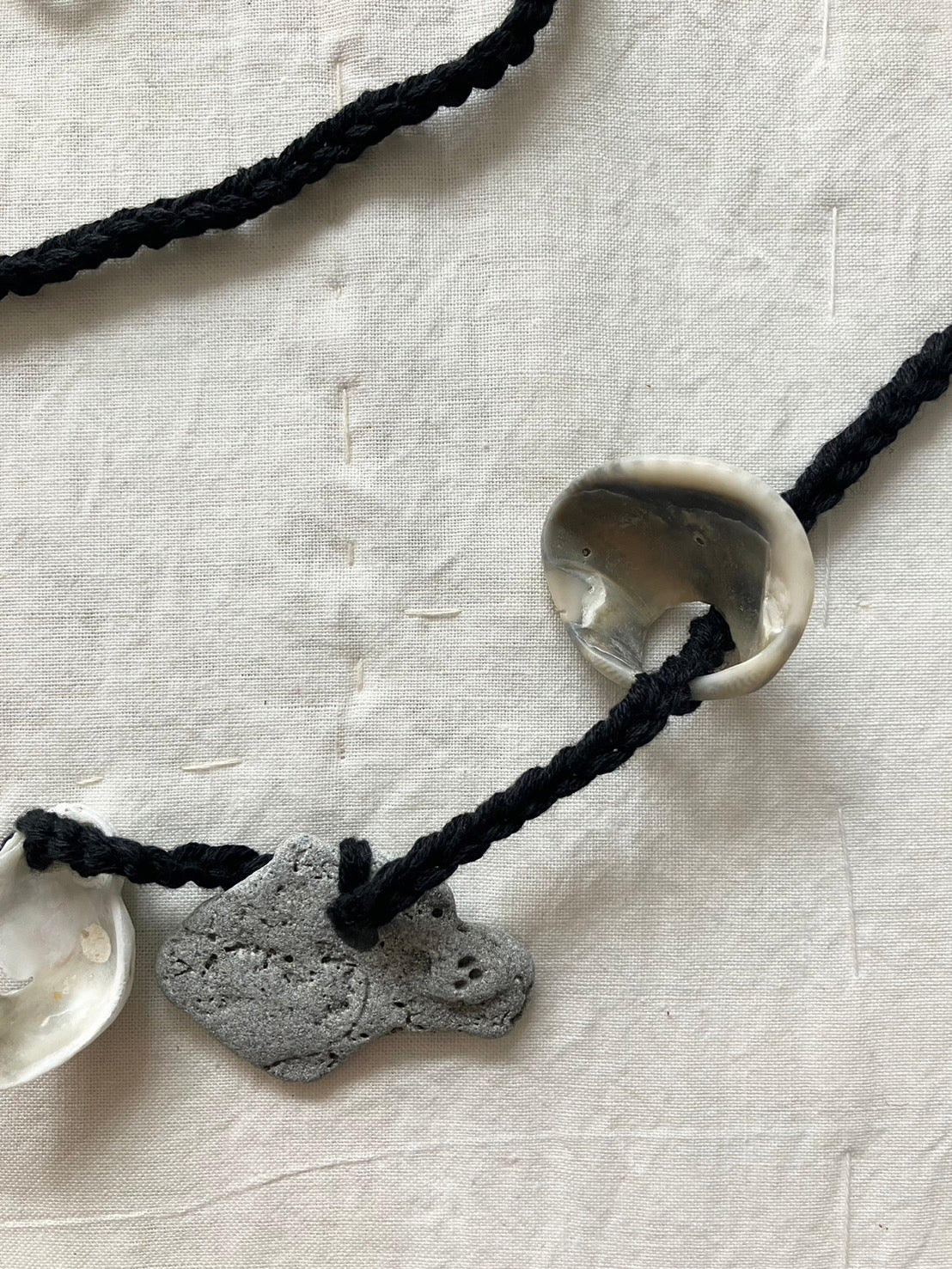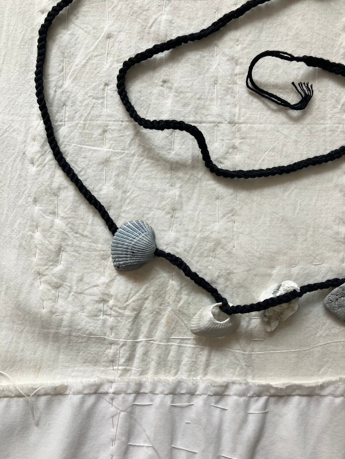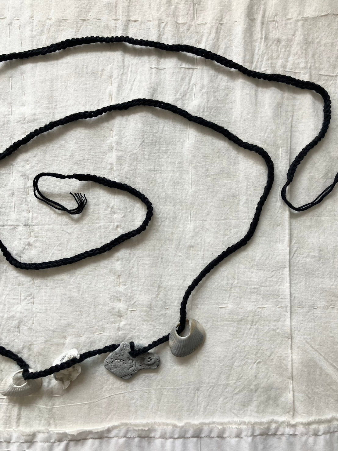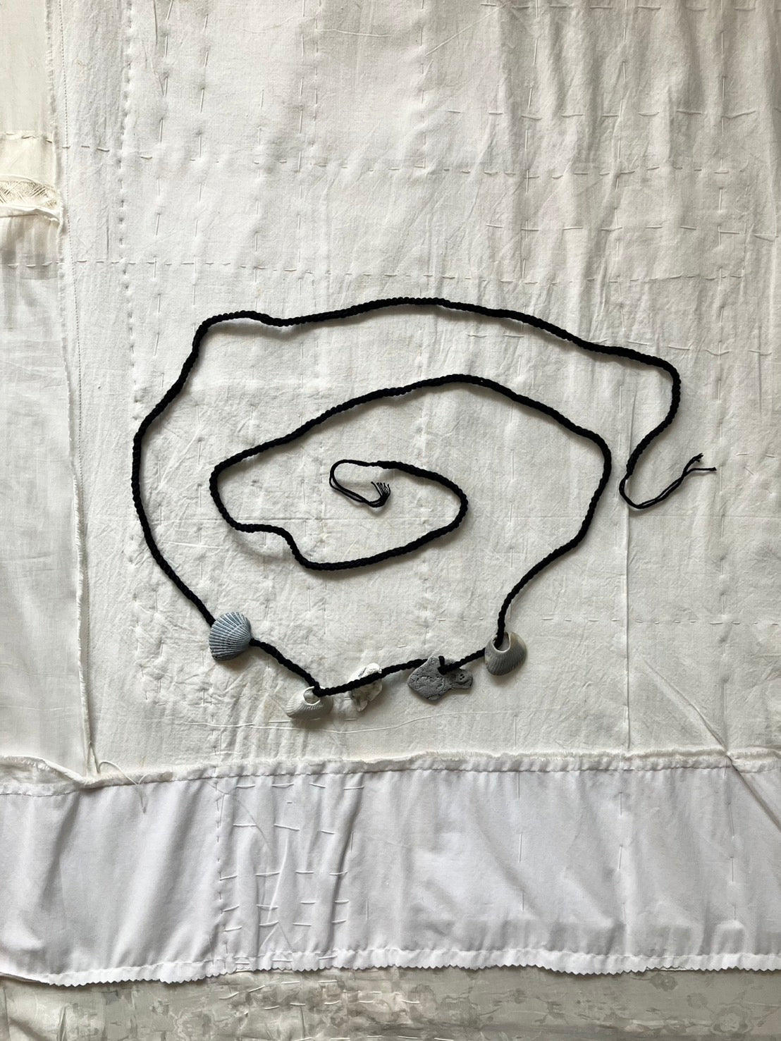 海の瞬間とその動きをイメージして本物のシェルをあしらった、手編みベルト。