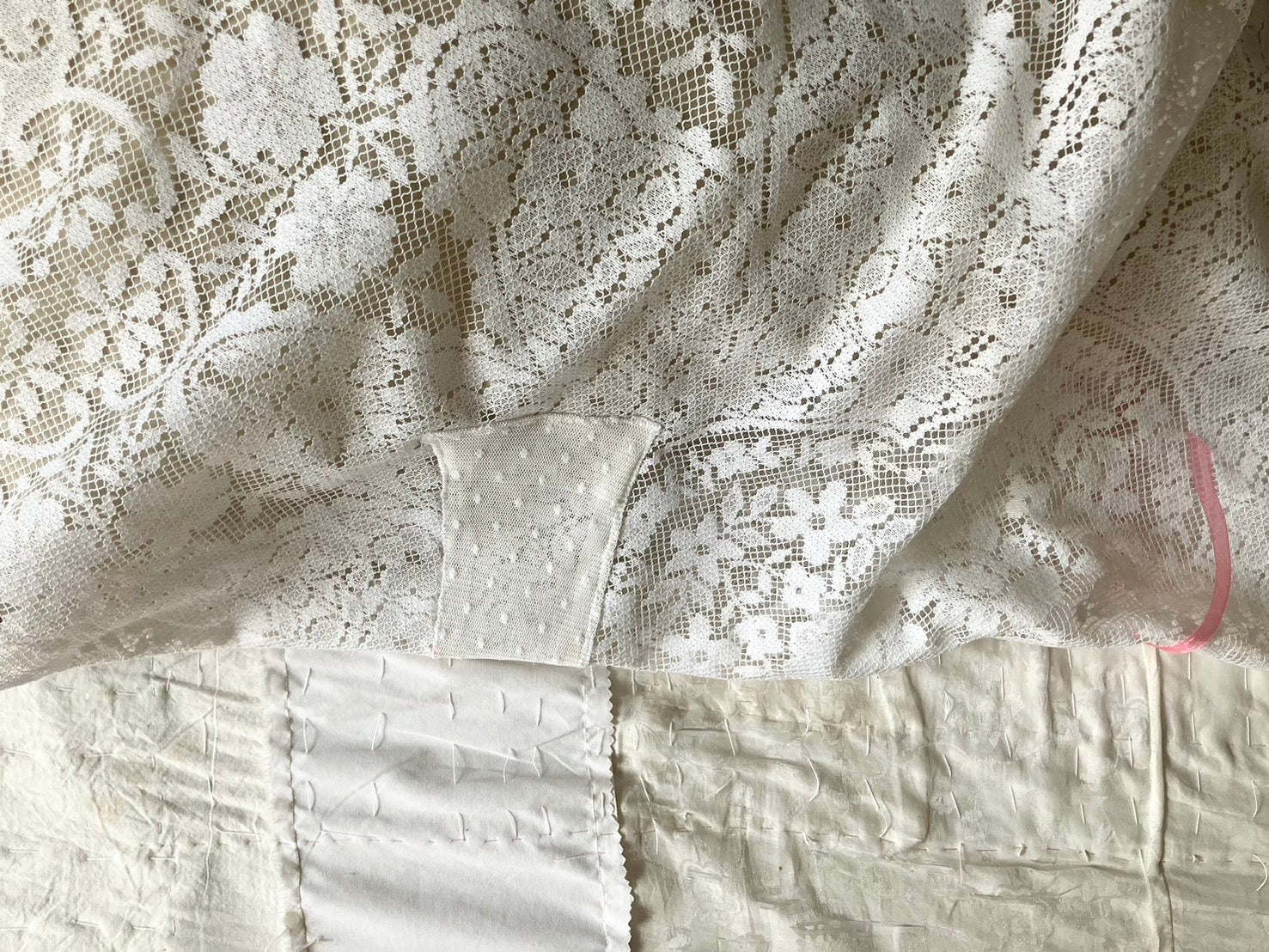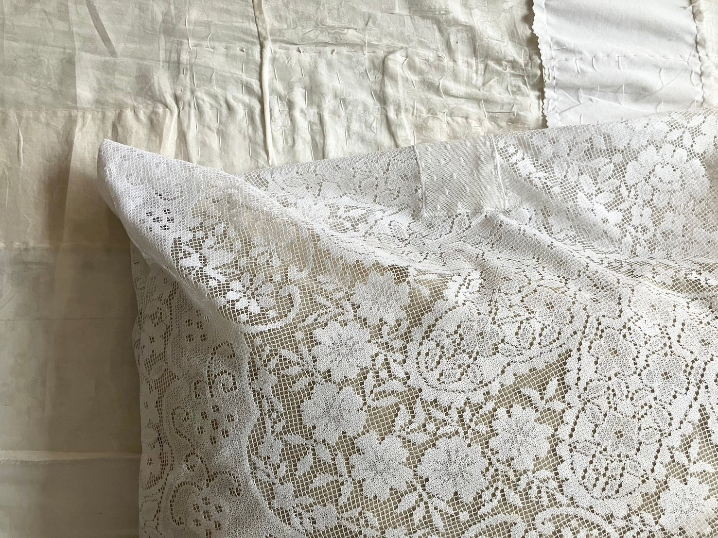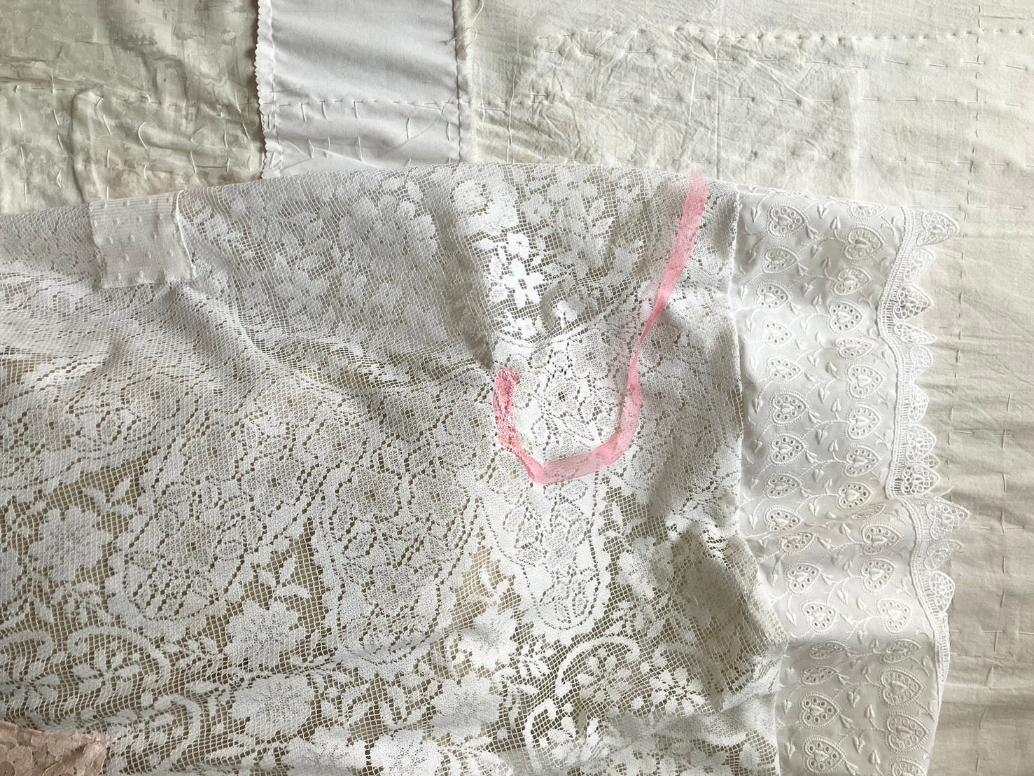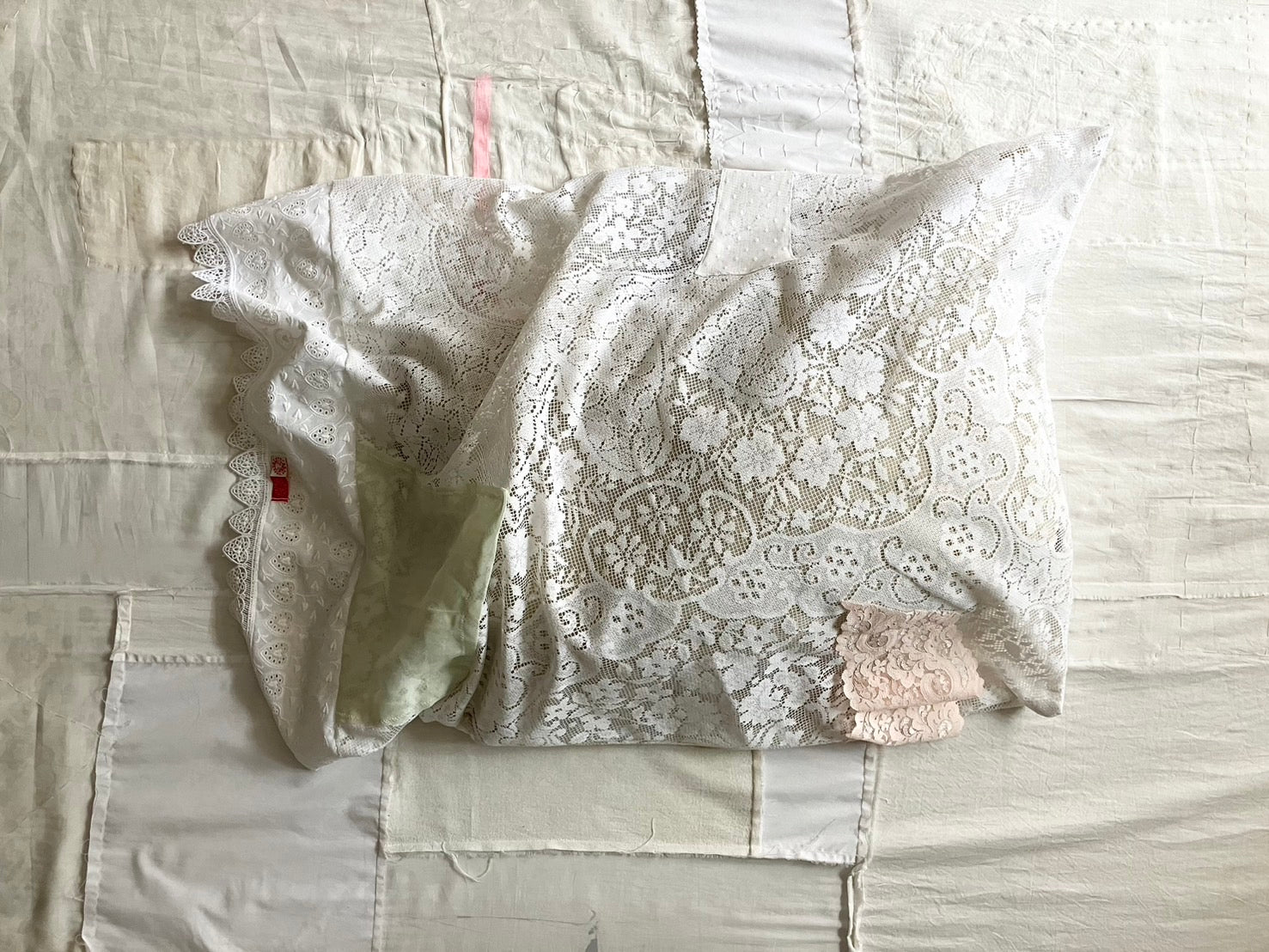 everyone's motherのアイテムが制作される際に生まれた、布の切れ端やリボンの欠片など、残布を使って作られたクッションカバー。残布の偶然の形がそのままデザインとして生かされていて、とっても愛らしい表情です。