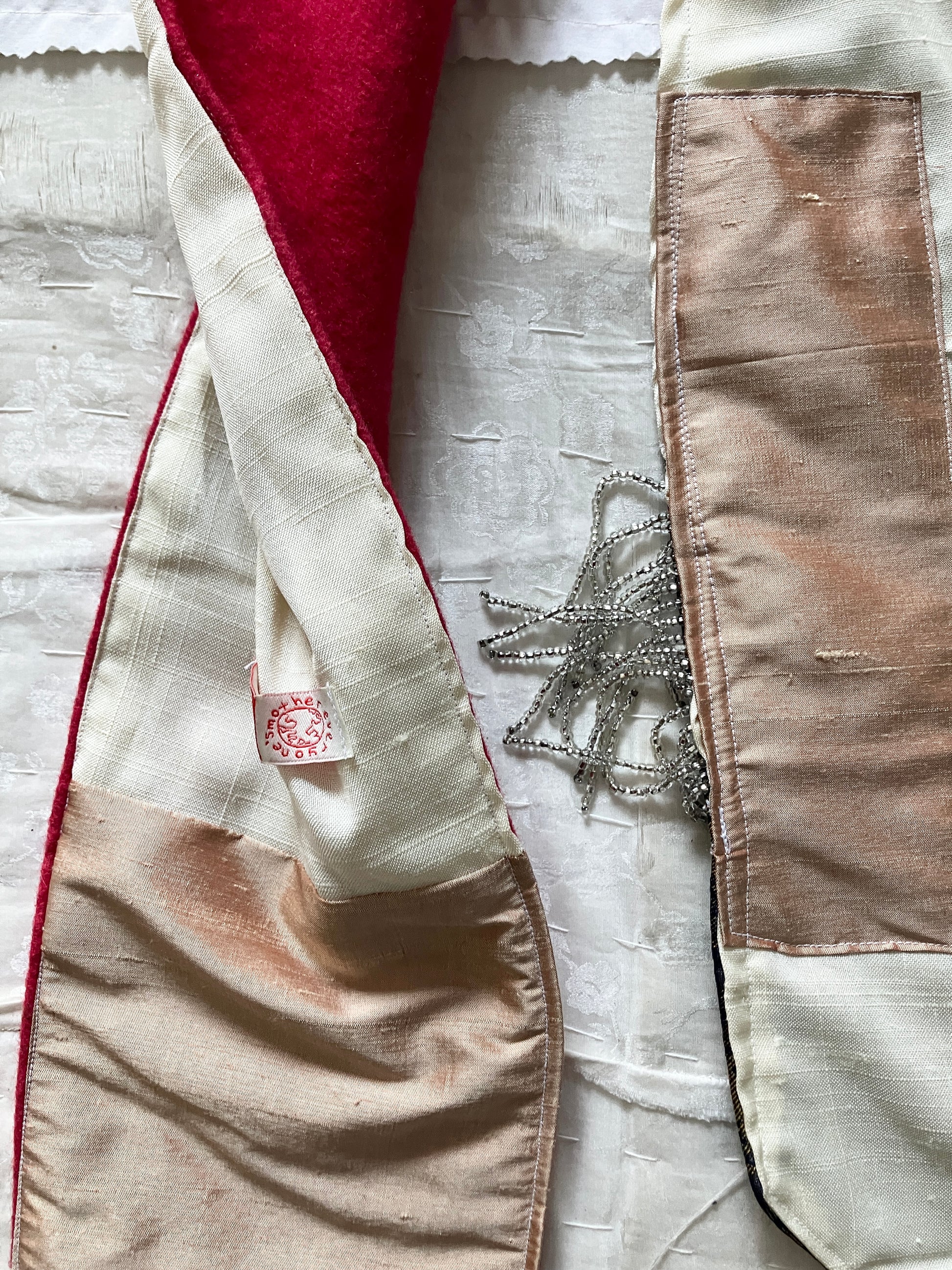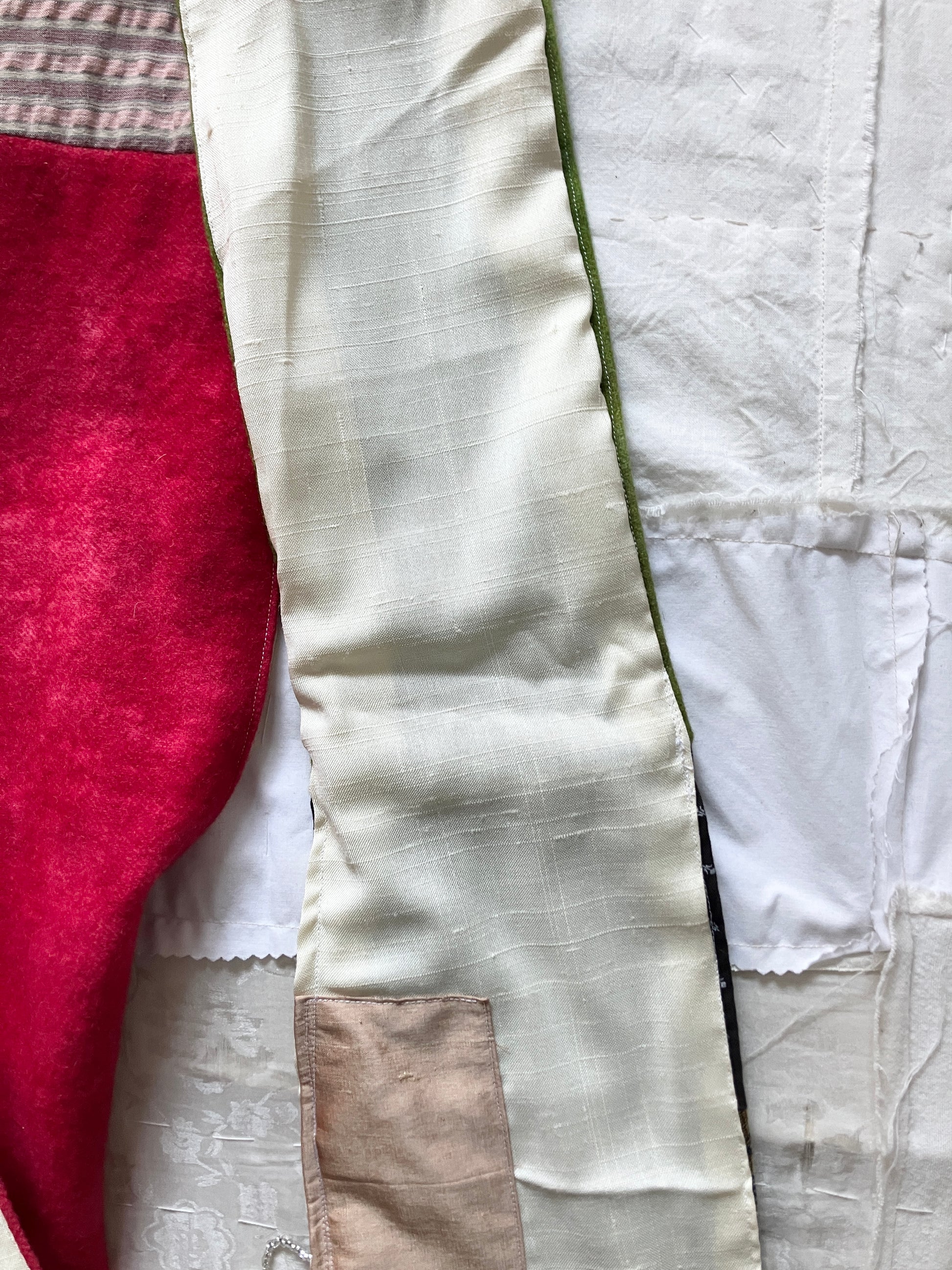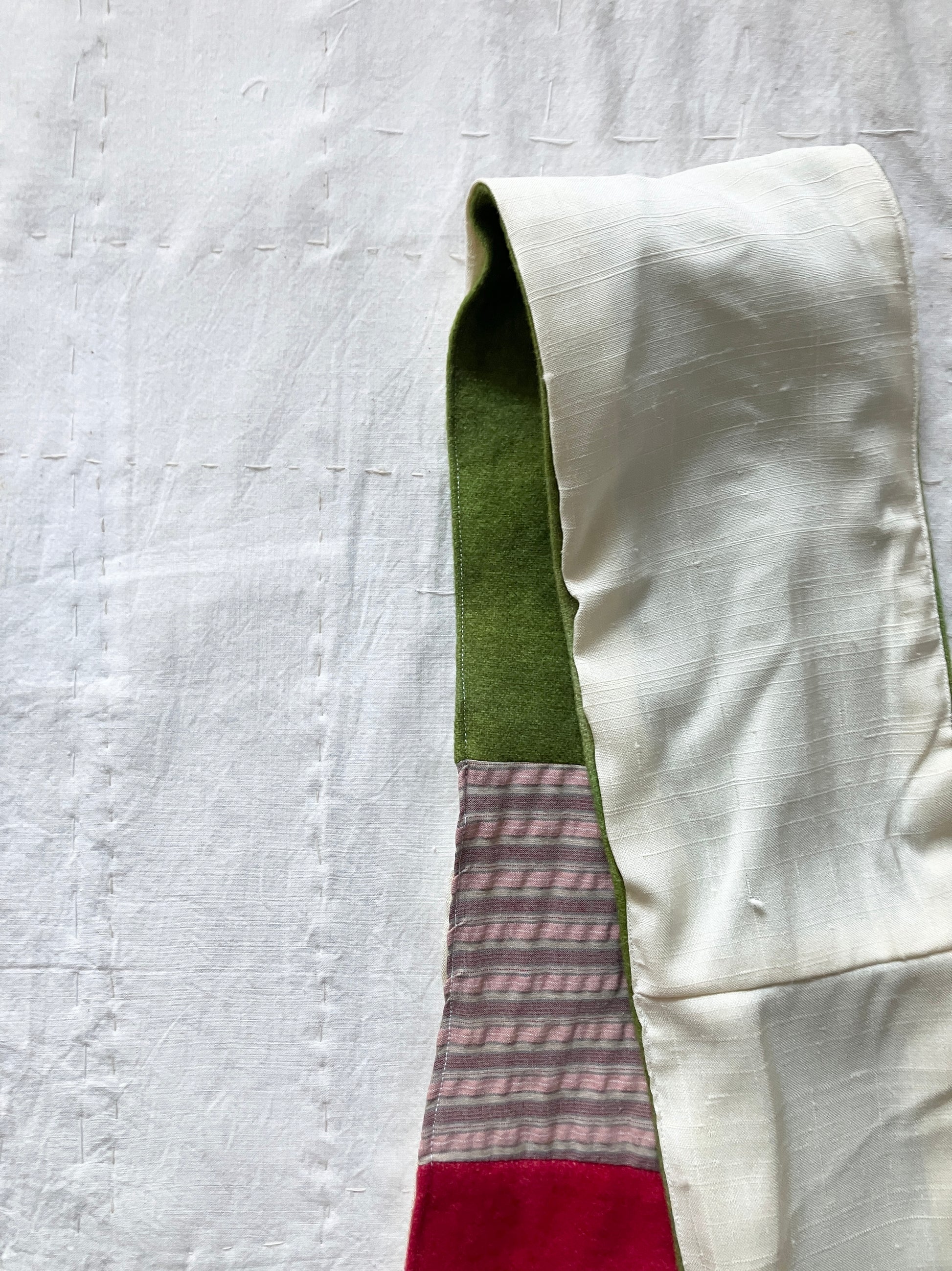 デッドストックやセカンドハンド、残布など、どこかで一度眠っていた素材たちに光をあて、自由にパッチワークされて手作りされた一点もののスカーフ。