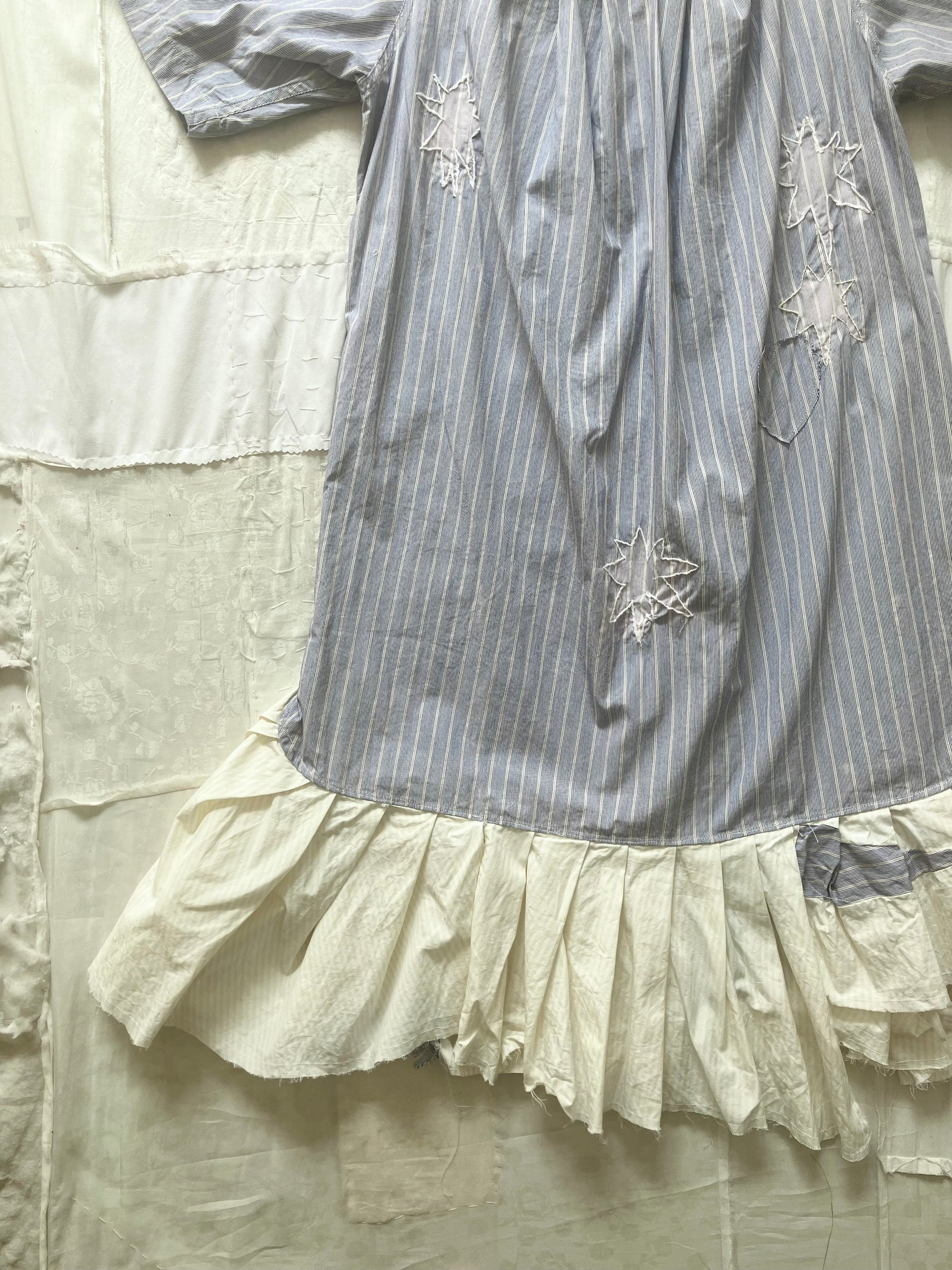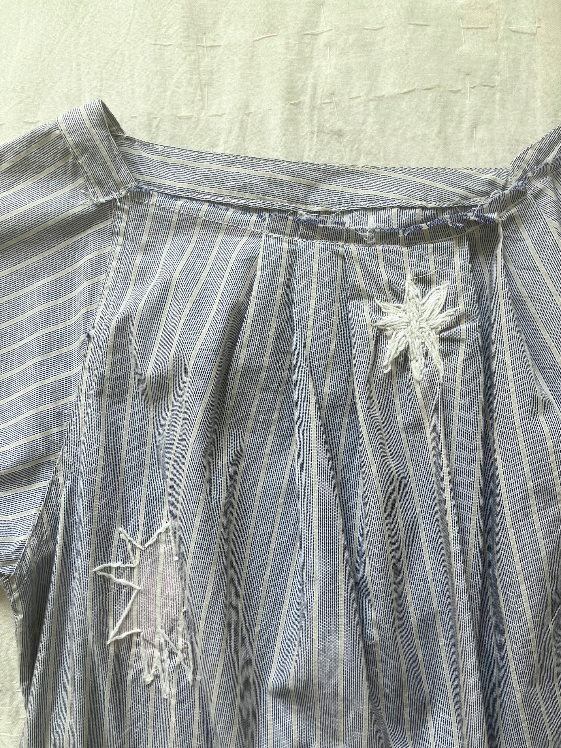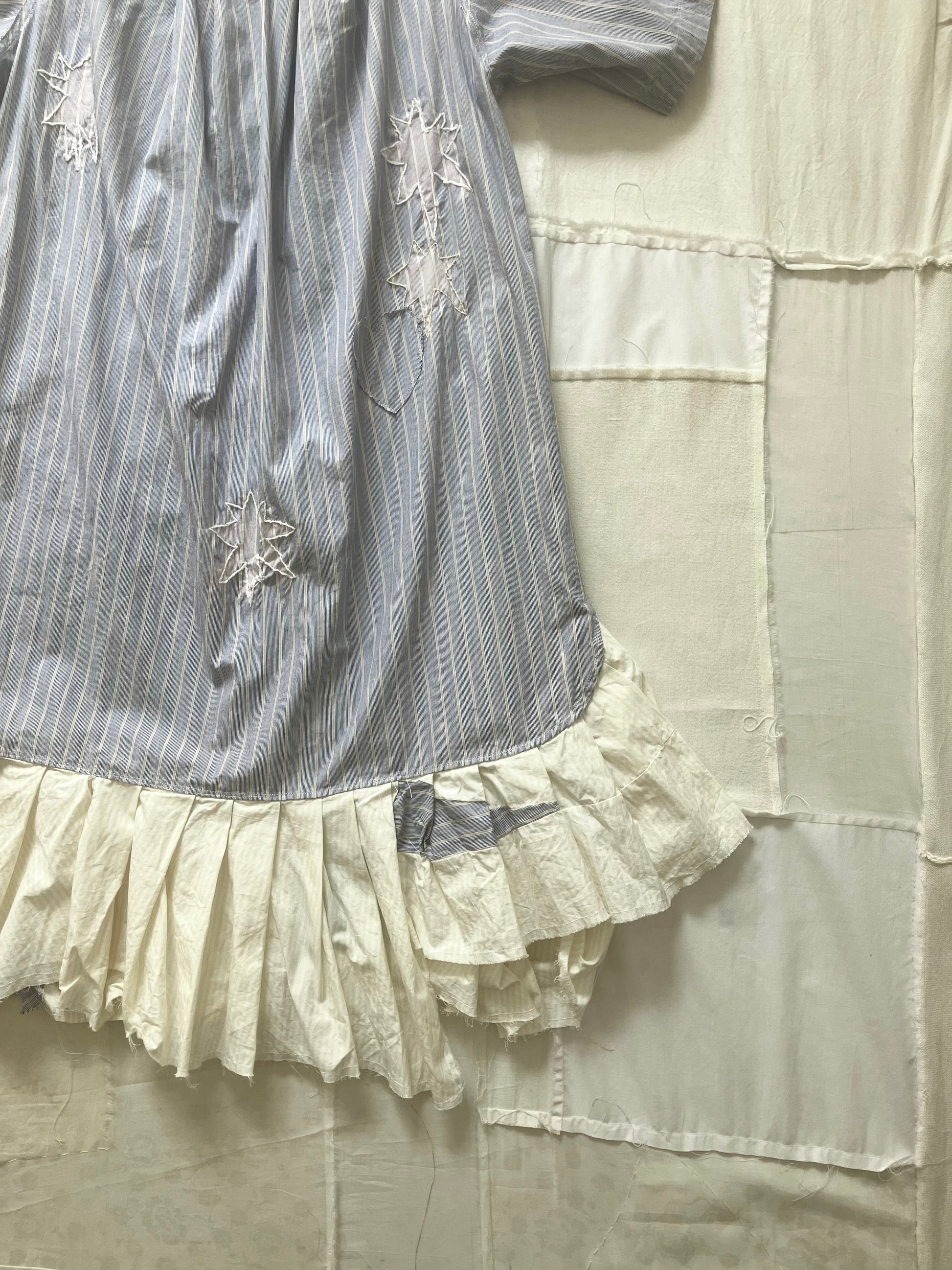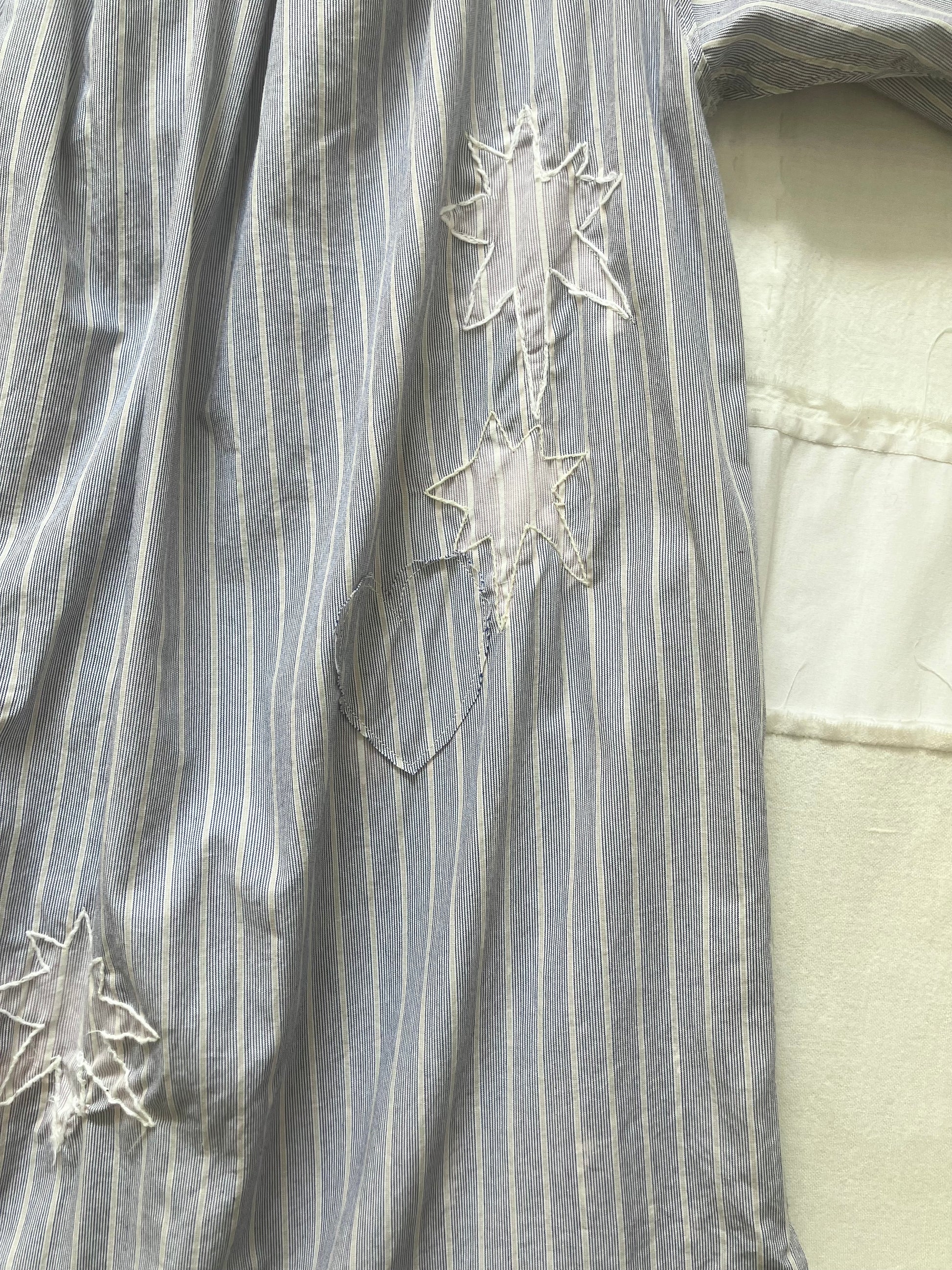 片面の胸元には大きなハートのパッチワークが、もう片面には、全体にかけて南十字座を象った刺繍やブリーチによる装飾がついています。ペールブルーと白のストライプ模様で、すっきりとしたカラーリングです。