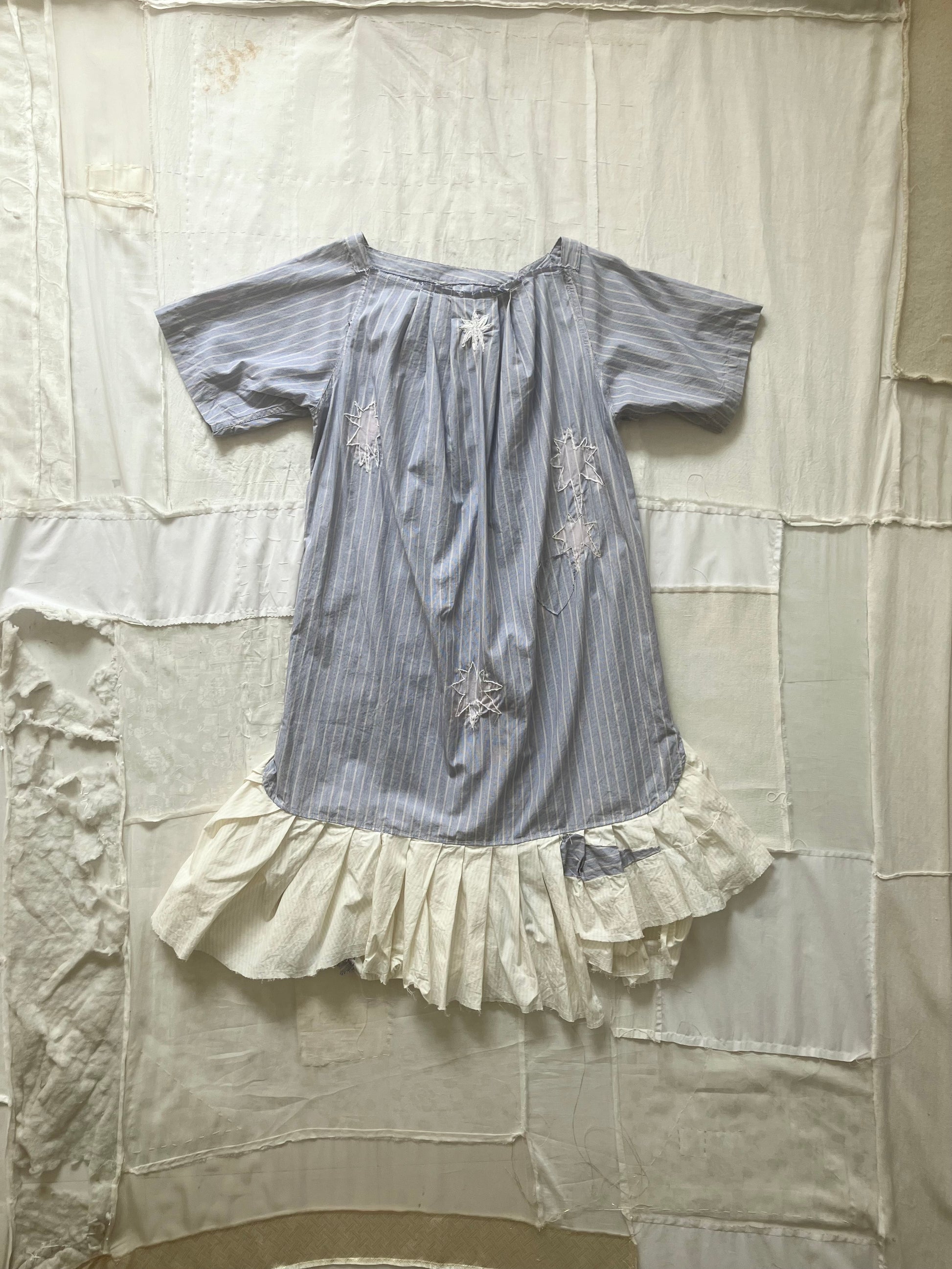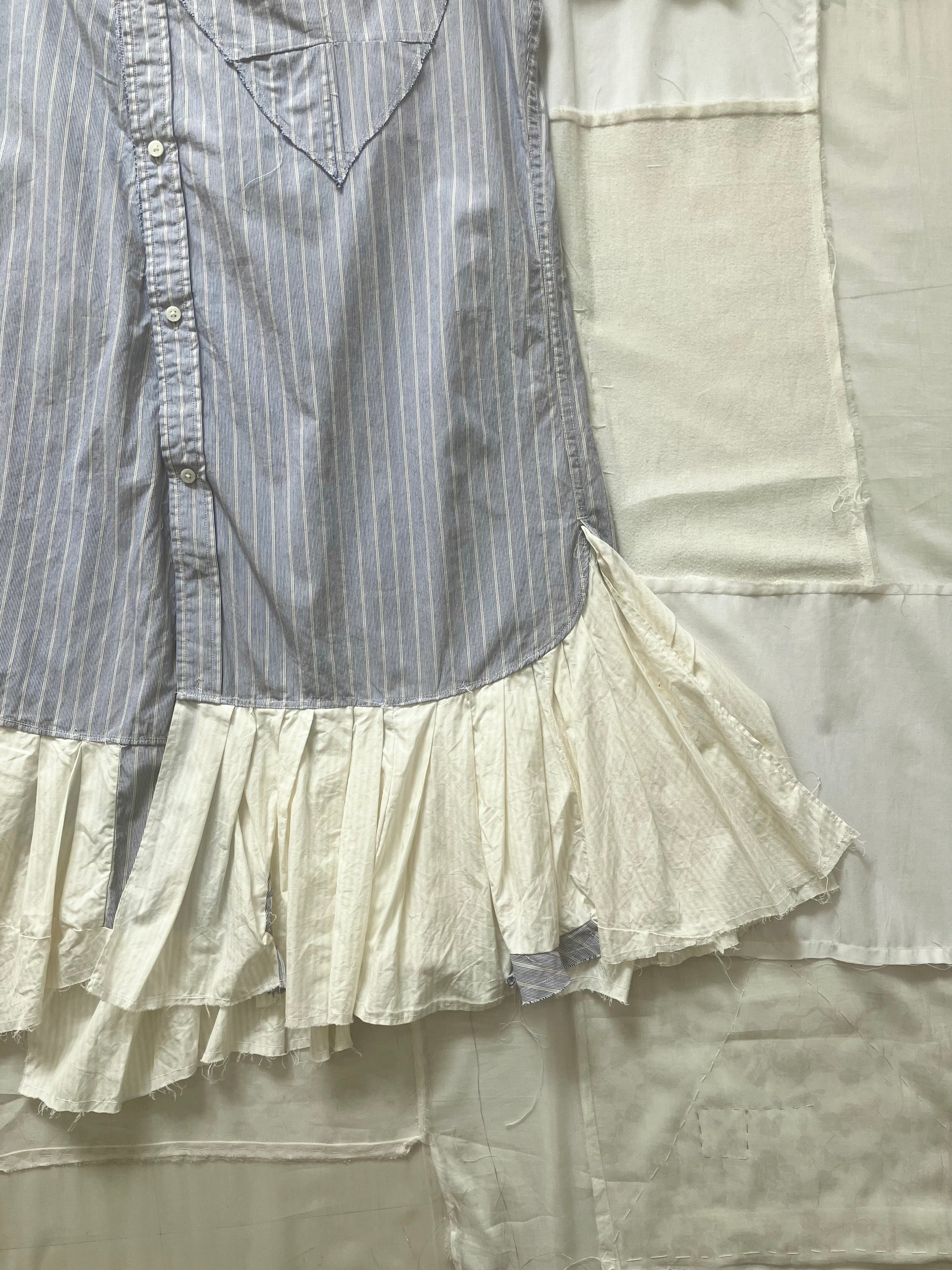 古着シャツなどの生地をアップサイクルした、手作りのドレス。