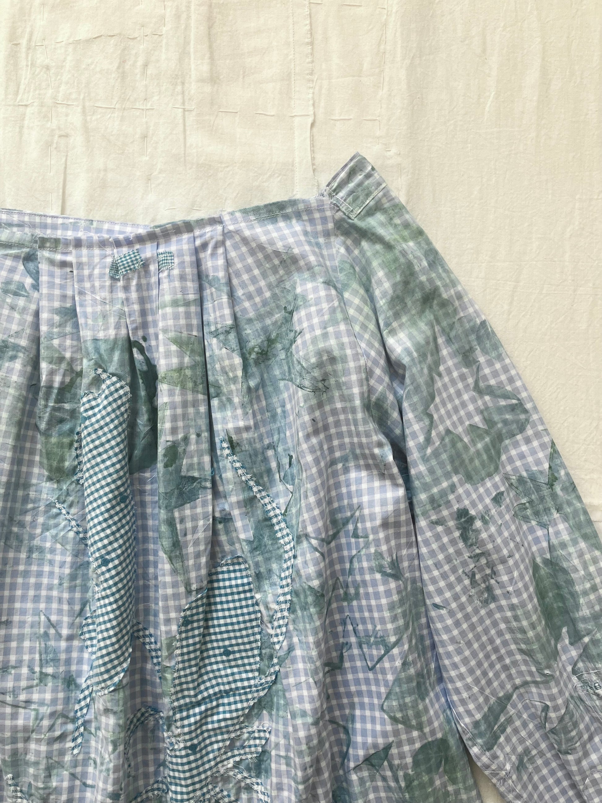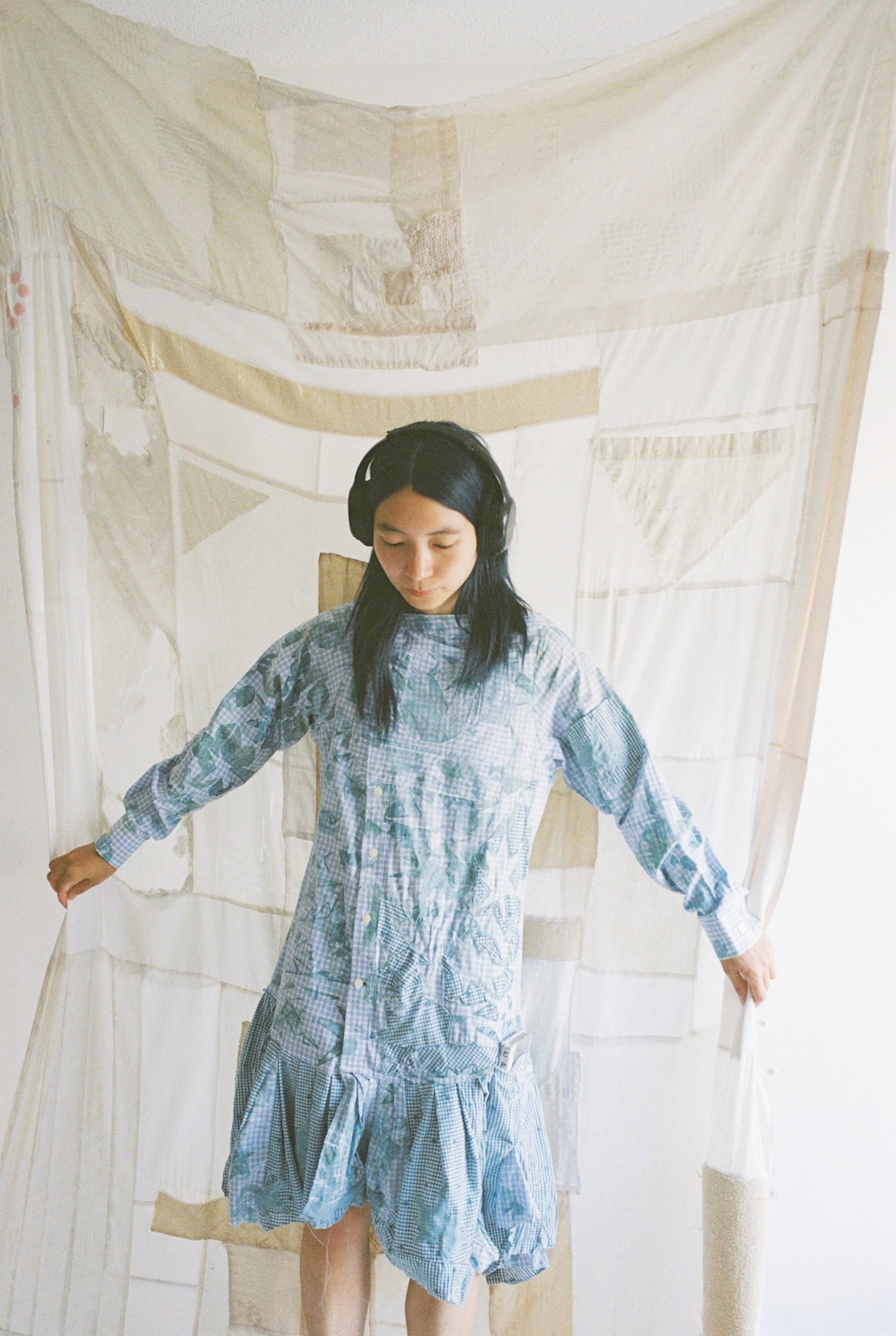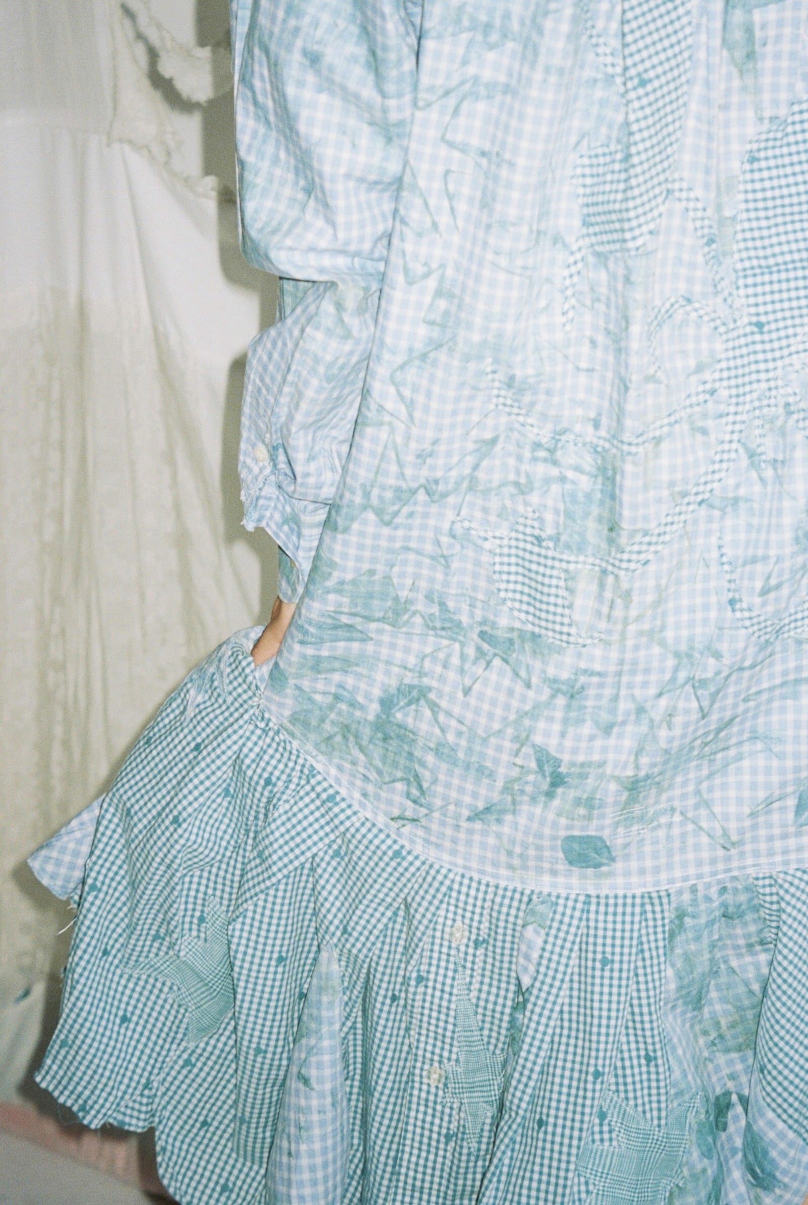 古着シャツなどの生地をアップサイクルした、手作りのドレス。