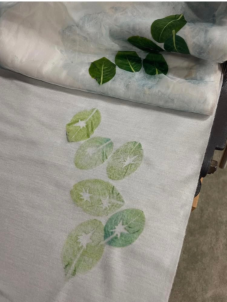 生葉染めでは、葉っぱと布を直接プレスし、葉っぱの中にあるインディゴ以外の物質をそのまま全て付着させています。