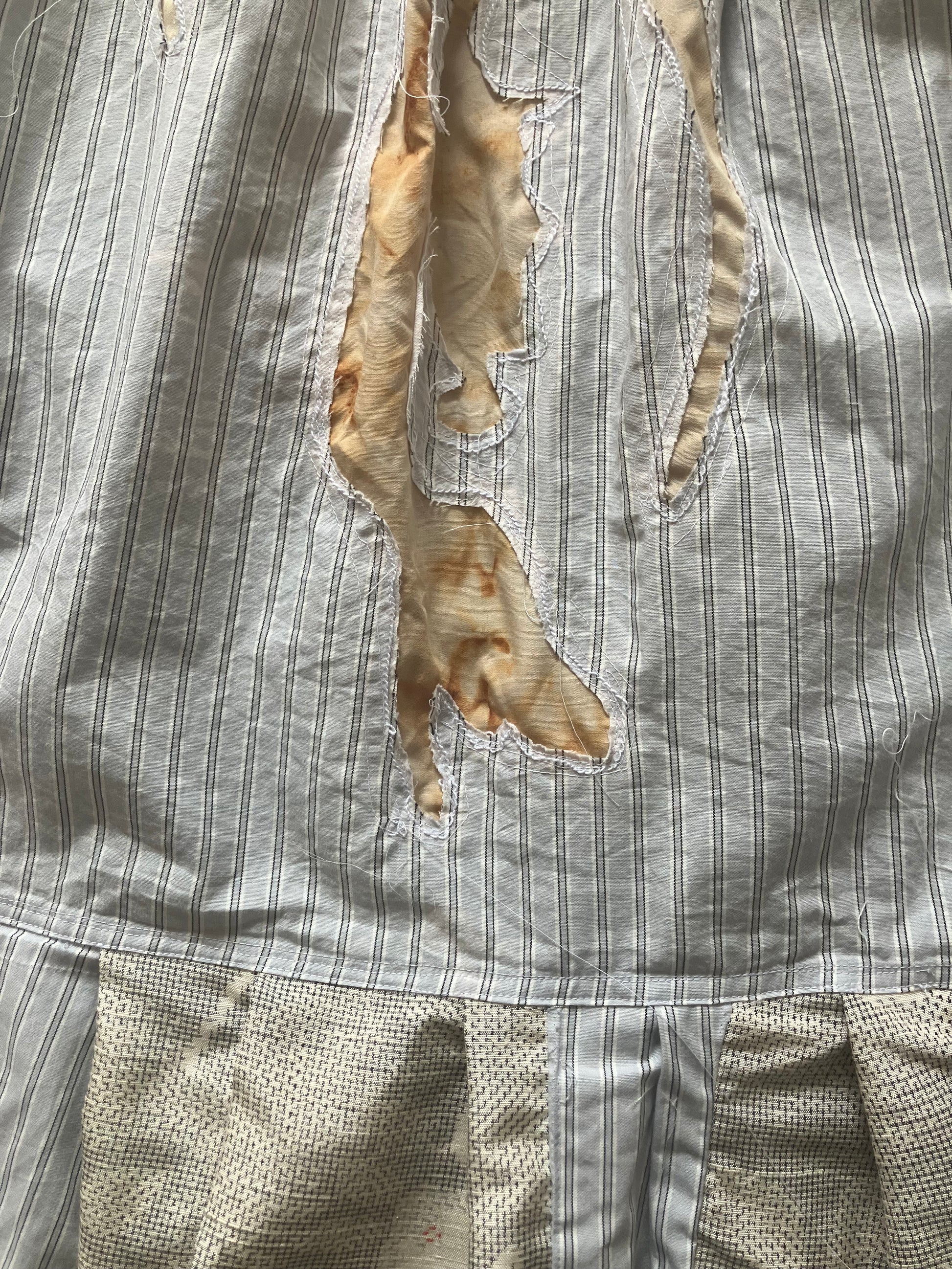 生地についていたシミの形に沿ってつけられた小さなパッチワークや、様々な生地の組み合わせがにぎやかなデザイン。錆染めを施した生地も使われていて、生地のペールブルーと錆のオレンジの色合わせもとってもキュートです。