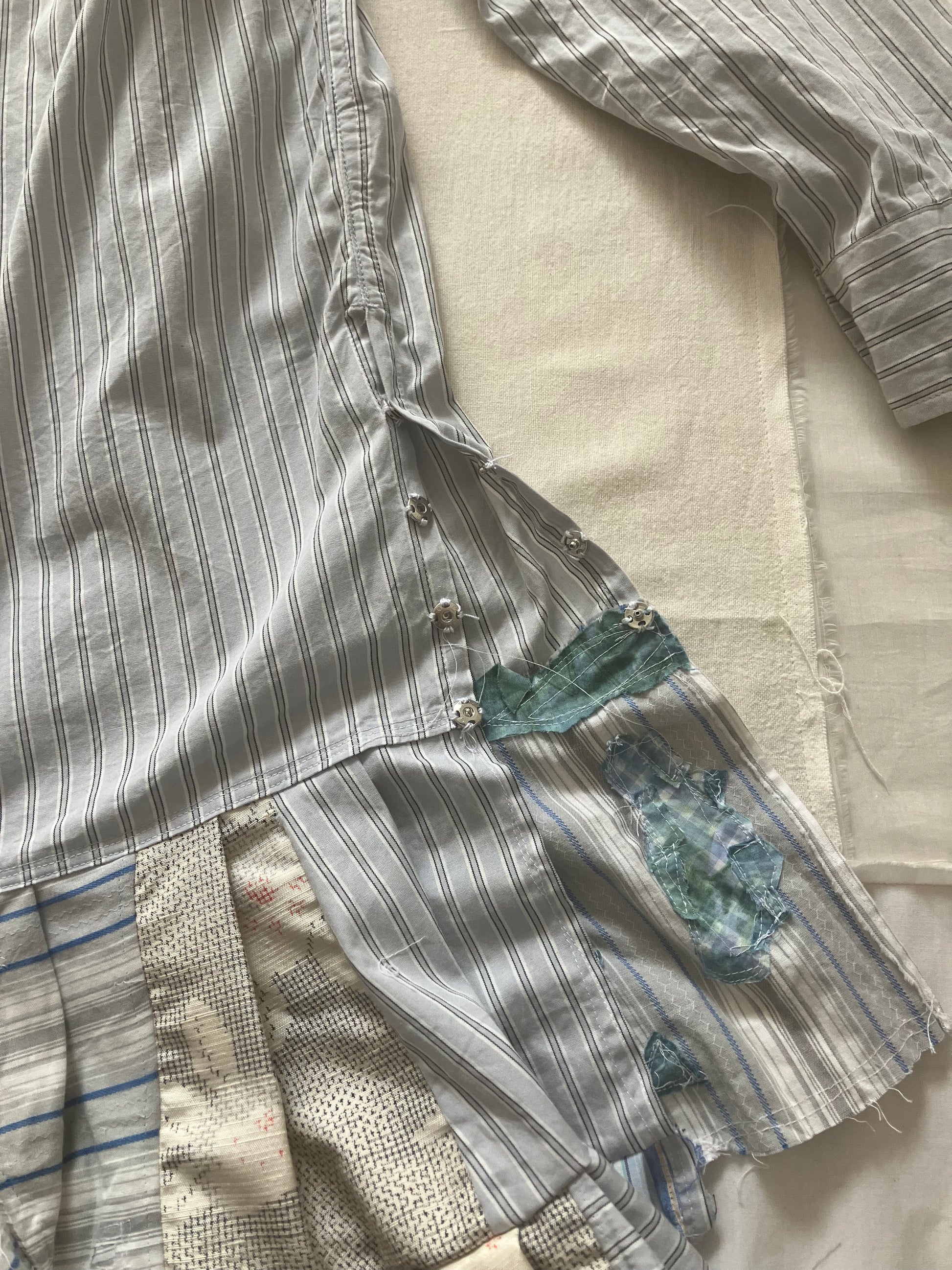 古着シャツなどの生地をアップサイクルした、手作りのドレス。