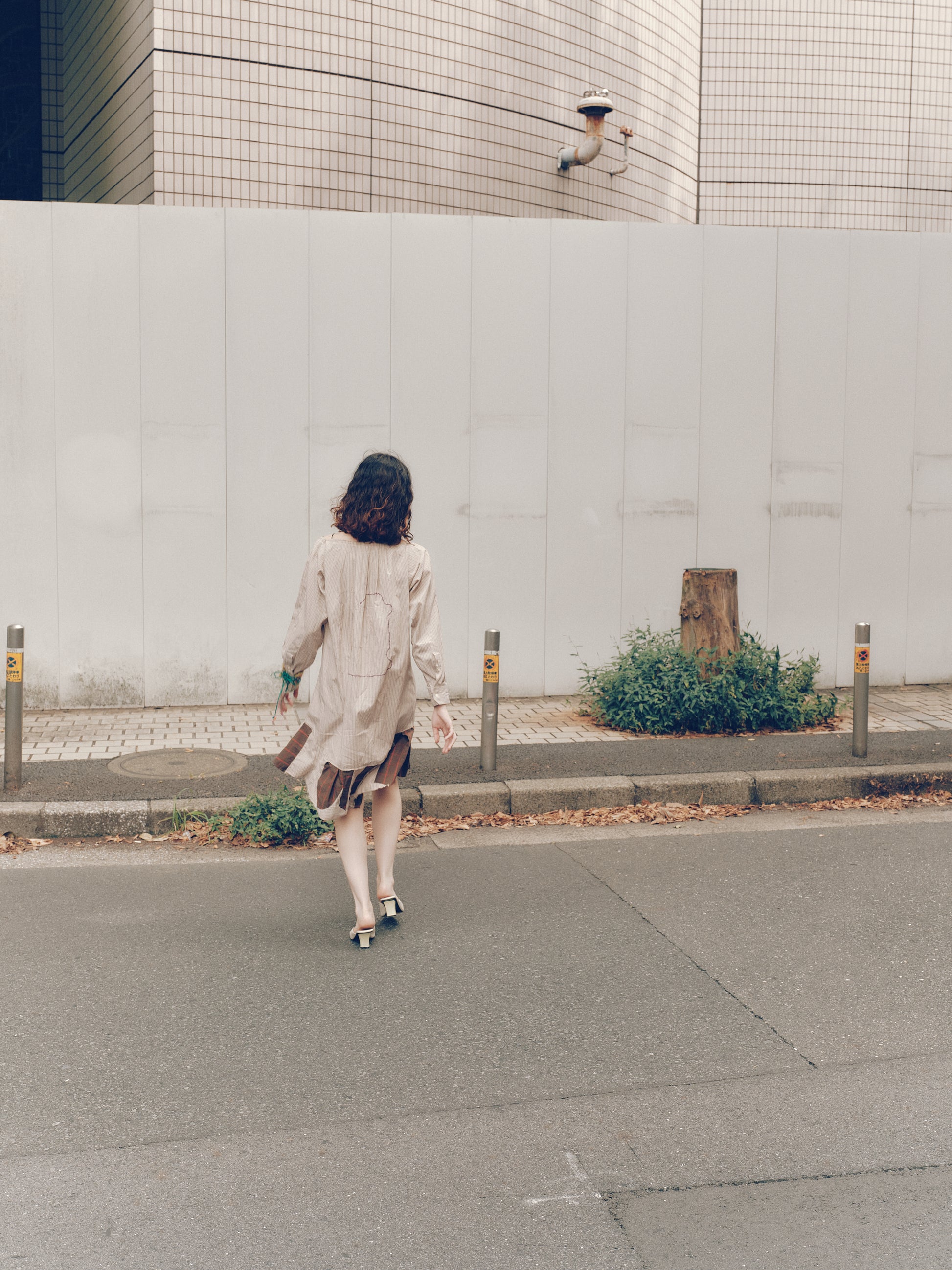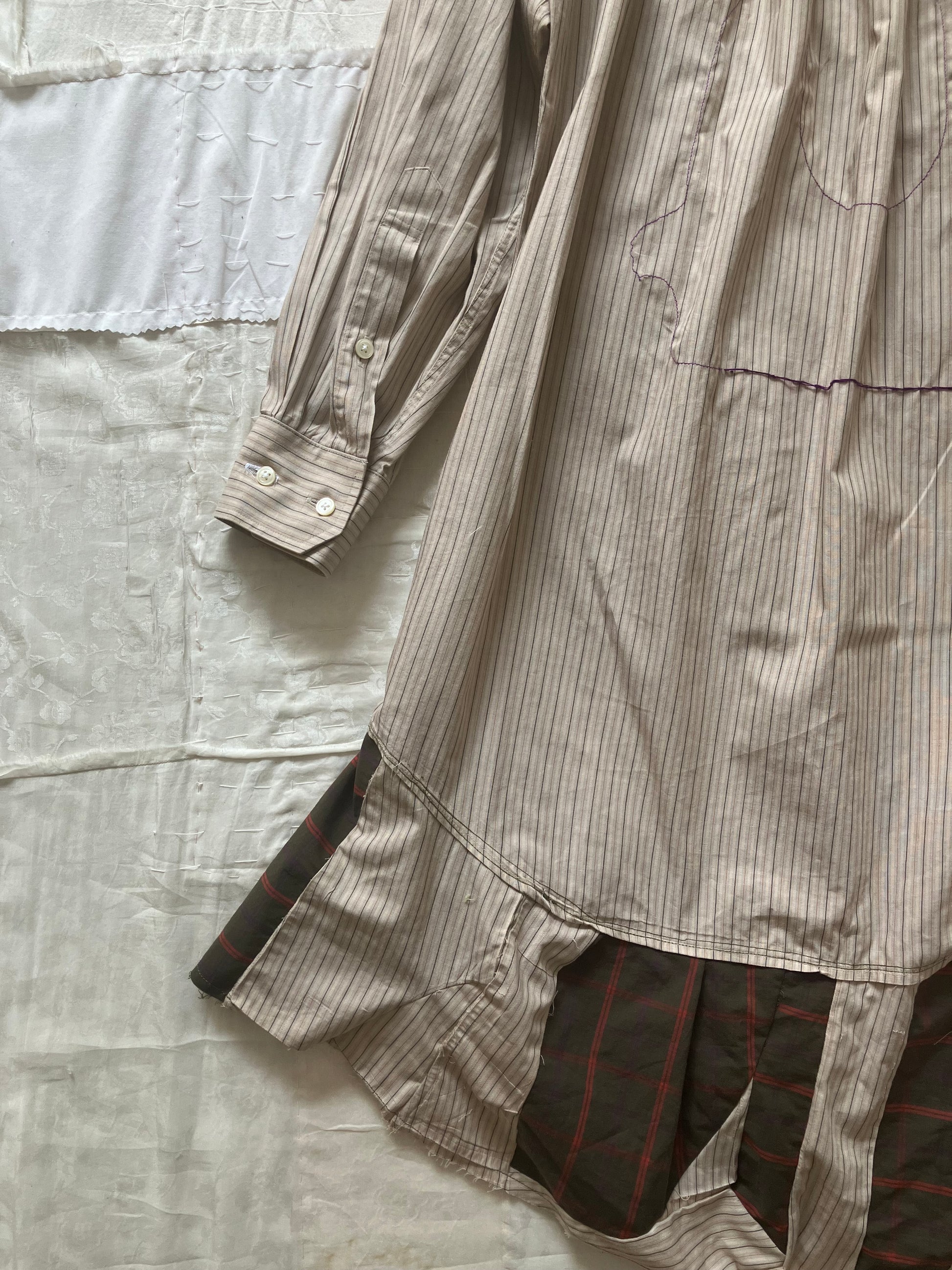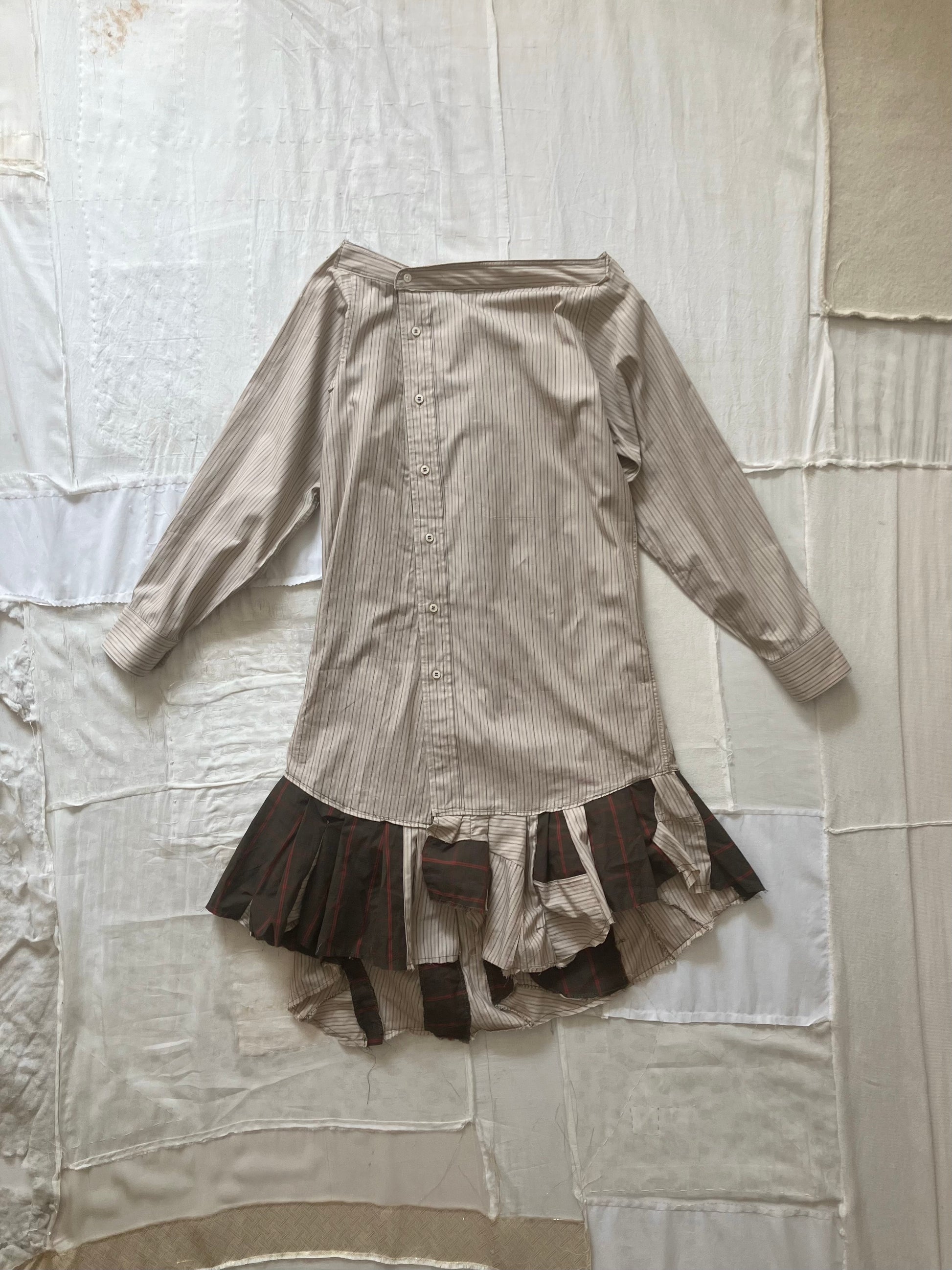 古着シャツなどの生地をアップサイクルした、手作りのドレス。