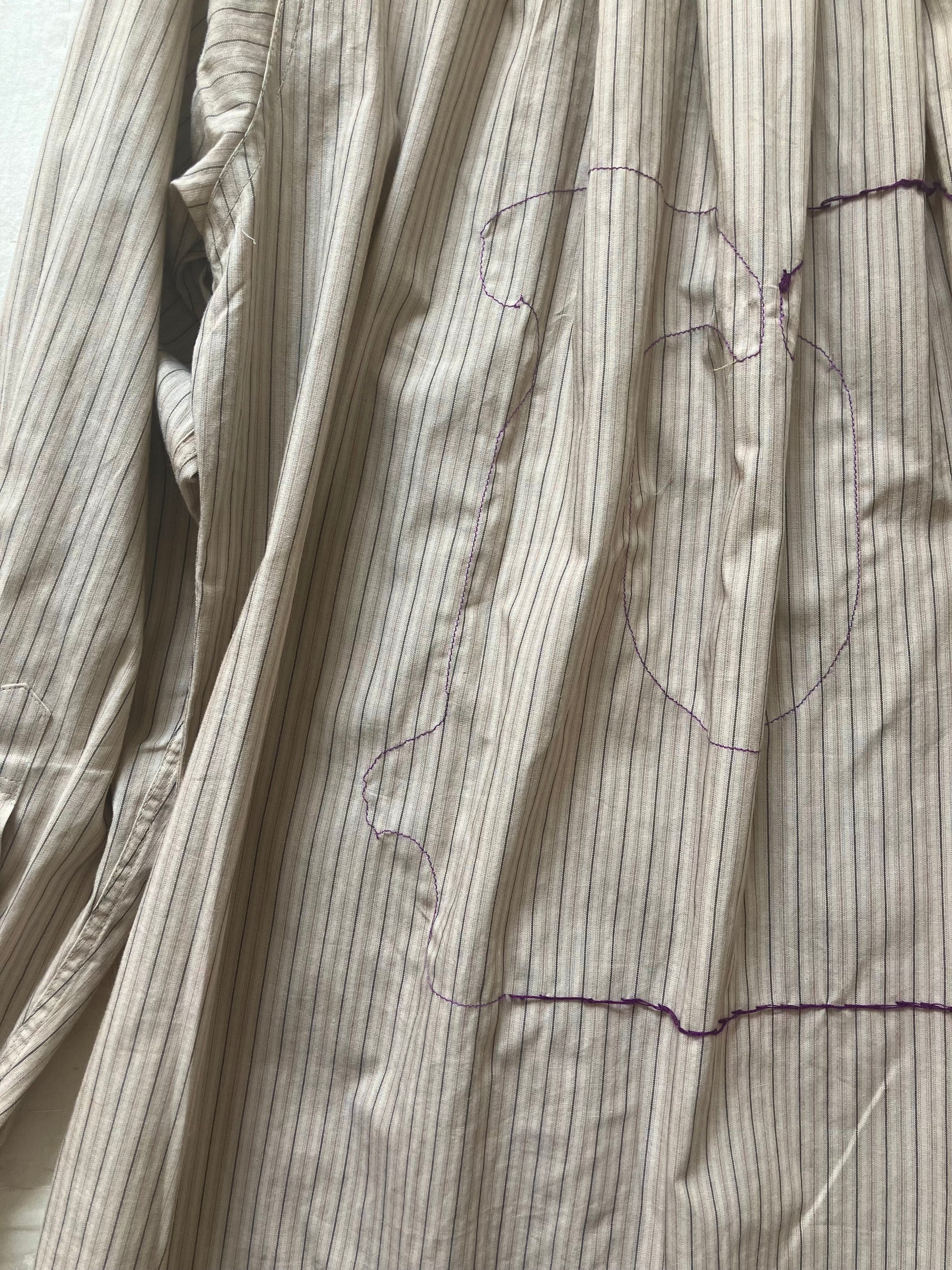 小さなパッチたちが見当たらないシンプルなデザインですが、バッグクロージャモチーフが半分手縫いの不思議な刺繍で施されたデザイン。ミニマルな仕上げですが、淡いベージュとブラウンチェックの生地、ステッチの色の組み合わせまで全てが絶妙すぎる魅力的な一着。