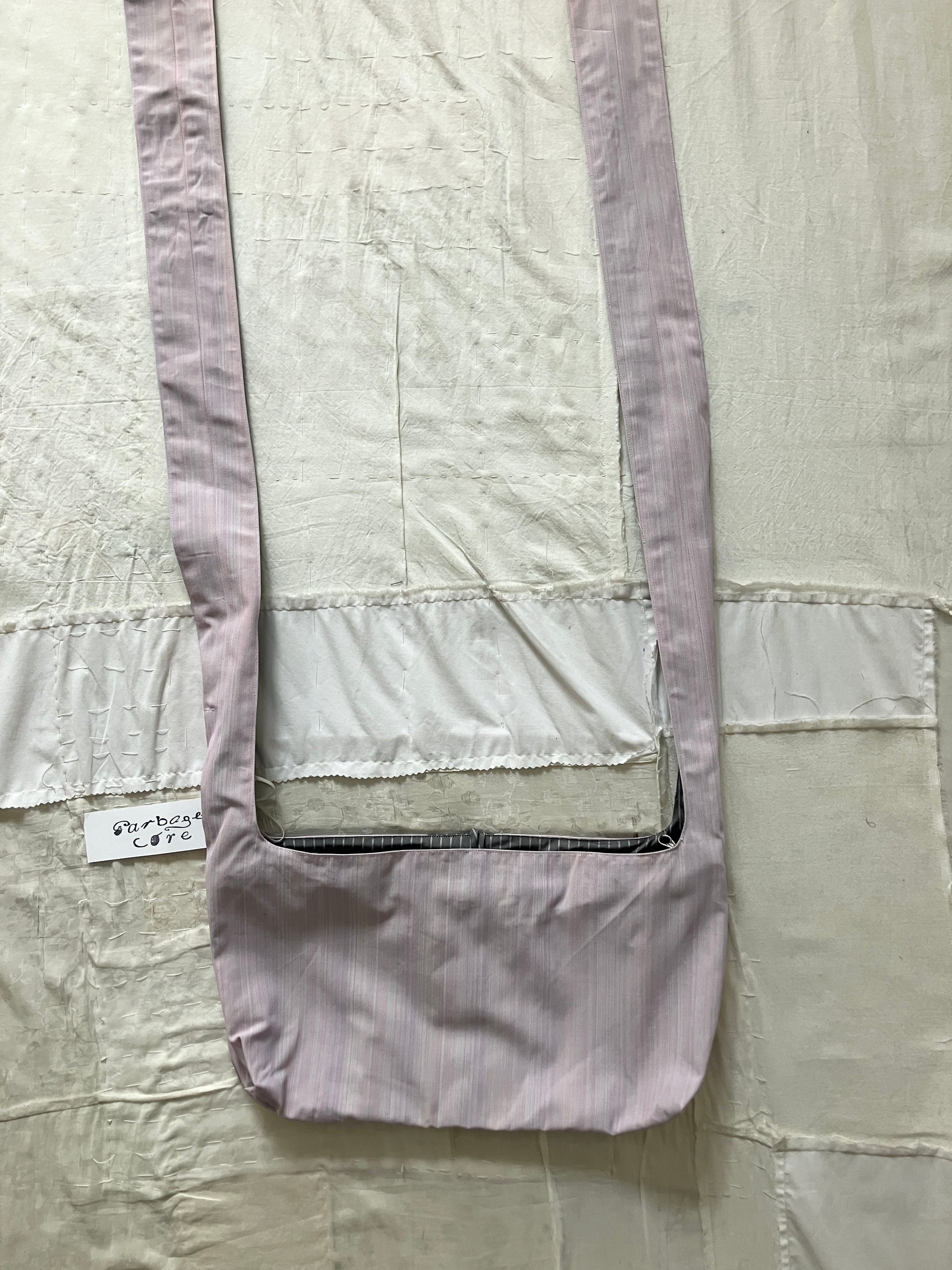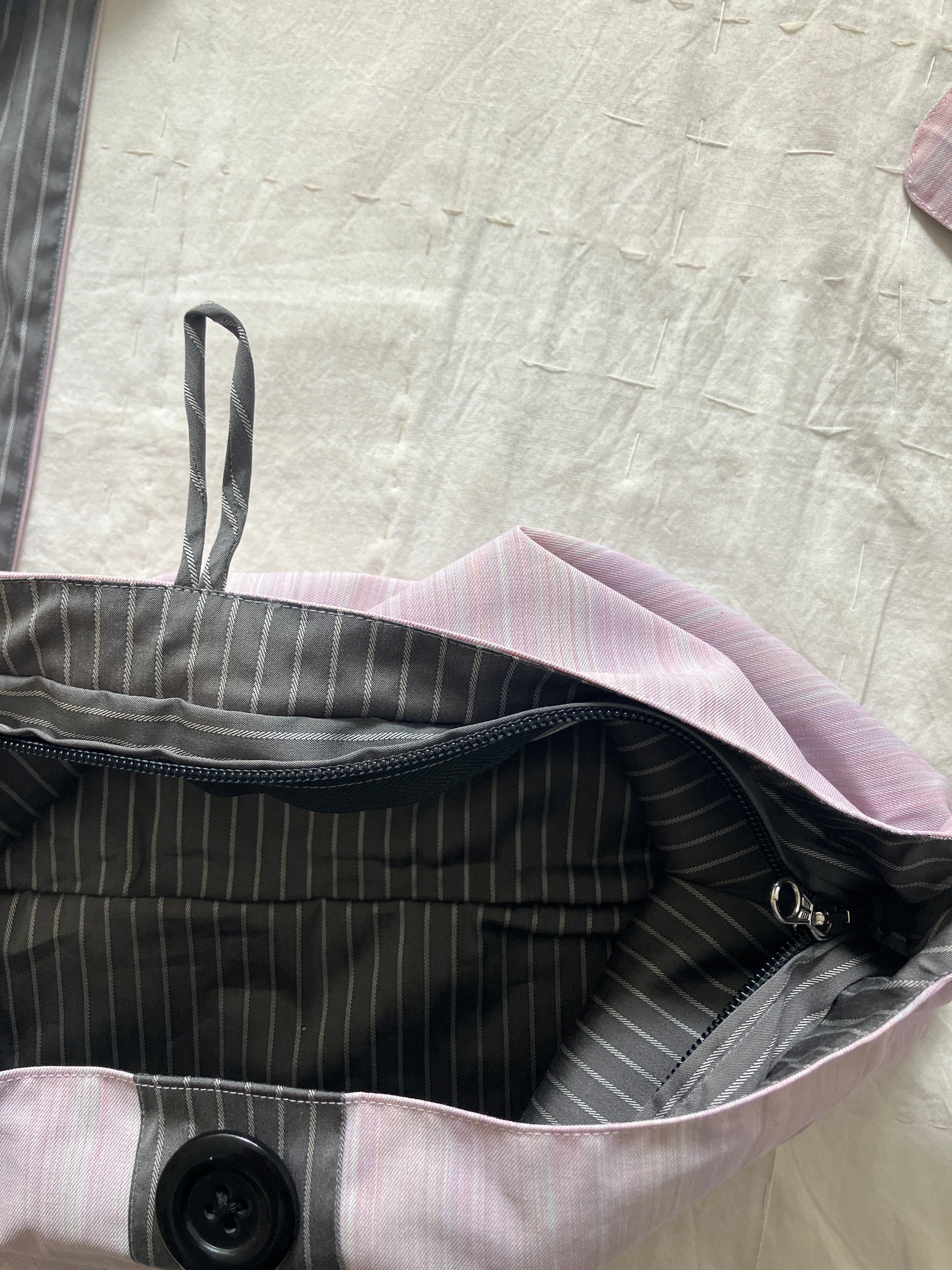 ピンクとグレーで、異なるストライプ模様の生地が組み合わされています。
