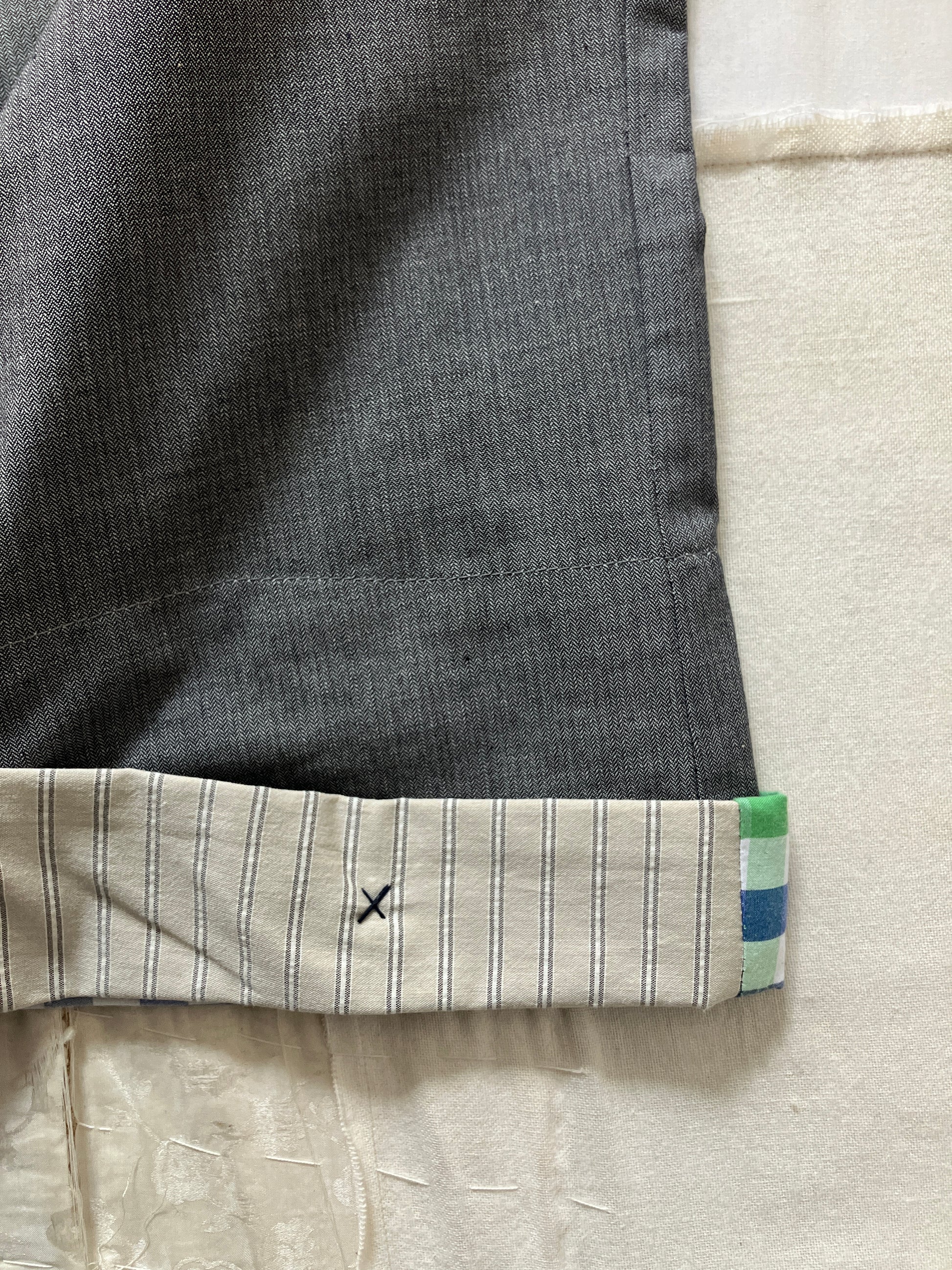 デッドストックやセカンドハンドの生地やボタンを組み合わせて作られた、一点もののパンツ。