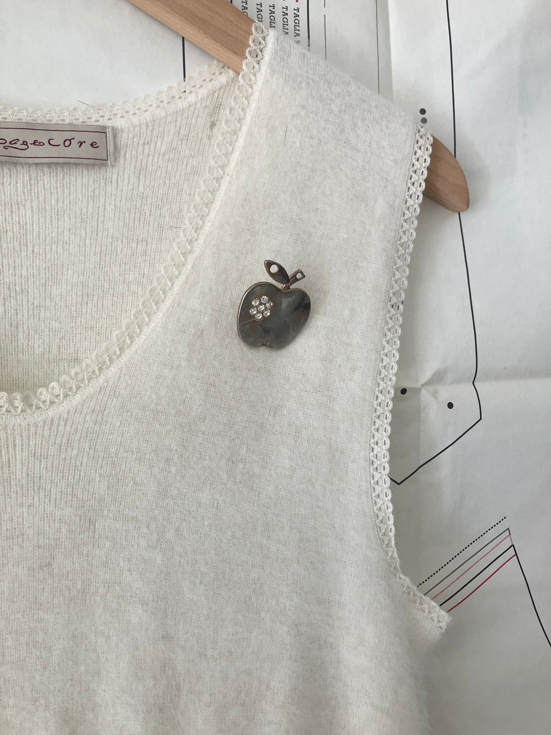 りんごのモチーフのヴィンテージブローチがついています。取り外し可能なので、自分の好きな場所に付け替えたり、他の服やバッグに付け替えたりしてもお楽しみいただけます。