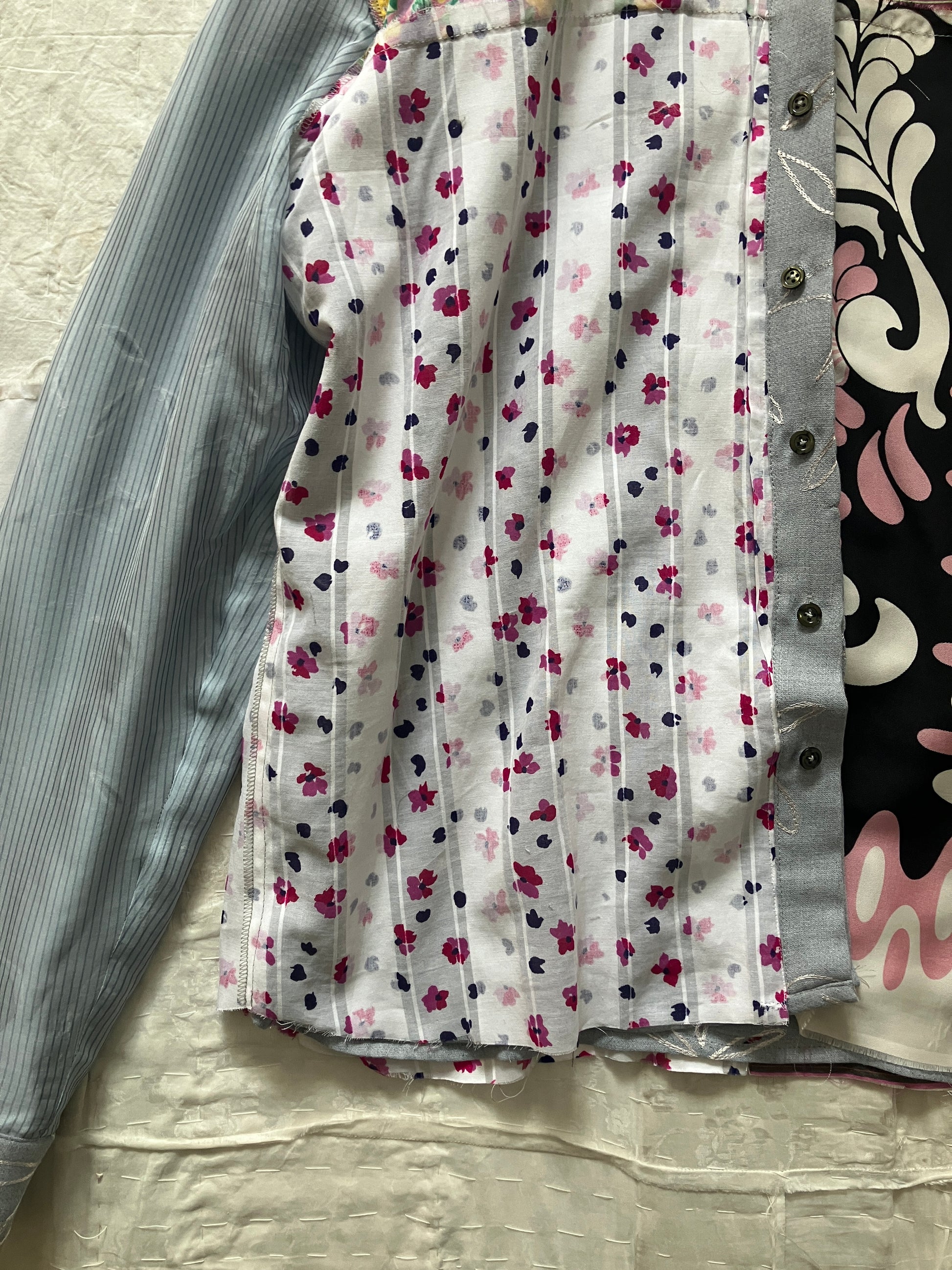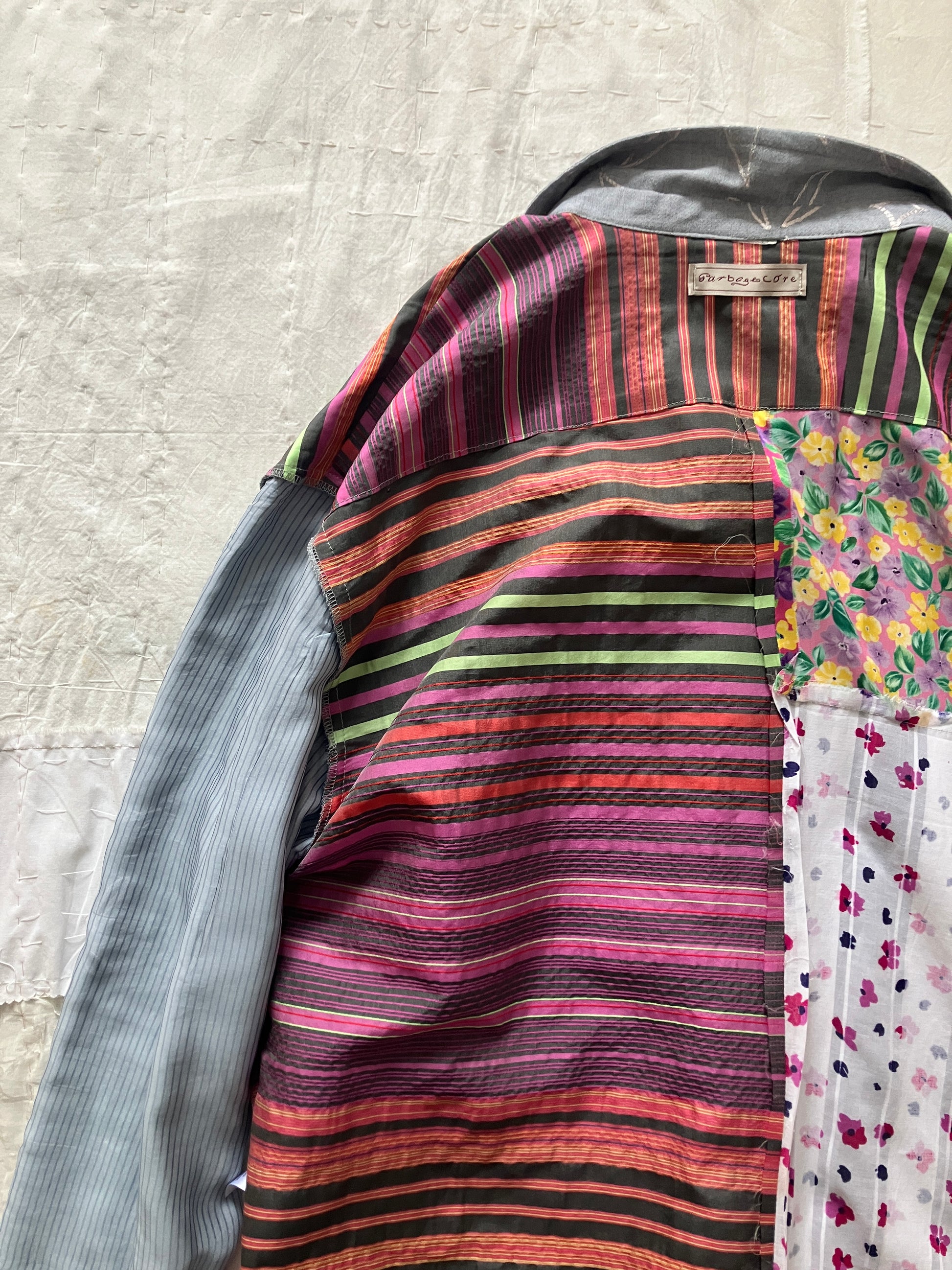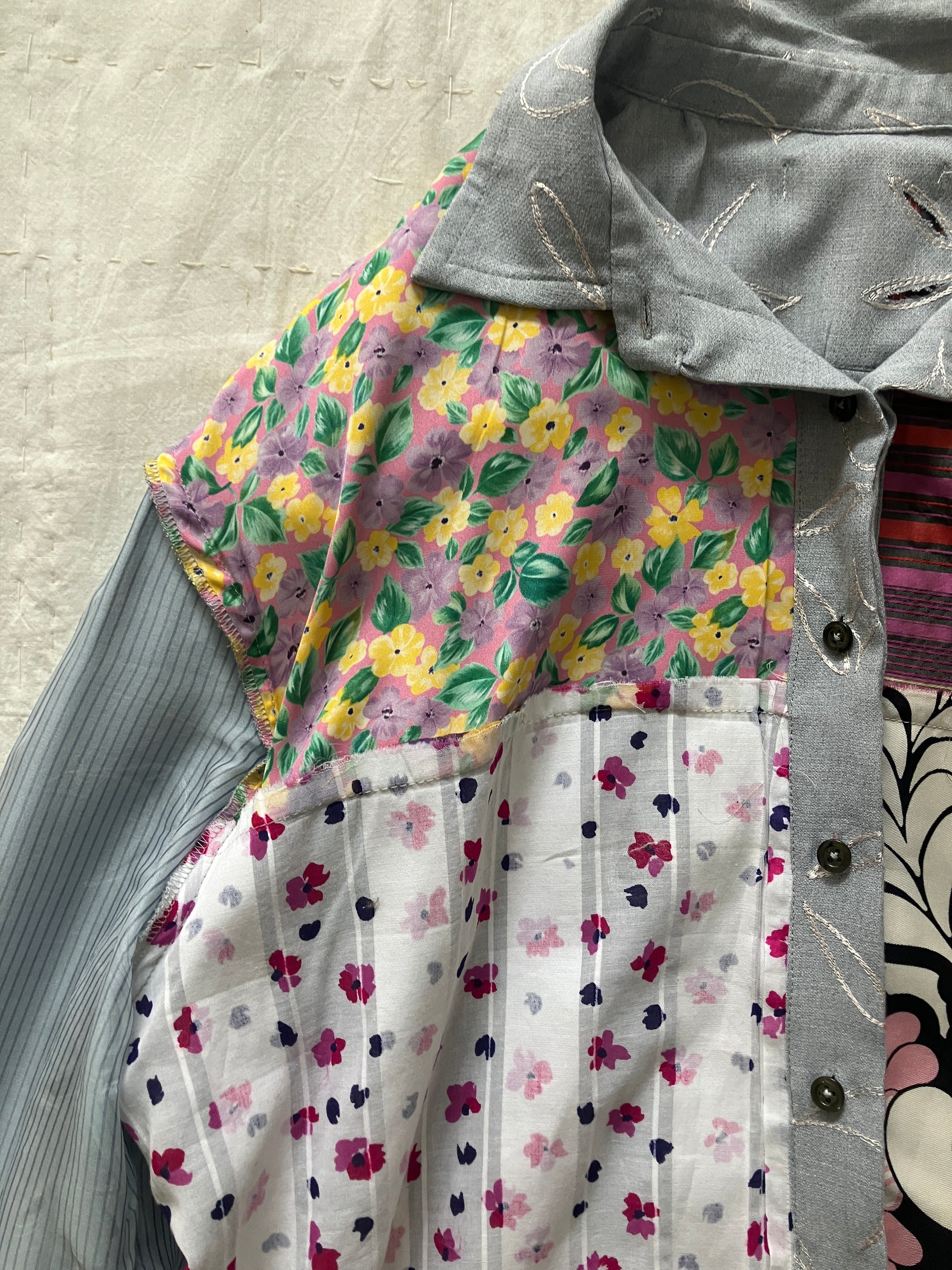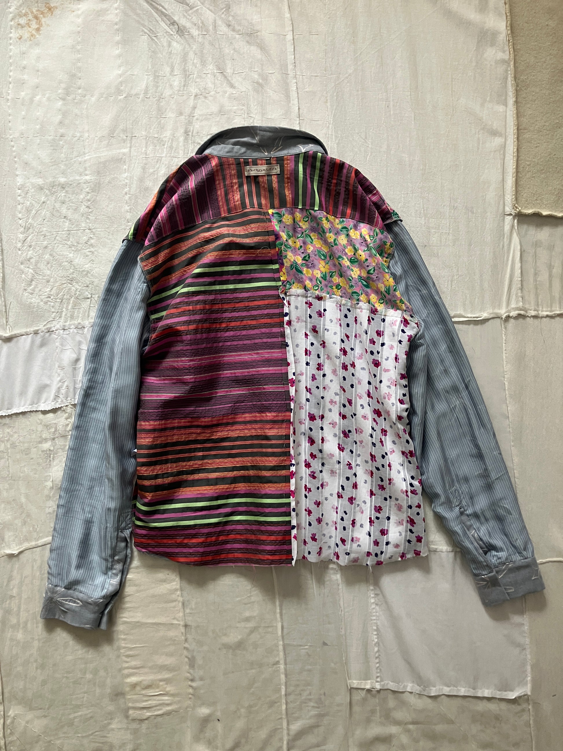 裏地はとても賑やかなシルク生地のパッチワークで、お好みでリバーシブルシャツとしても着用いただけそうです。シルクの裏地なので、さらさらとした着心地で、一枚でも重ね着をしても快適なのが特徴です。
