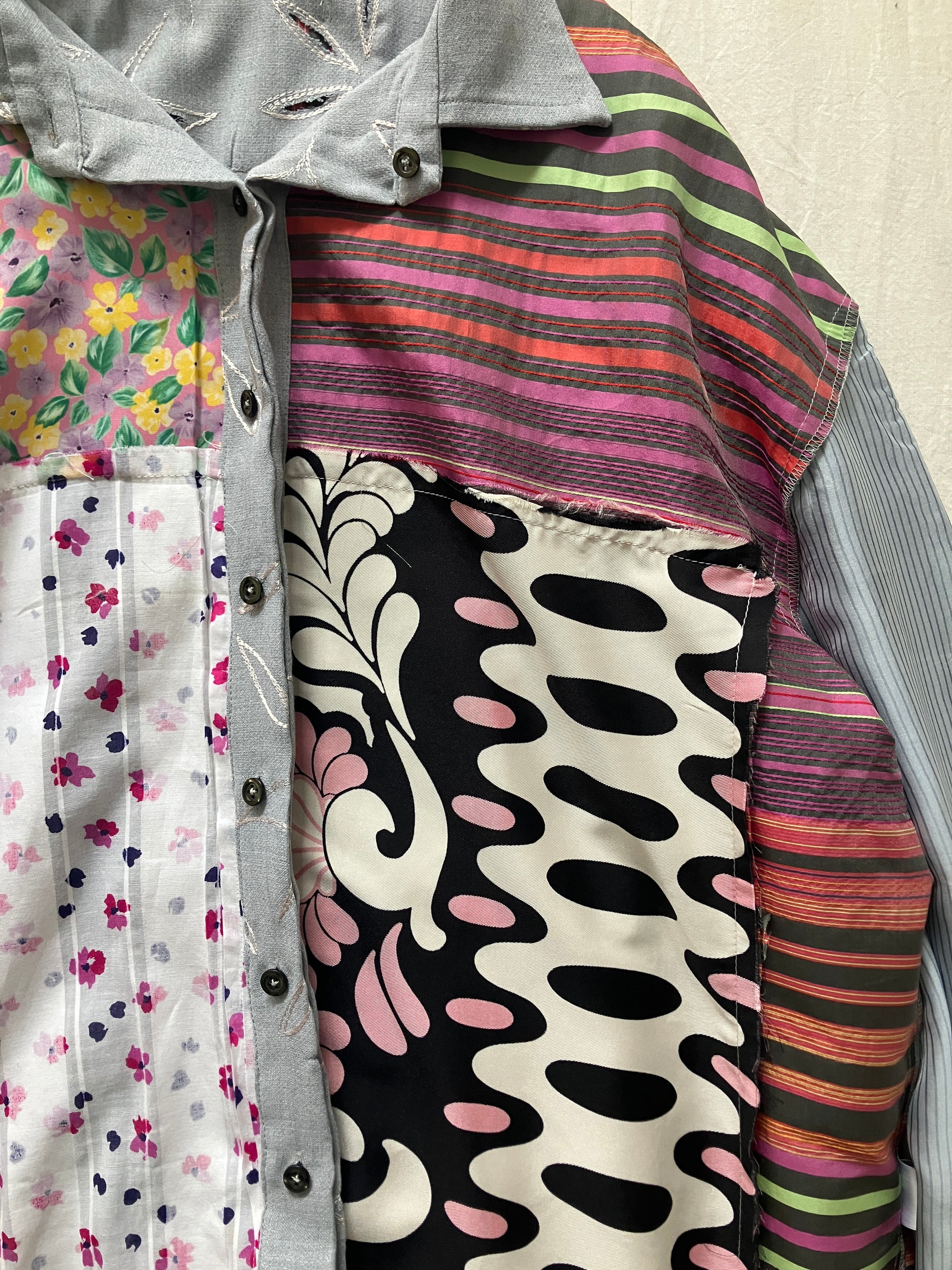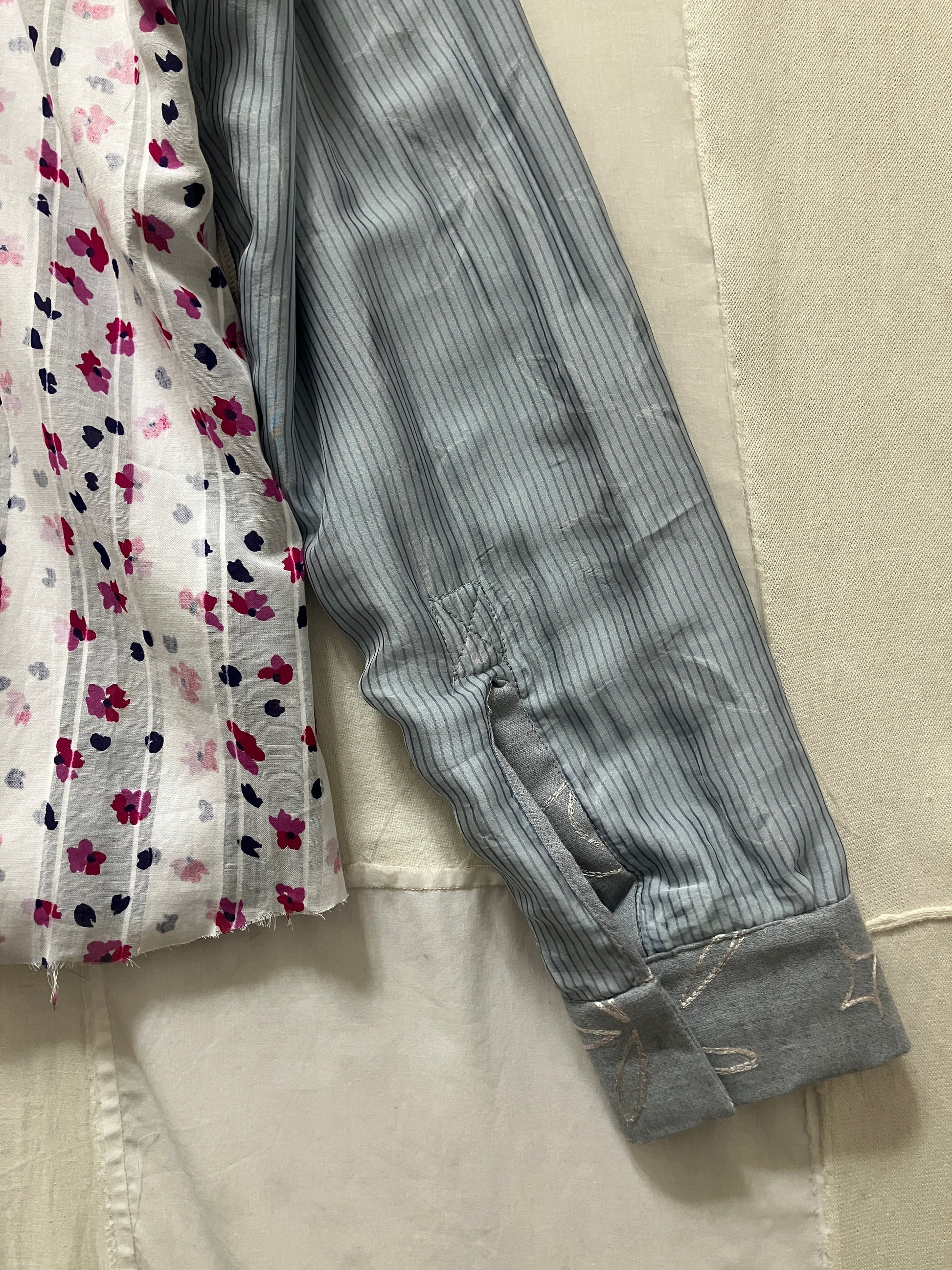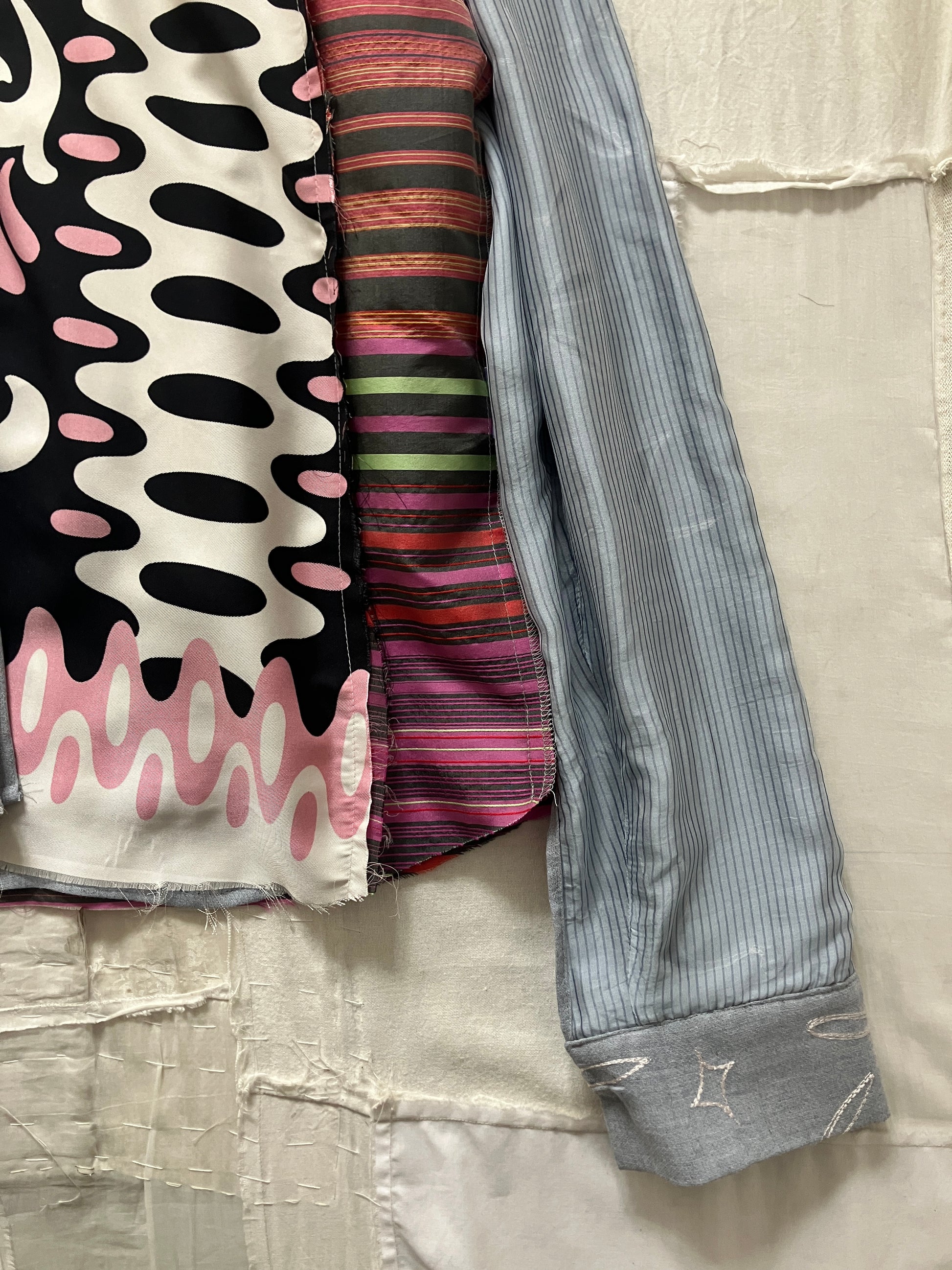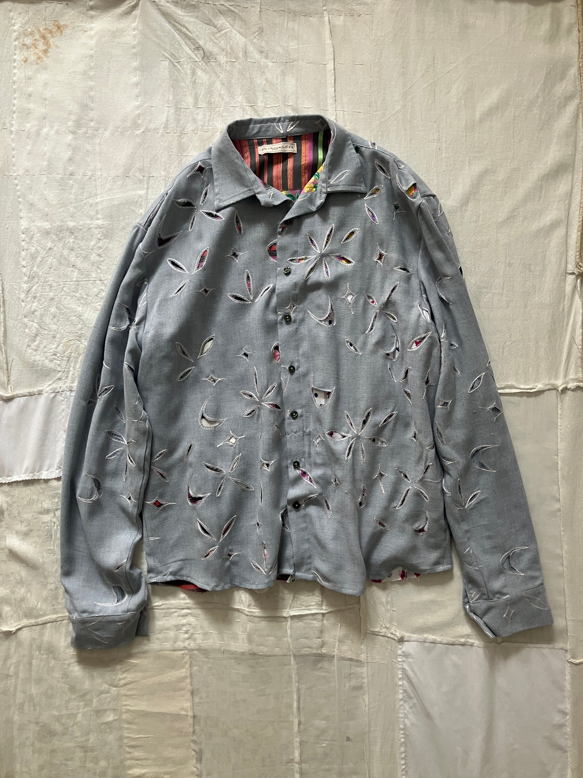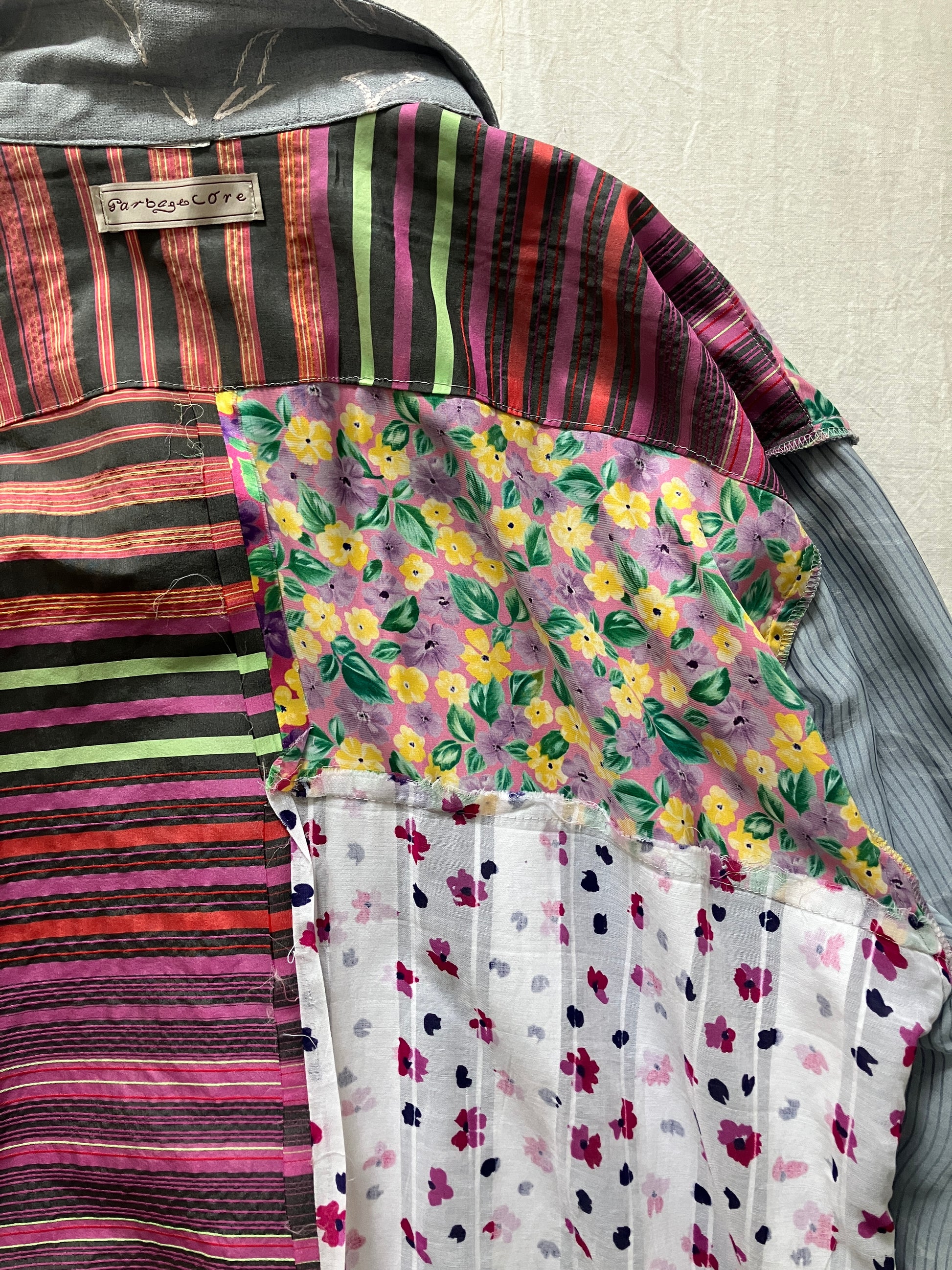 裏地はとても賑やかなシルク生地のパッチワークで、お好みでリバーシブルシャツとしても着用いただけそうです。シルクの裏地なので、さらさらとした着心地で、一枚でも重ね着をしても快適なのが特徴です。