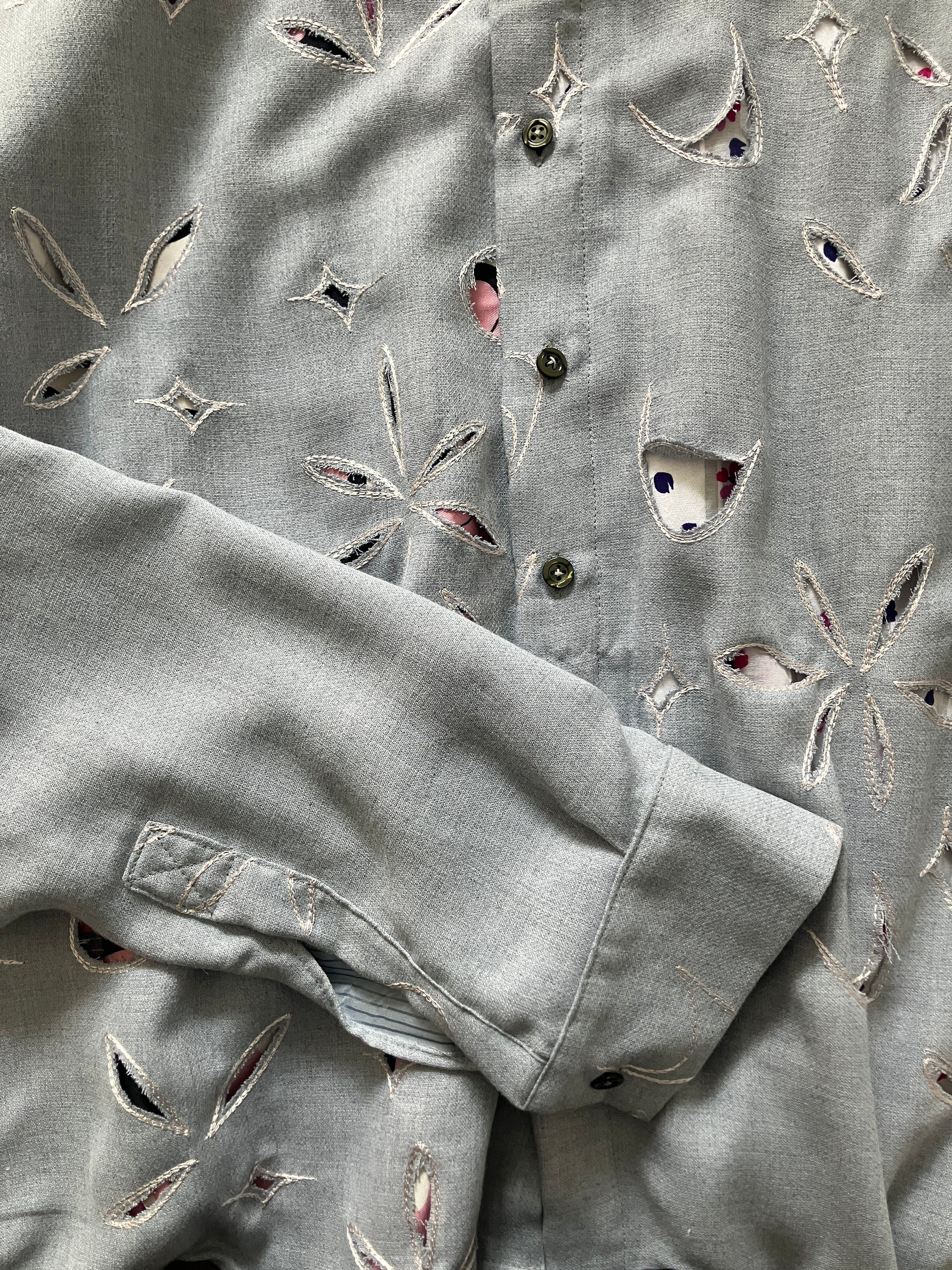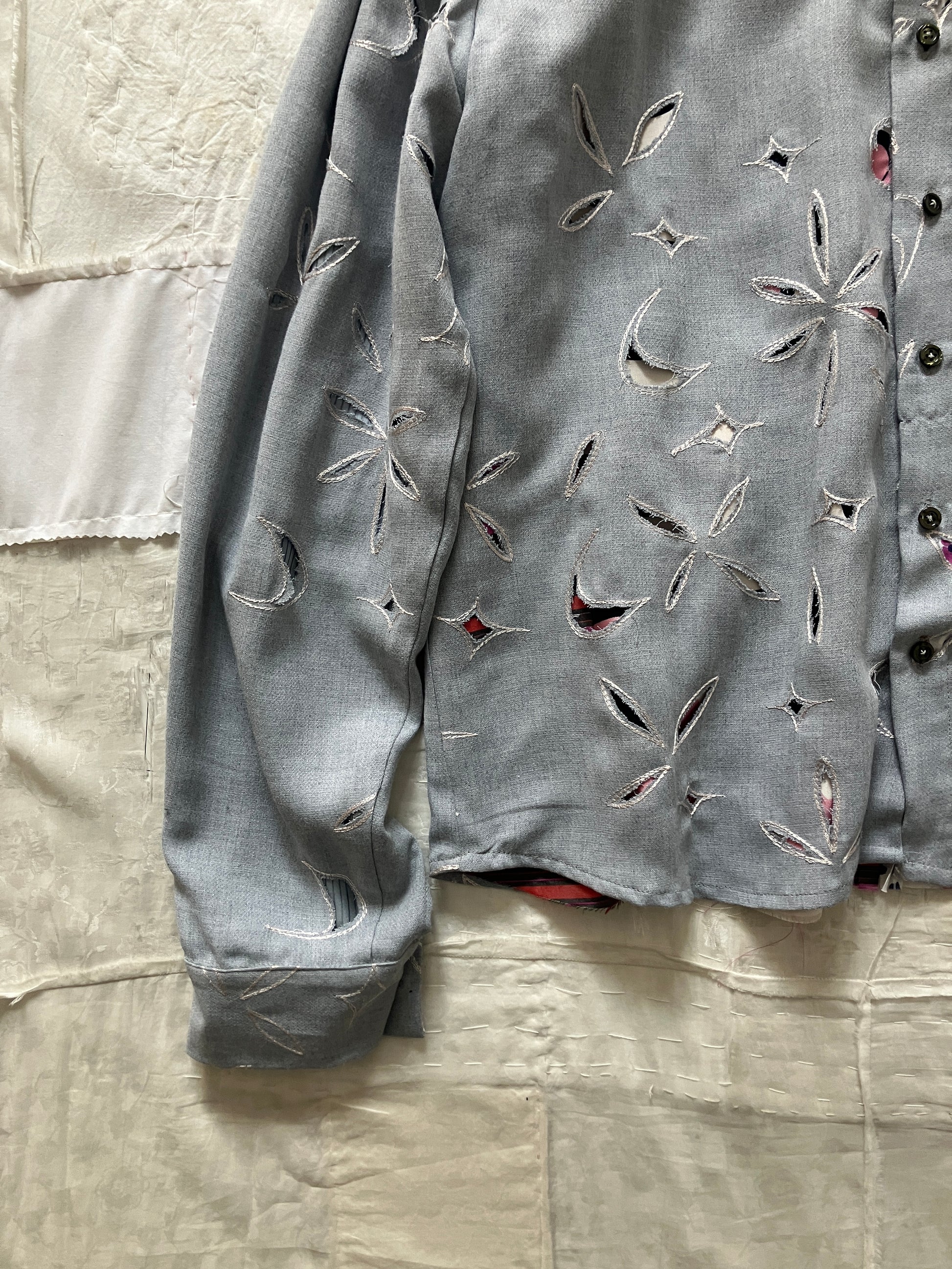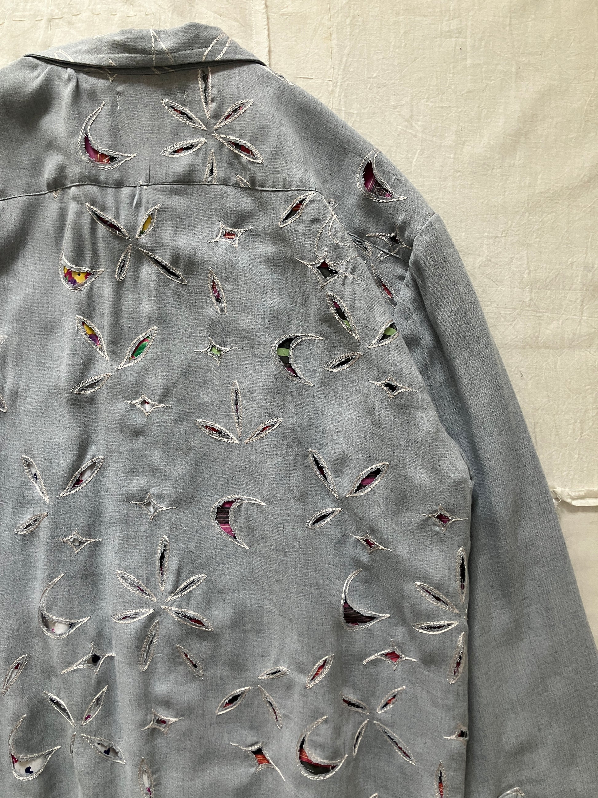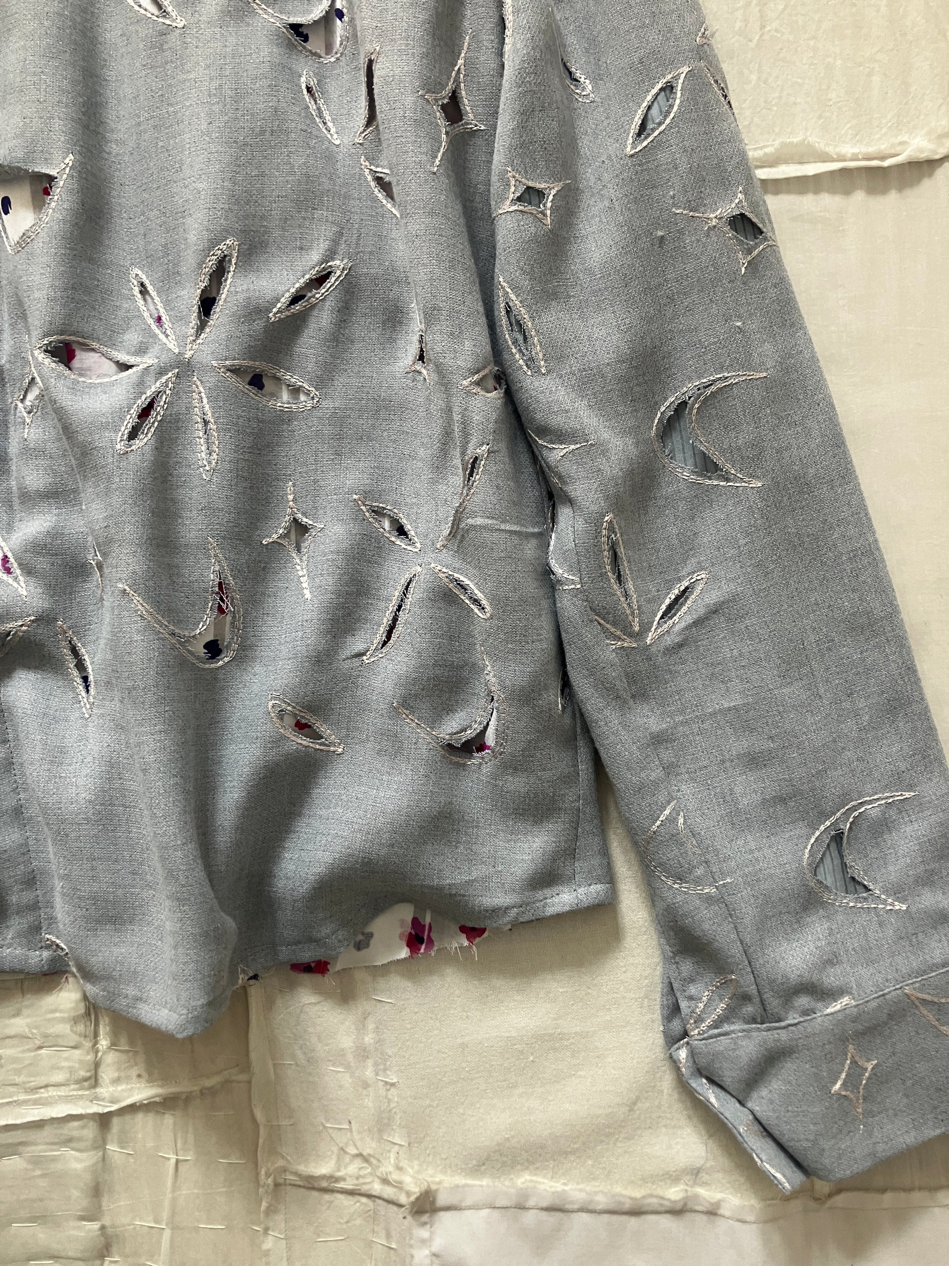 お花やダイヤのようなモチーフで、生地の全体に大量の刺繍がひとつひとつ施され、その刺繍をくり抜いた穴から裏地の模様が覗いている、とてもユニークでオンリーワンなデザインです。