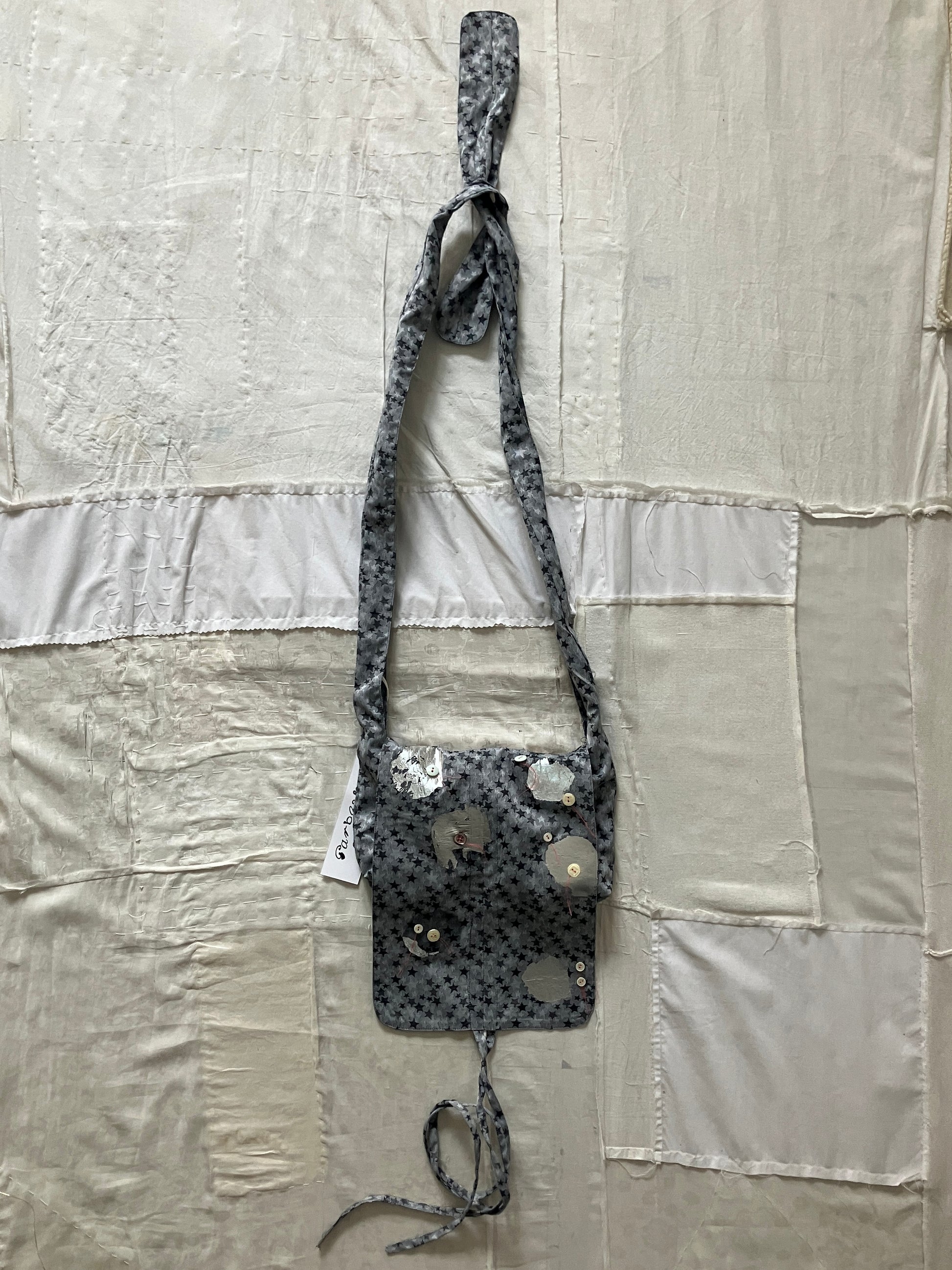 グレーのバッグですが、小さな星が散りばめられたような生地に箔押しの装飾がとてもユニークで、キラキラした印象が対照的です。