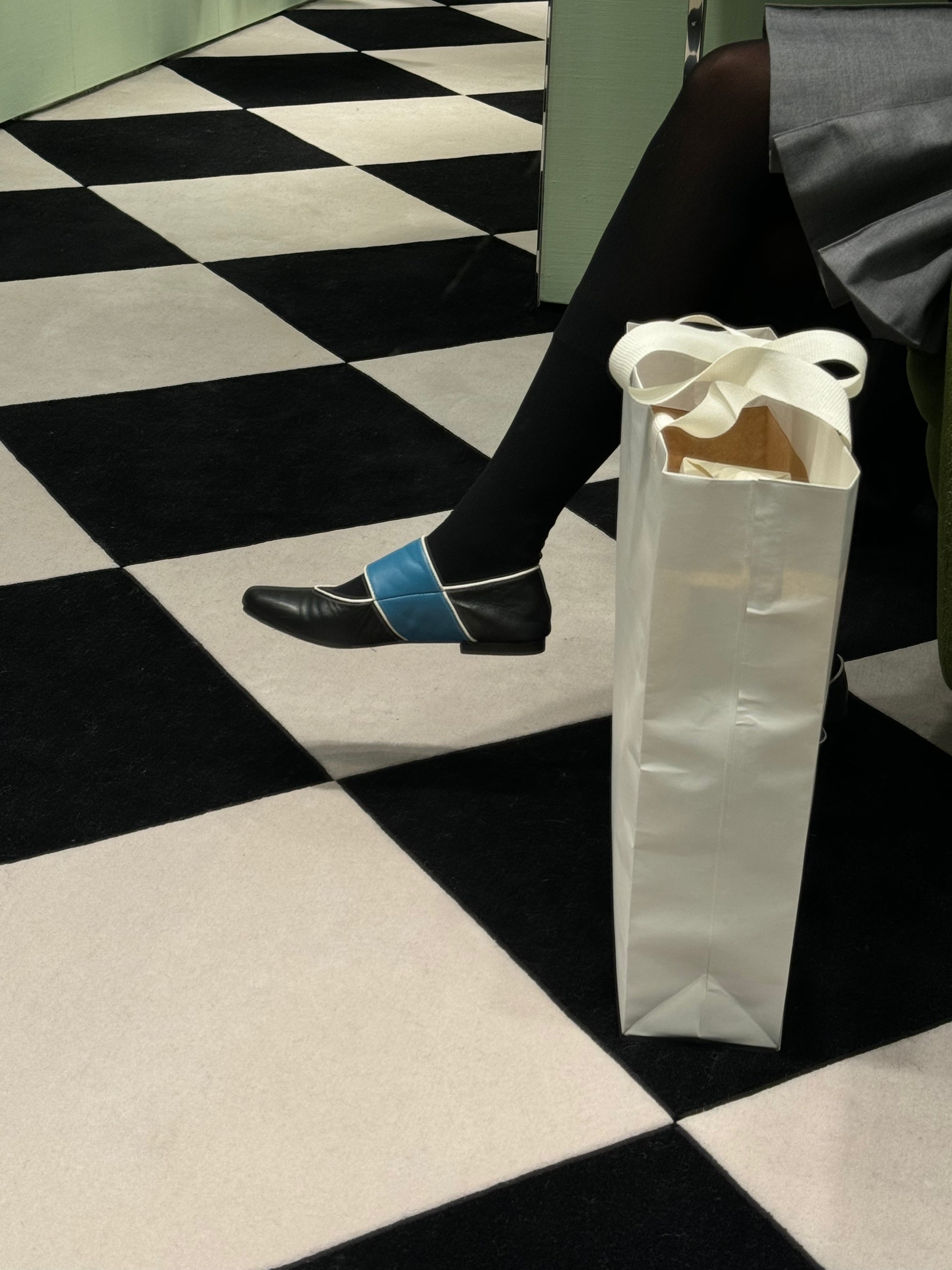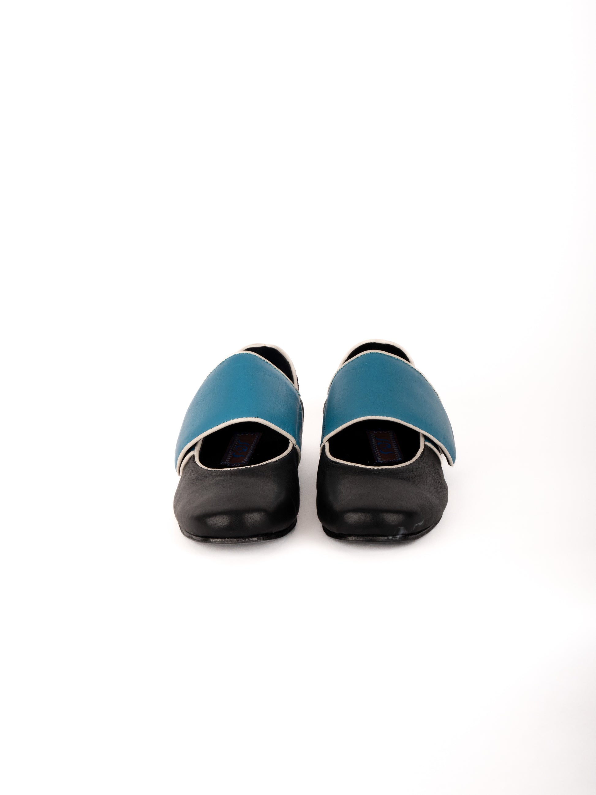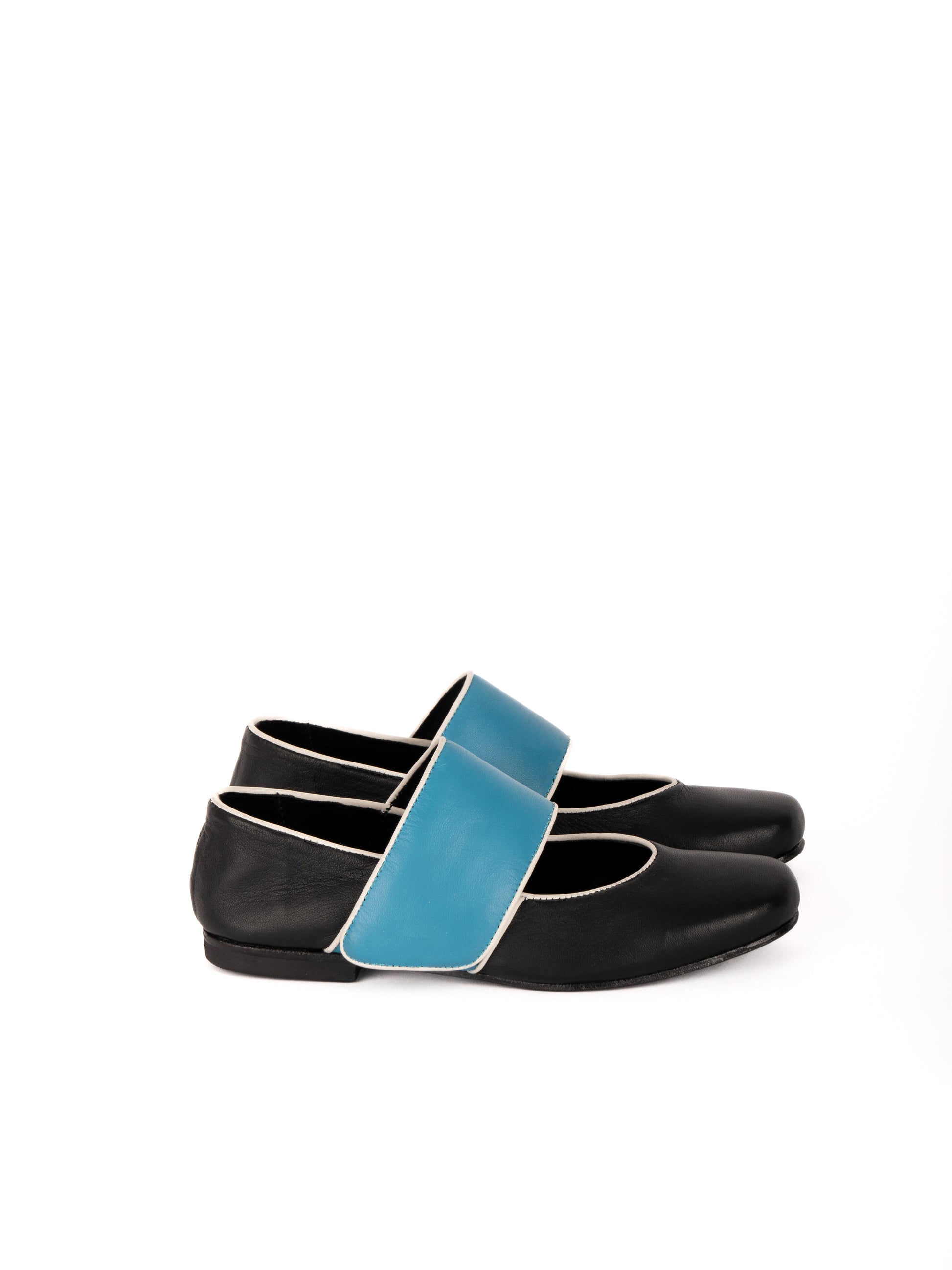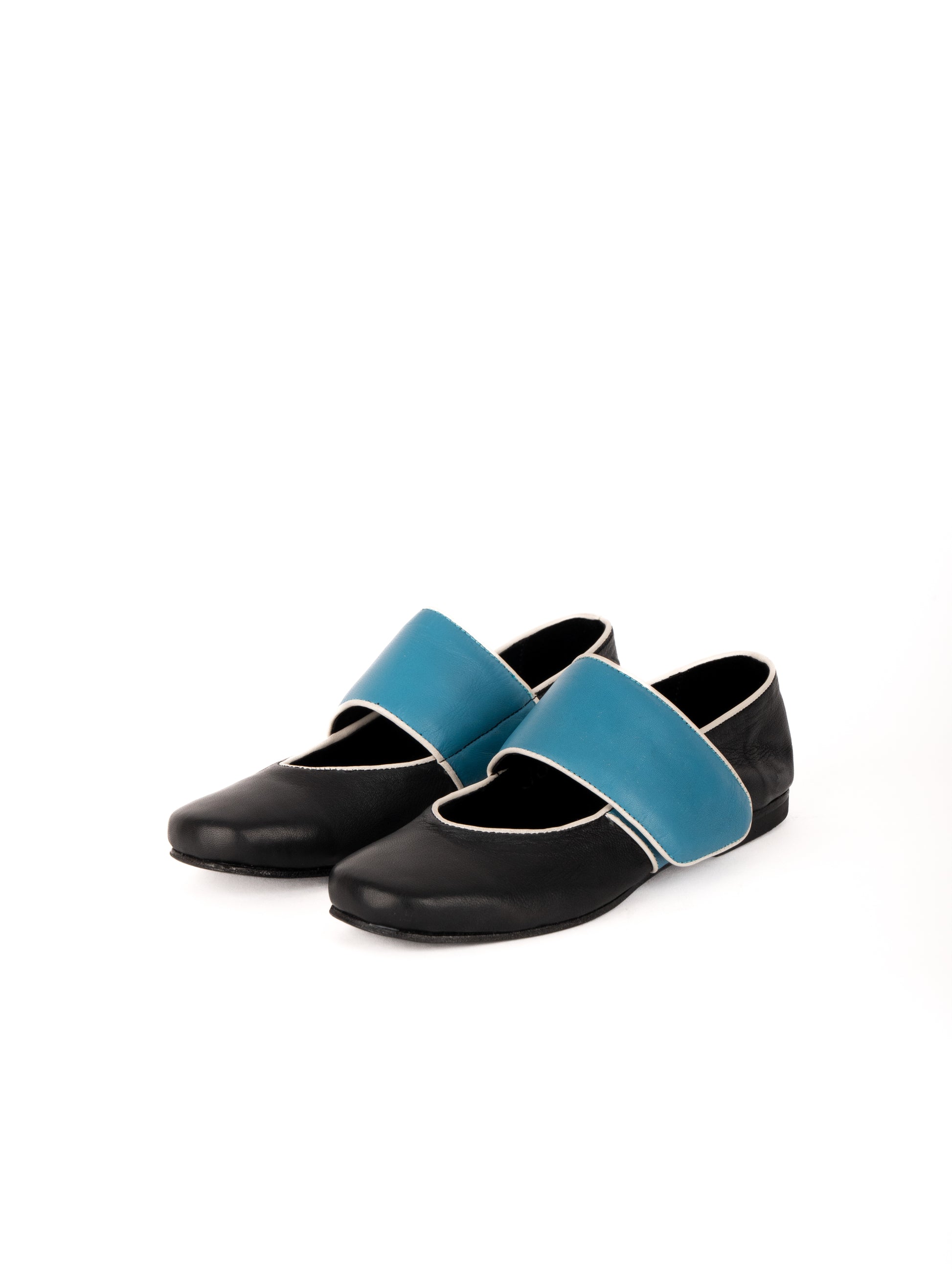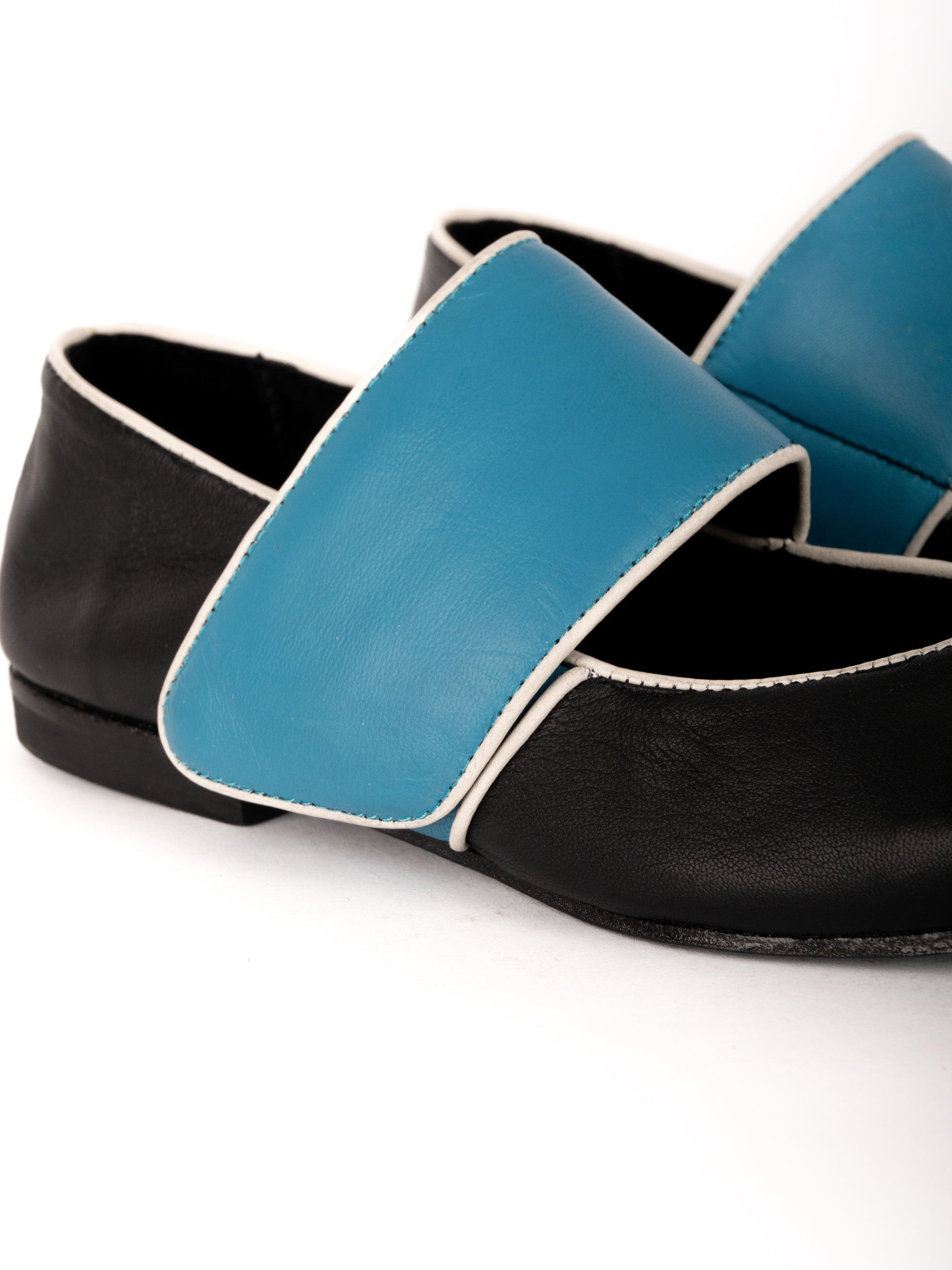 ツートーンのラムスキンアッパーに、コントラストカラーのパイピングを施したフラットシューズ。