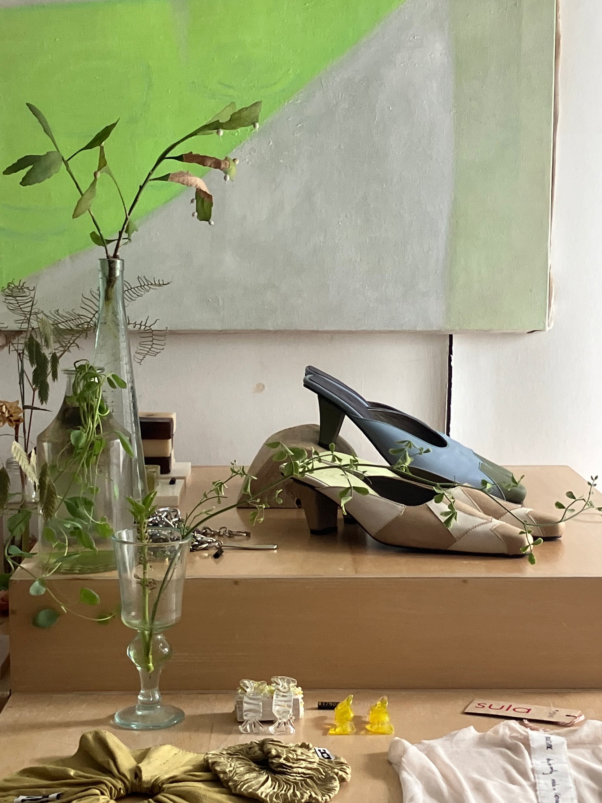 「Marina」というこのカラーは、グレーがかったような、淡くも暗みのあるペールブルーが全体に、つま先とヒール部分にはカーキが組み合わされていて、ライニングはくすみのあるラベンダー。ステッチはグリーンの糸でデザインされていて、カームな印象のカラーリングの中にほんの少し遊び心が覗いています。
