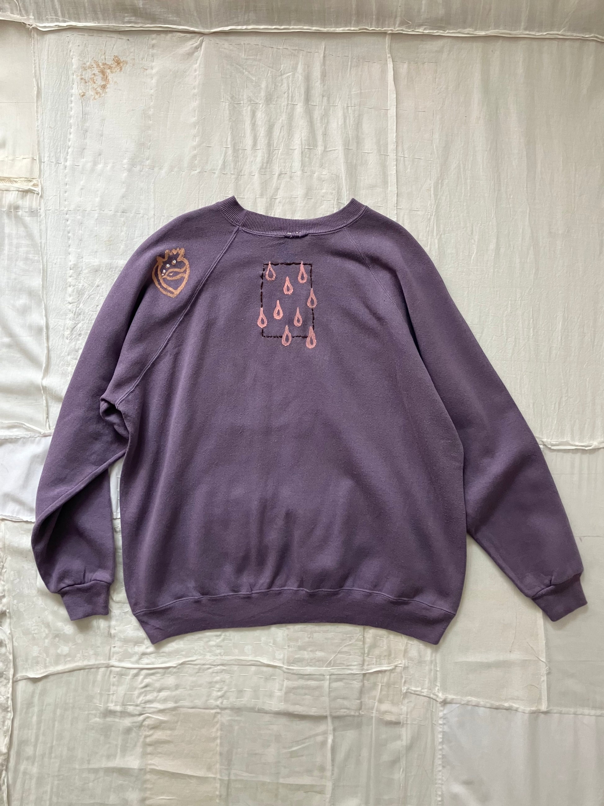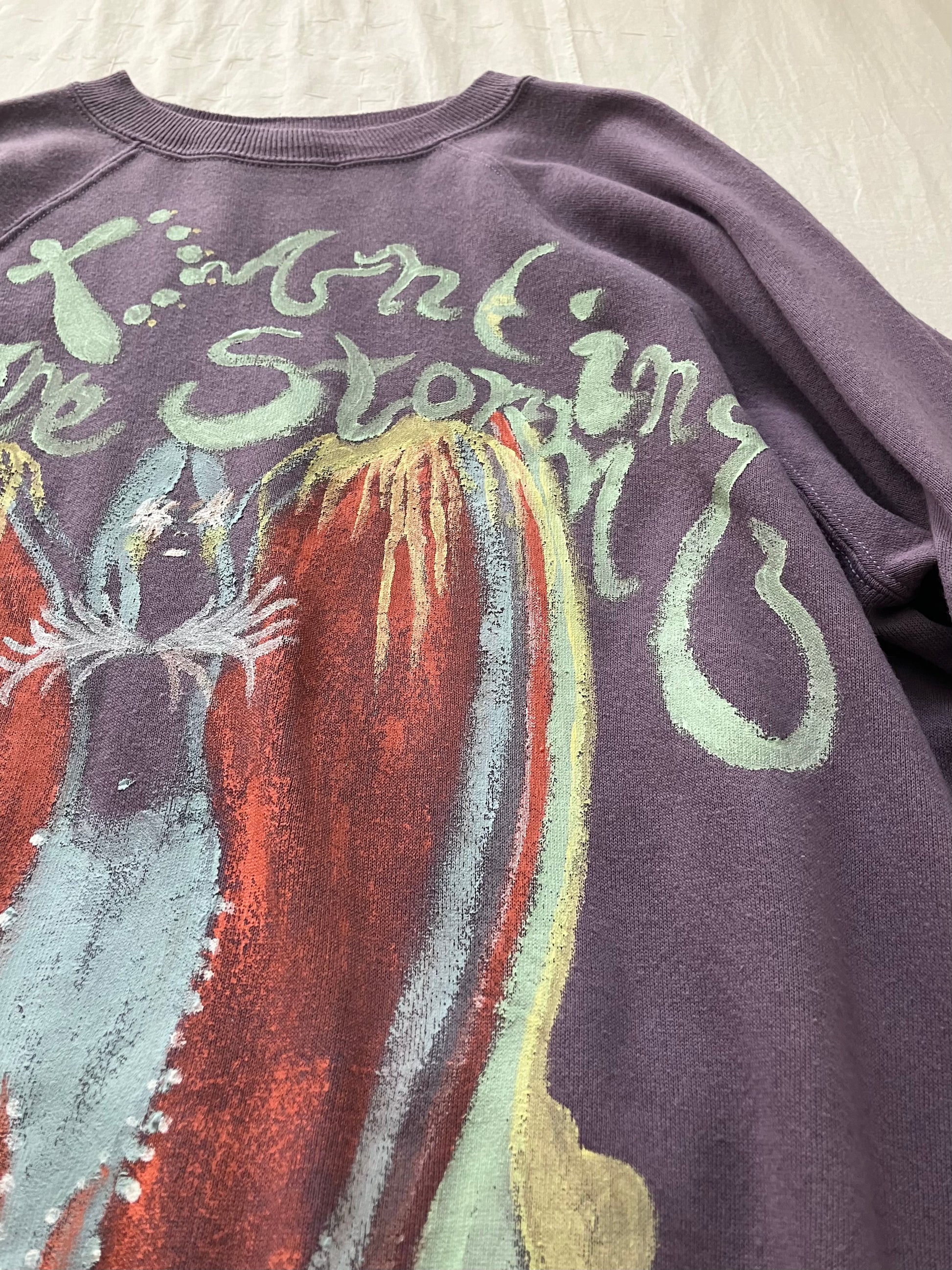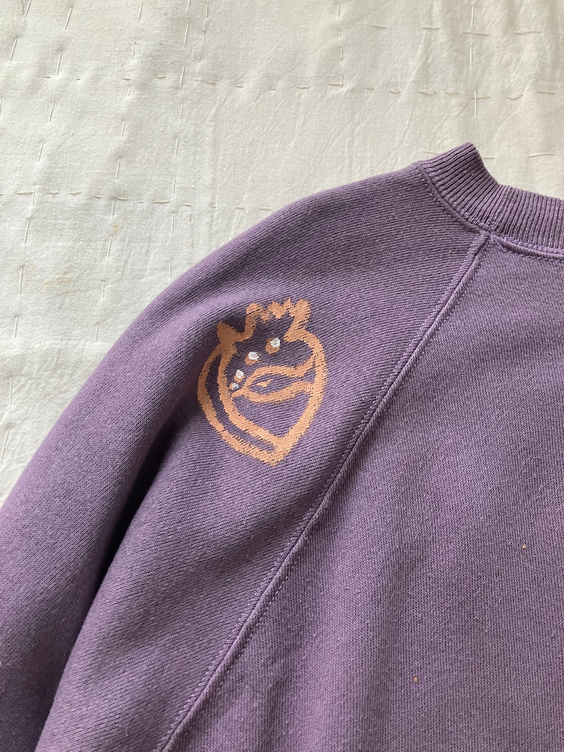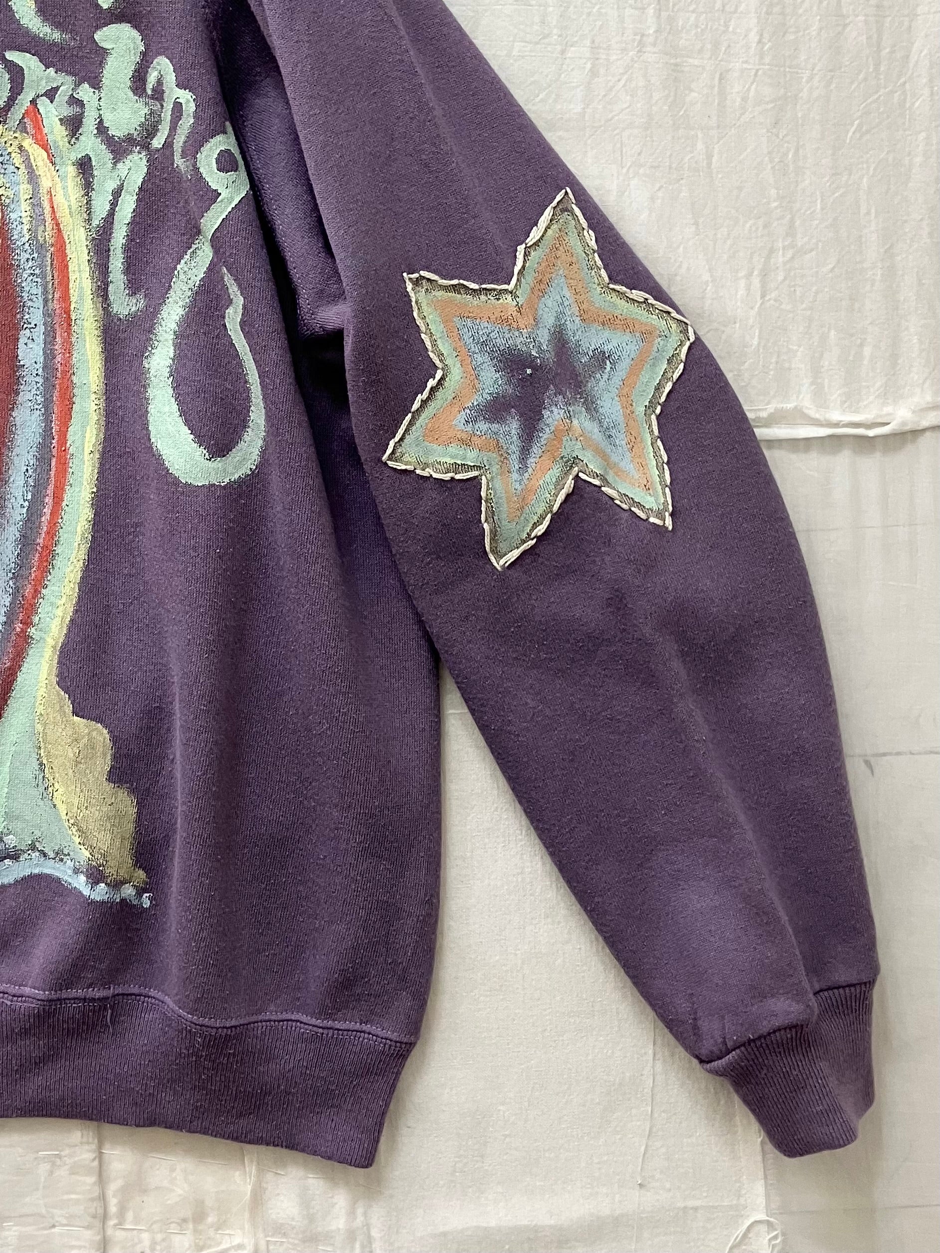 裏起毛の古着スウェットのほんのり色褪せたパープルの色味を活かすように、カラフルにペイントされた一着。