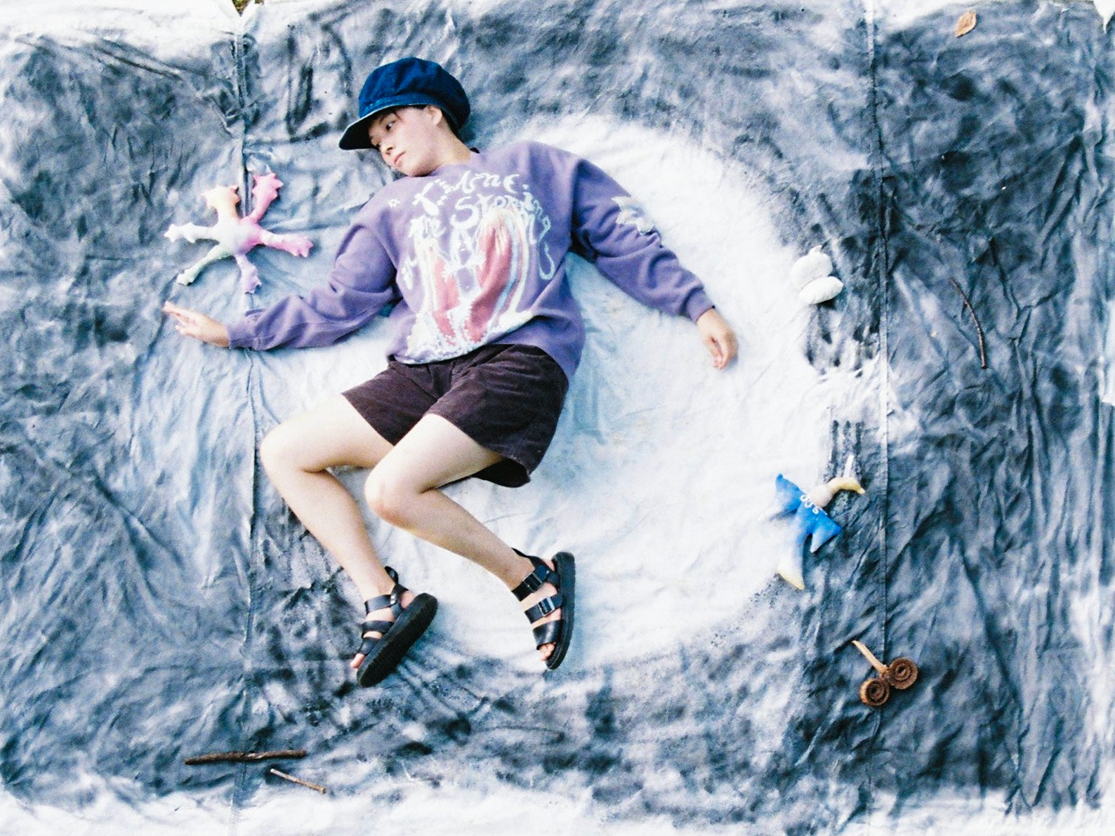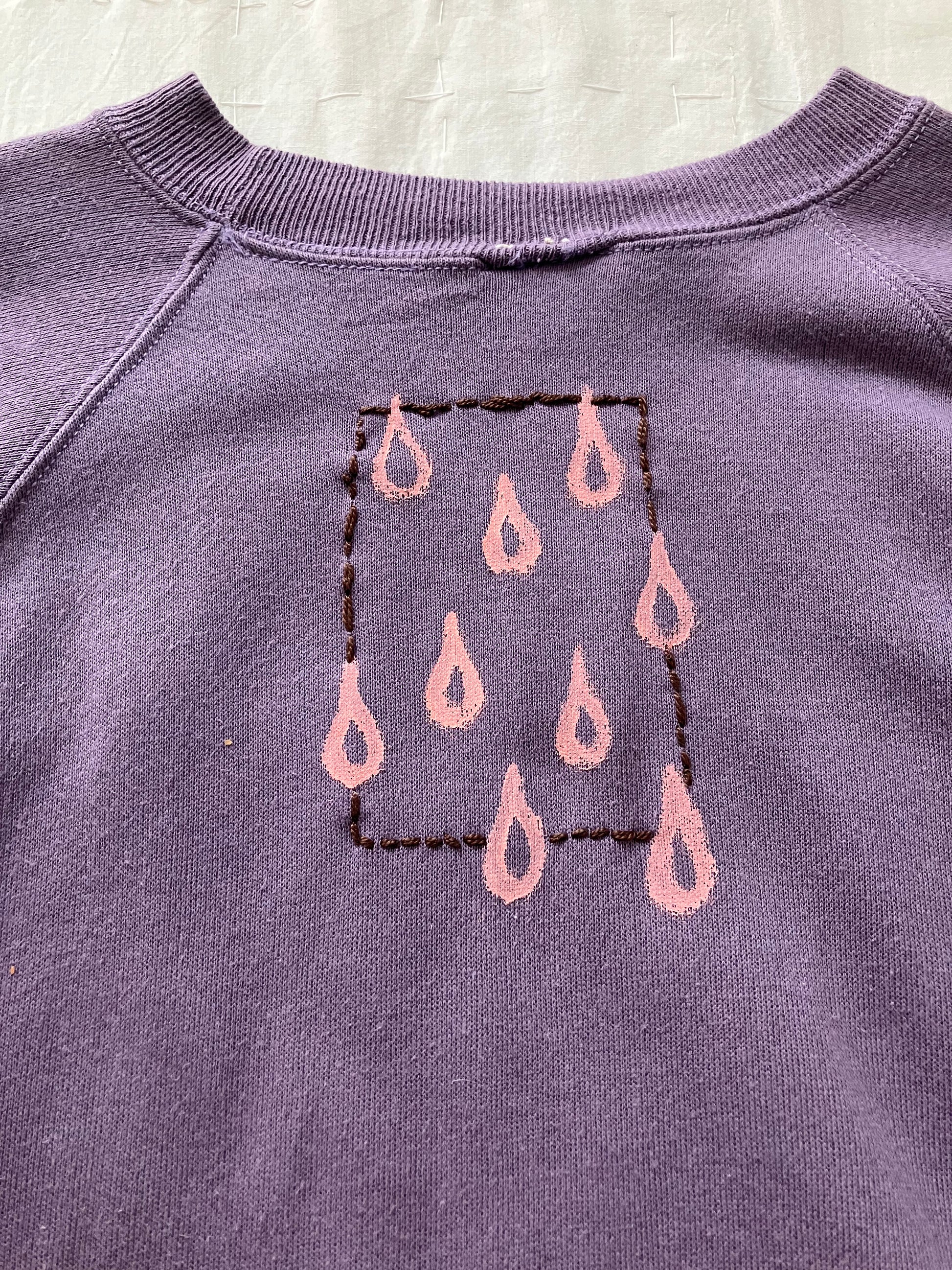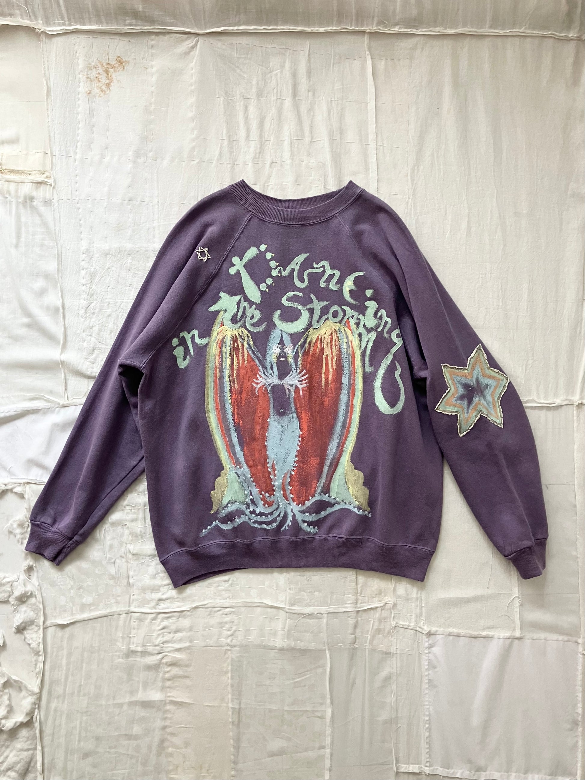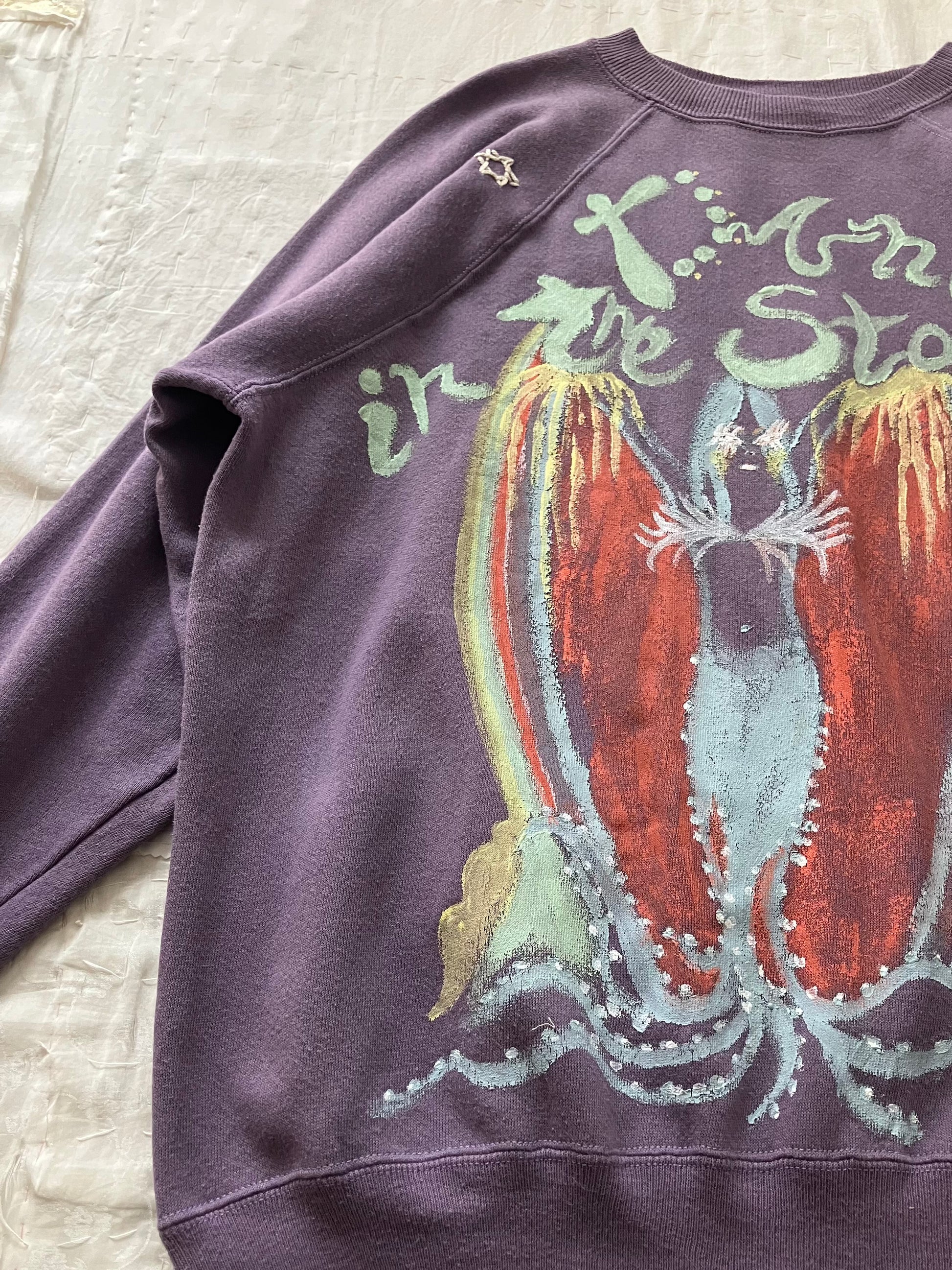 裏起毛の古着スウェットのほんのり色褪せたパープルの色味を活かすように、カラフルにペイントされた一着。