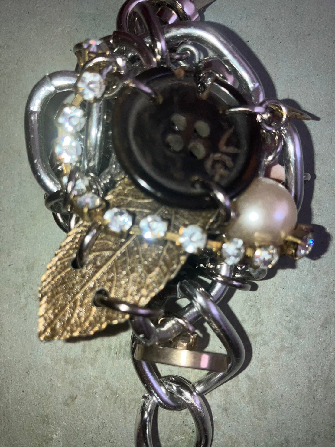チェーンが絡まる中に、キュートなモチーフや色が絡まっています。パーツとパーツの偶然の出会いが、あちらこちらでとても楽しげな表情。
