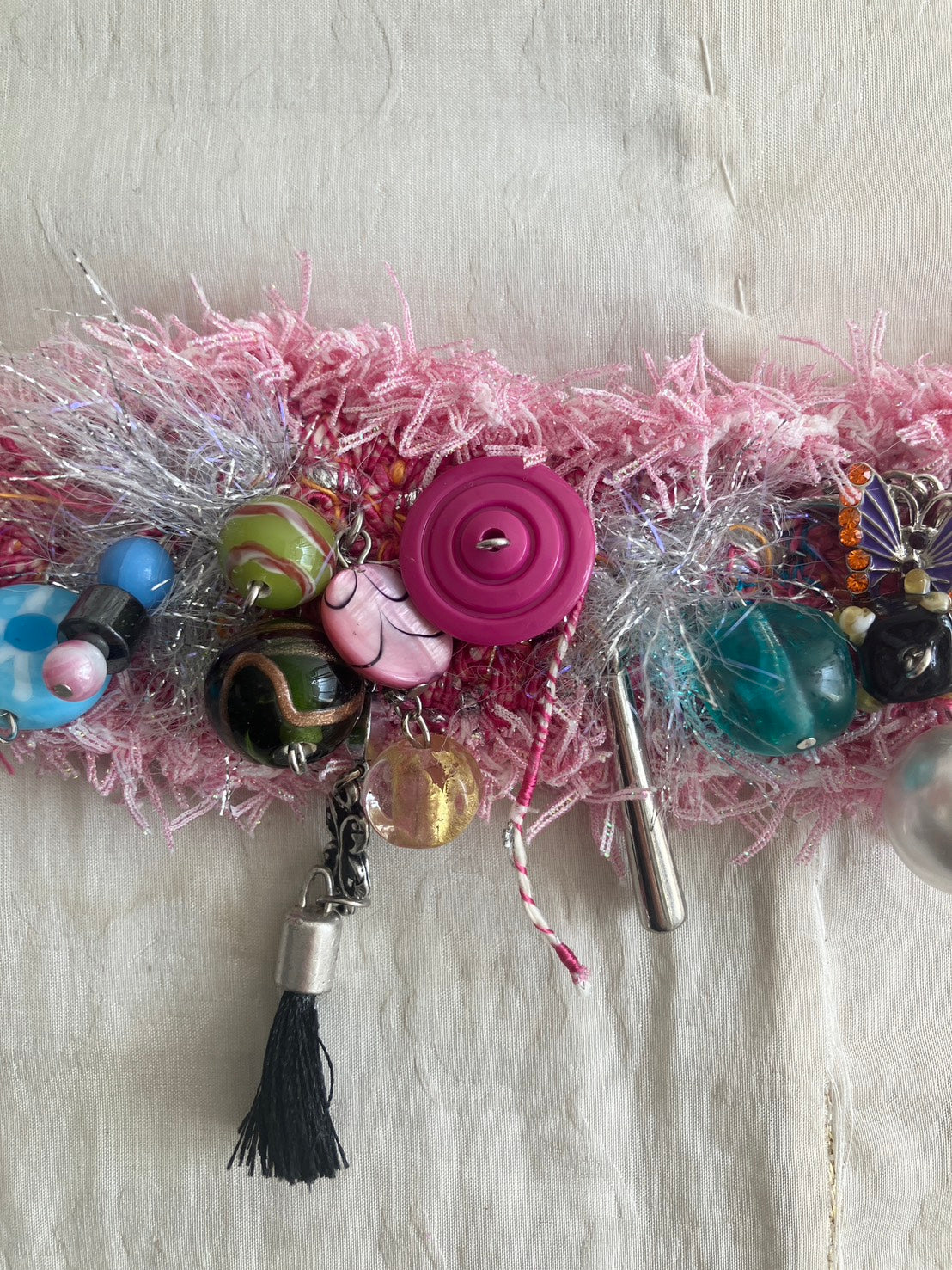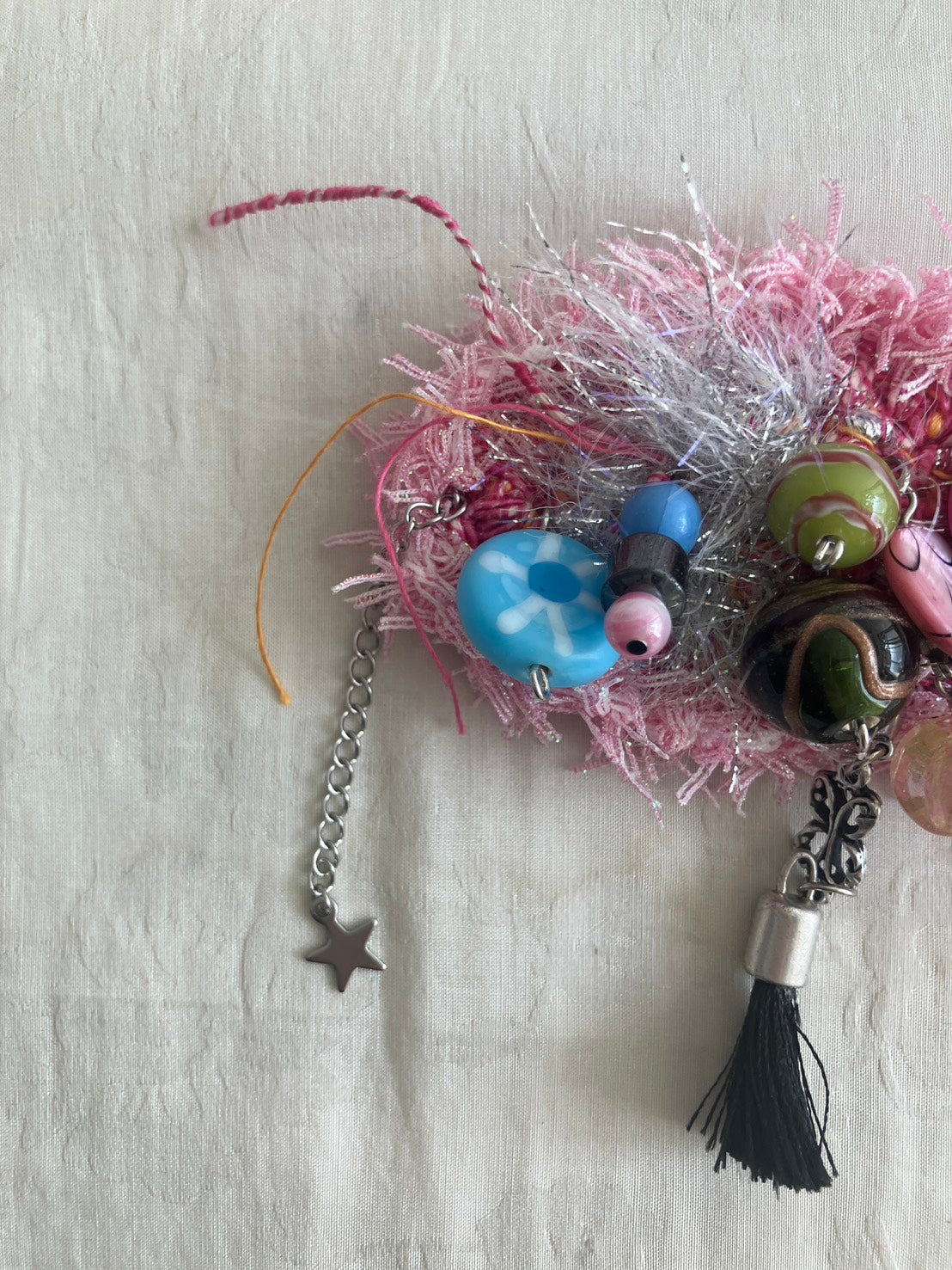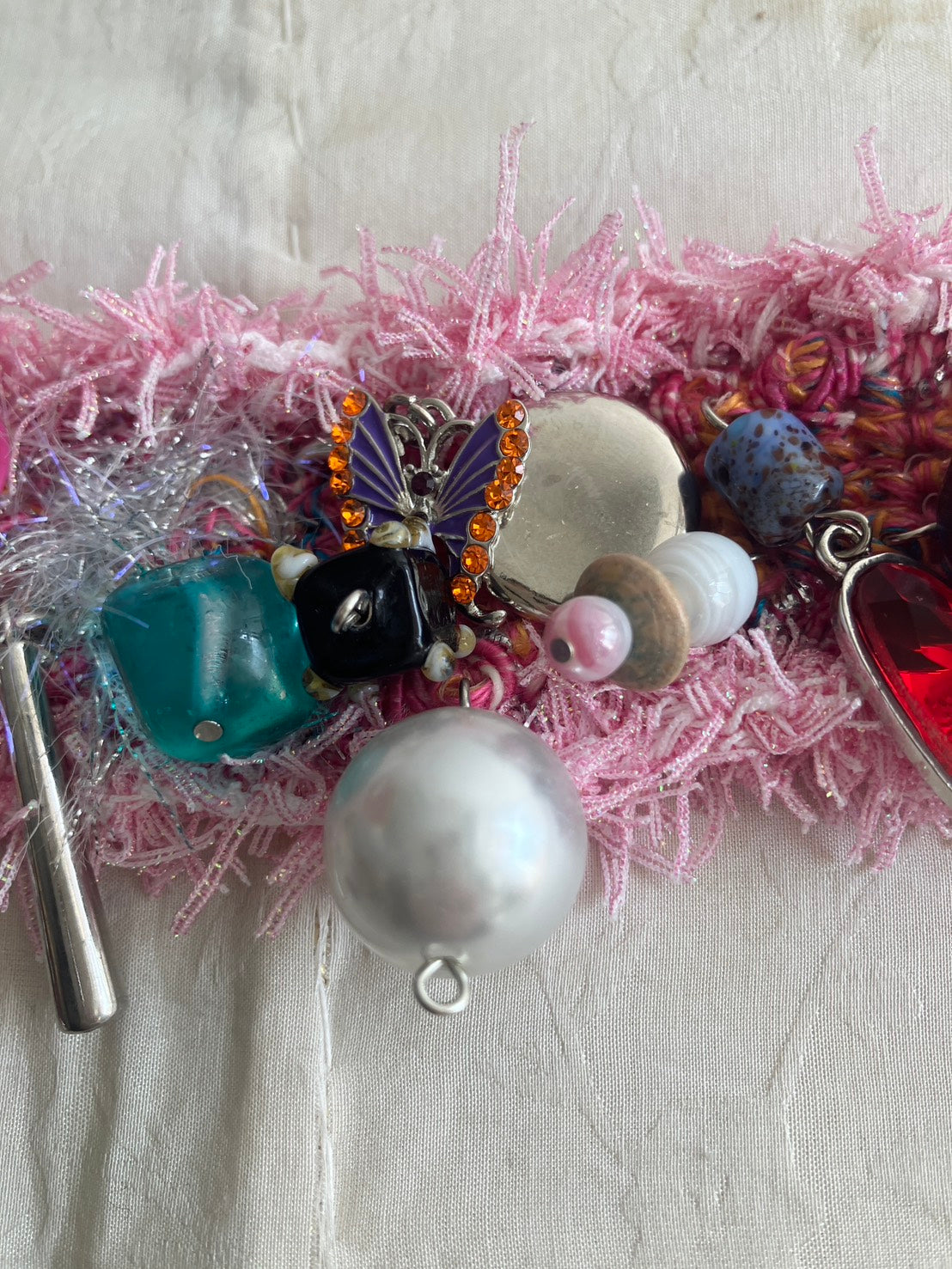ヴィンテージのビーズやボタン、宝物のようなチャームがたっぷりくっついていて、完全に一点ものです。