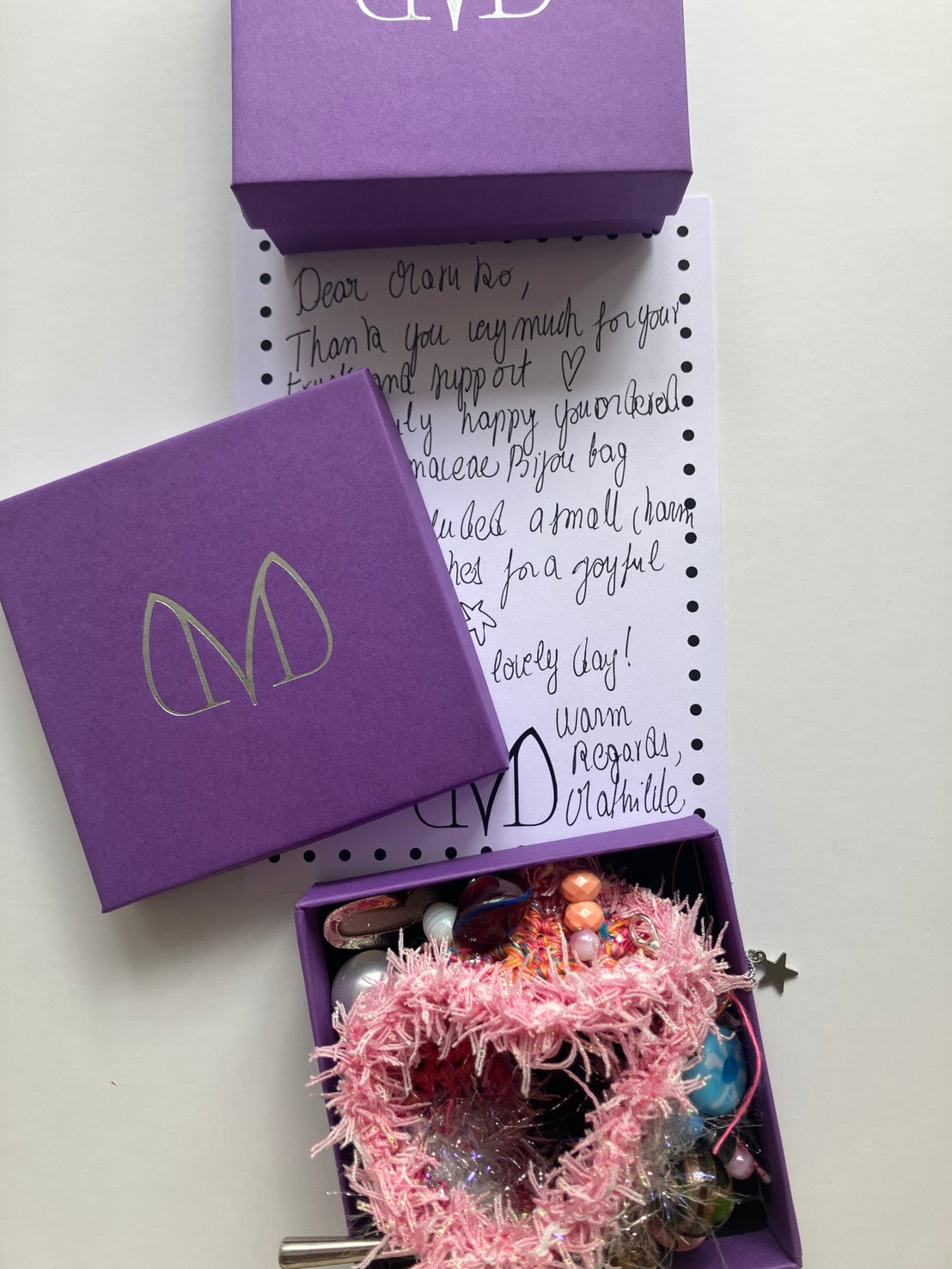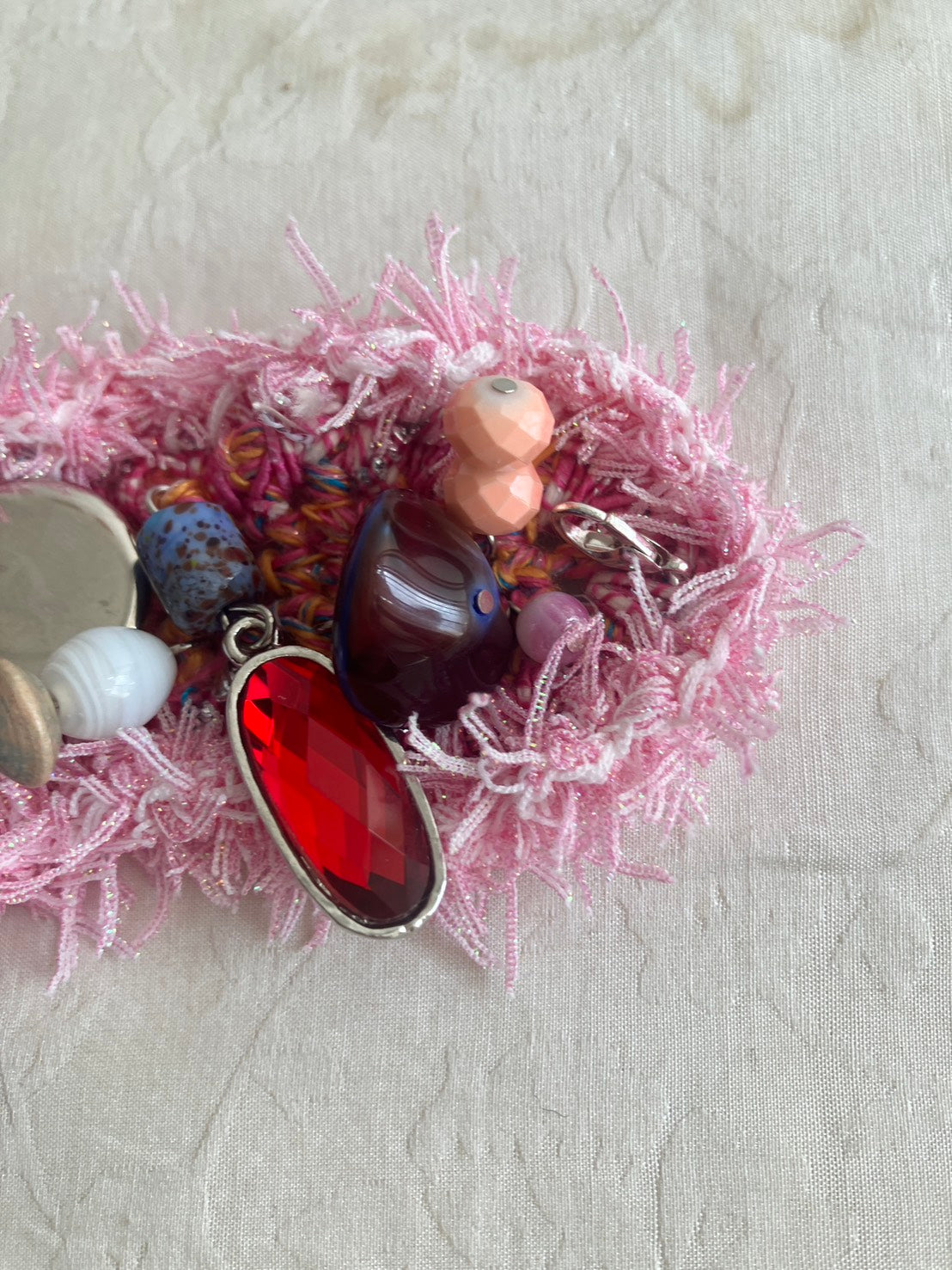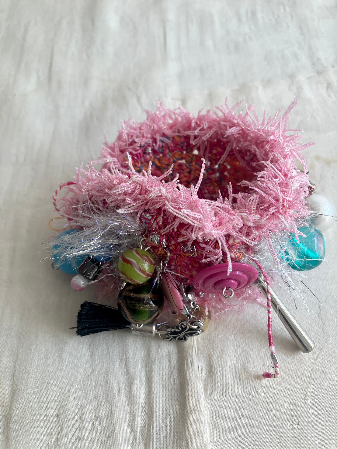 ヴィンテージのビーズやボタン、宝物のようなチャームがたっぷりくっついていて、完全に一点ものです。