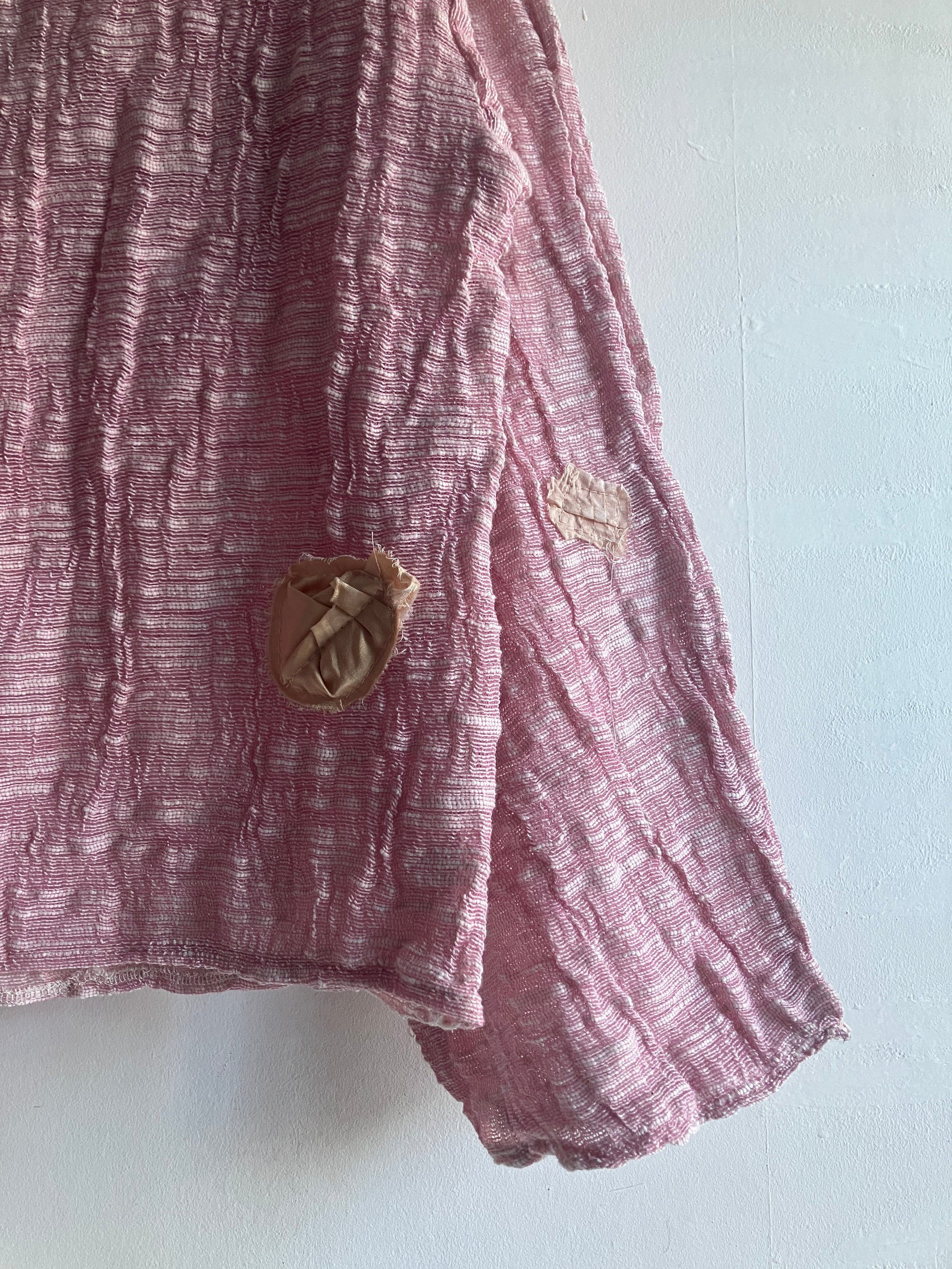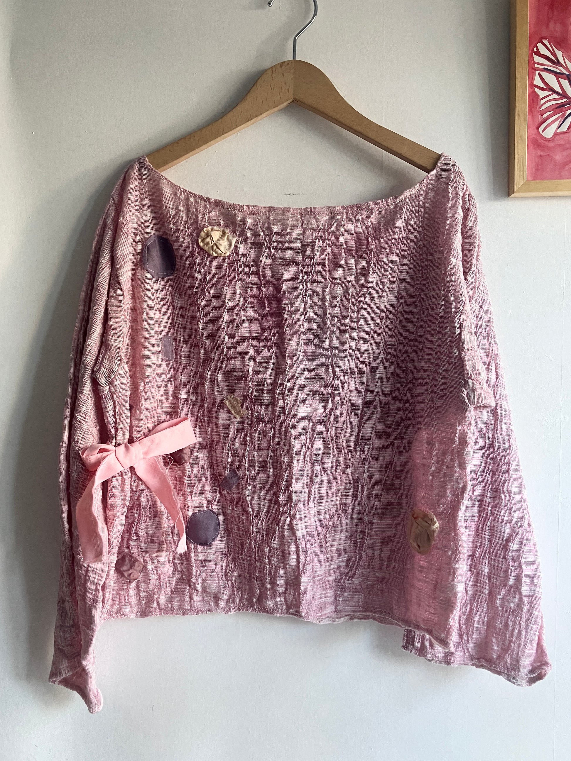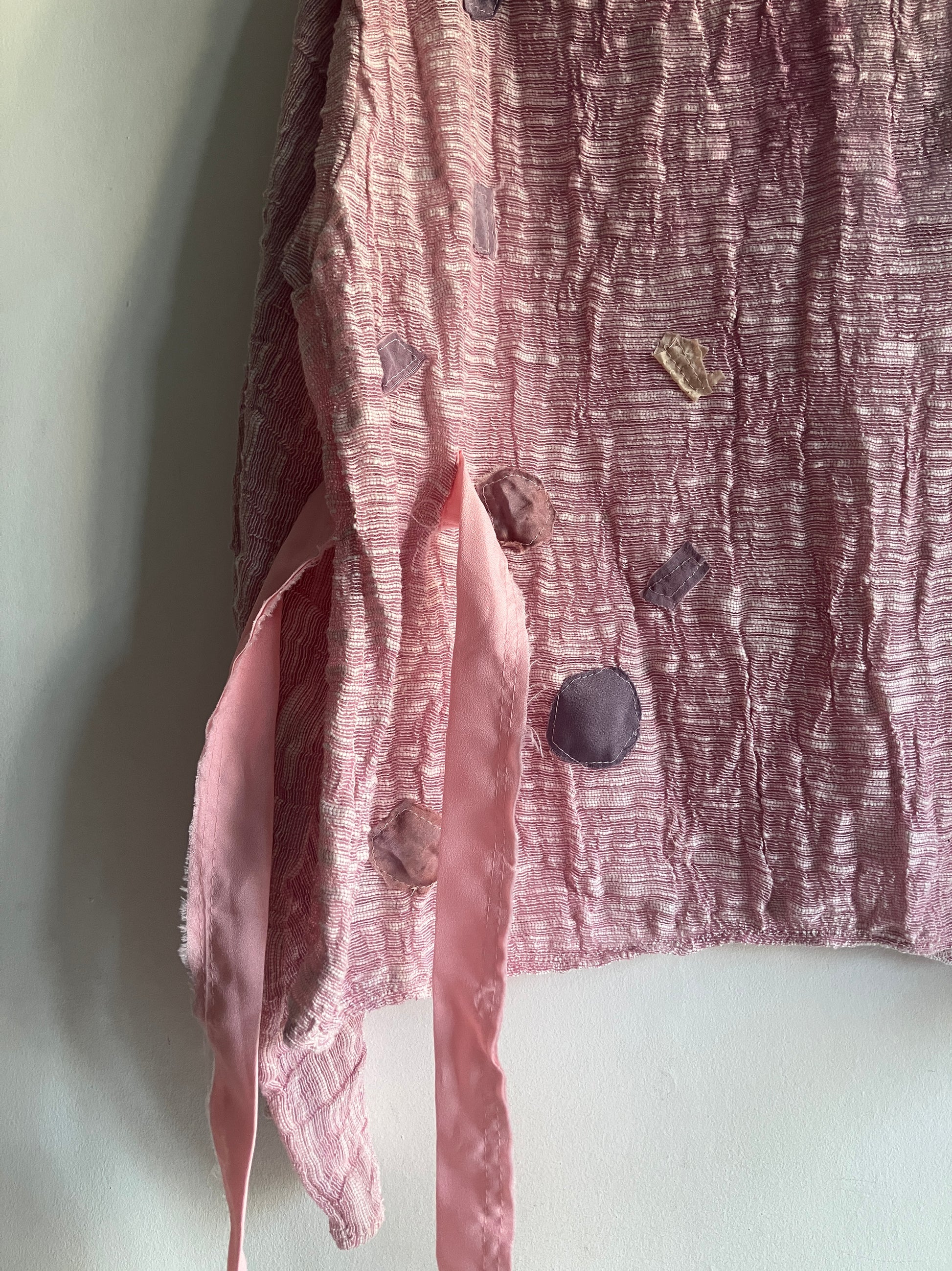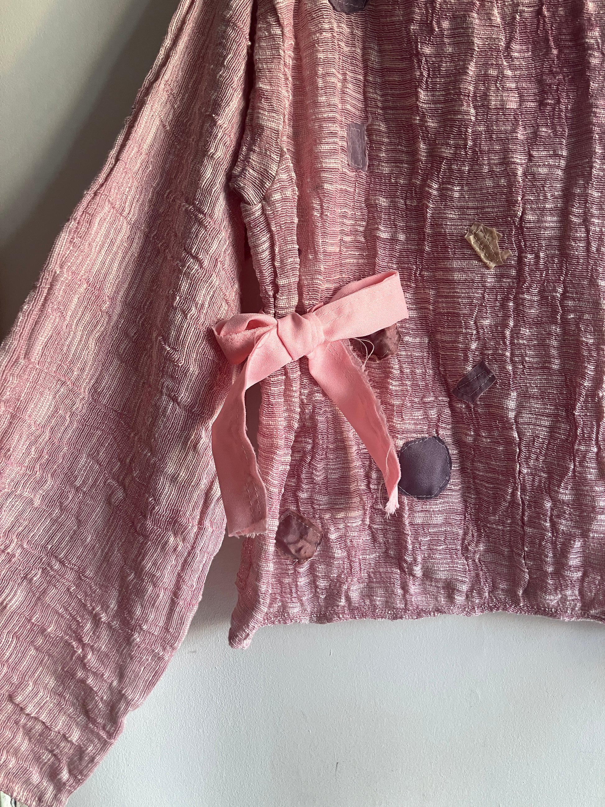 コチニール染めしたピンクのコットンガーゼの生地に、ドットのアップリケやリボンで装飾されたトップス。