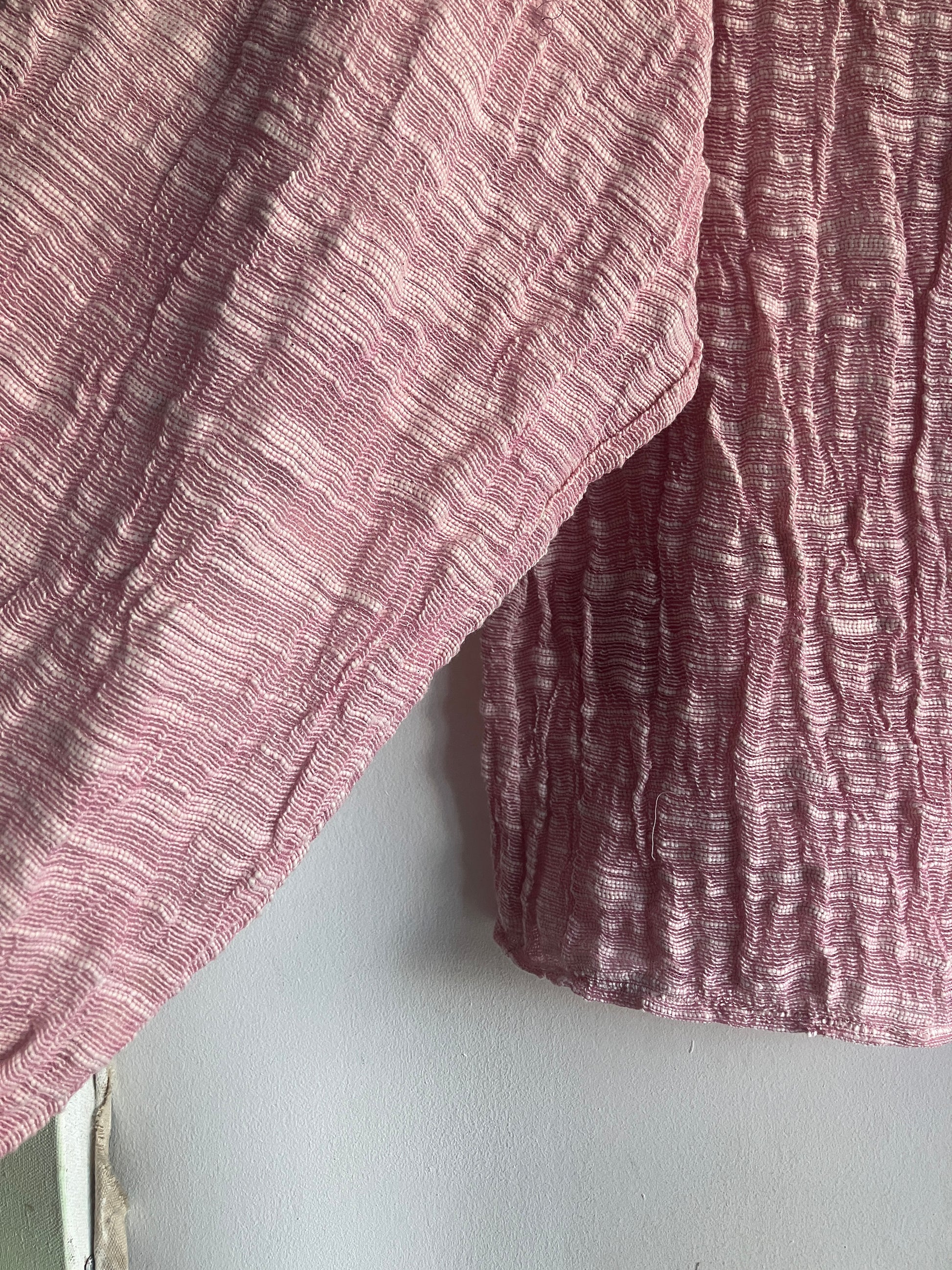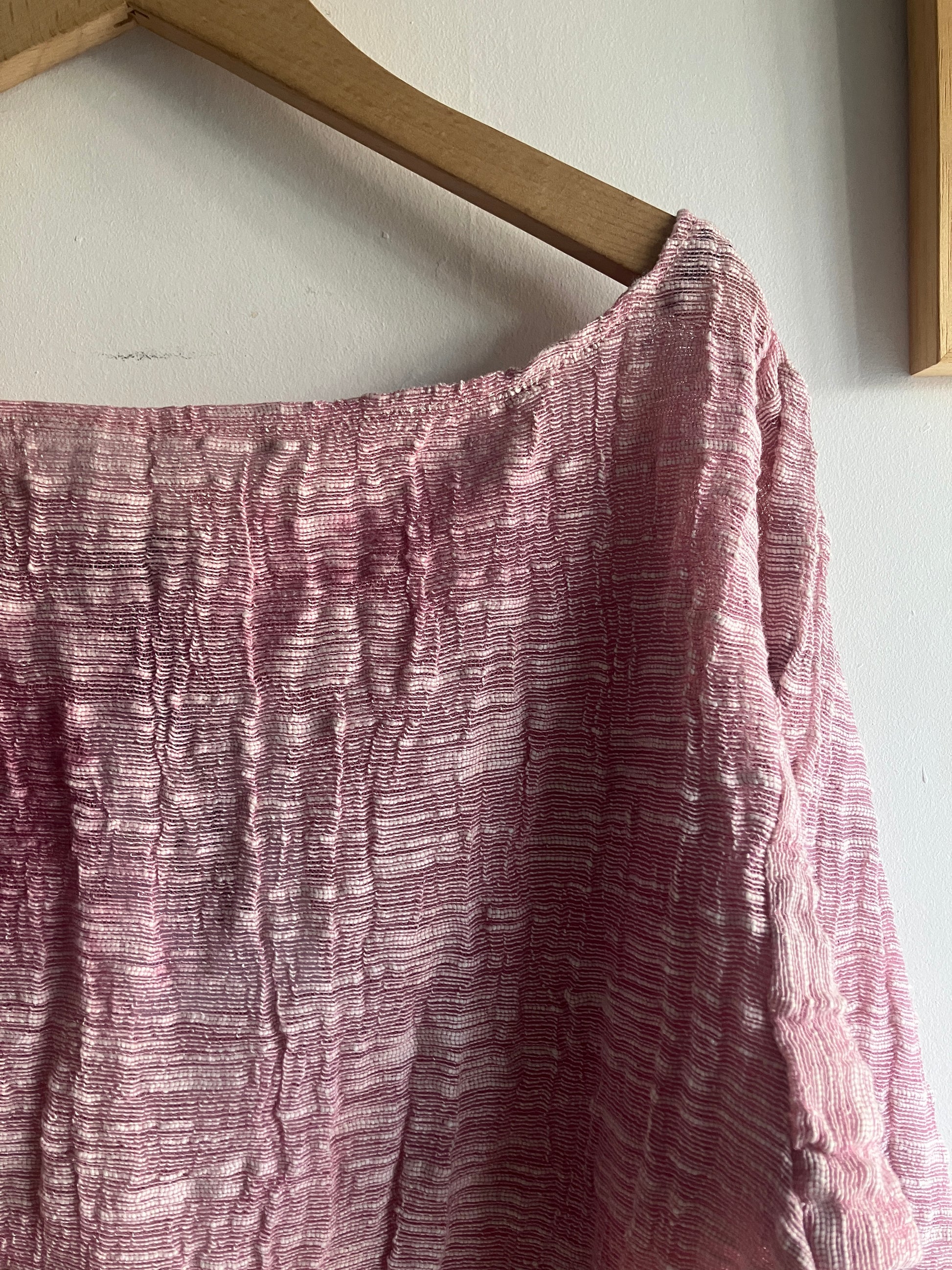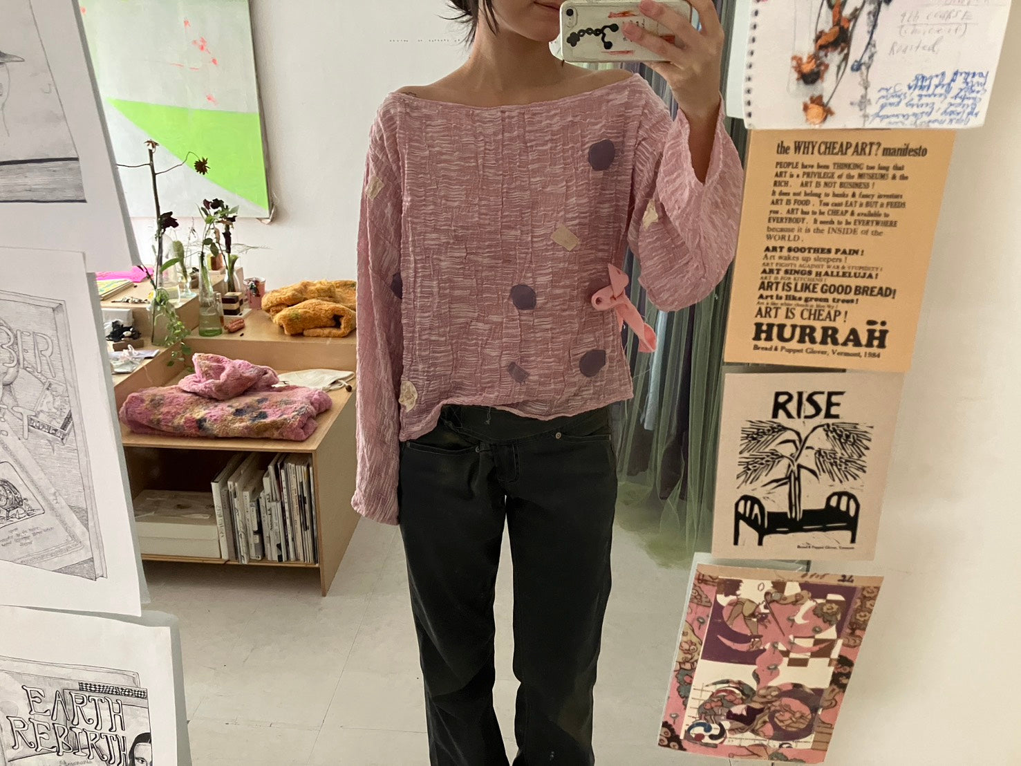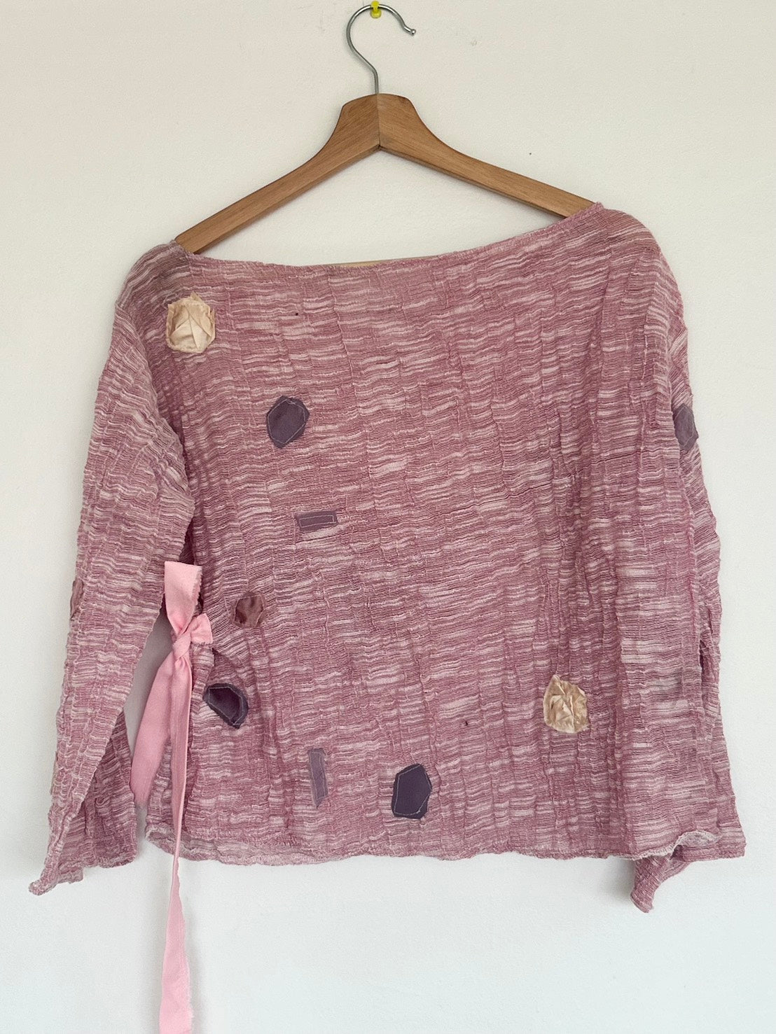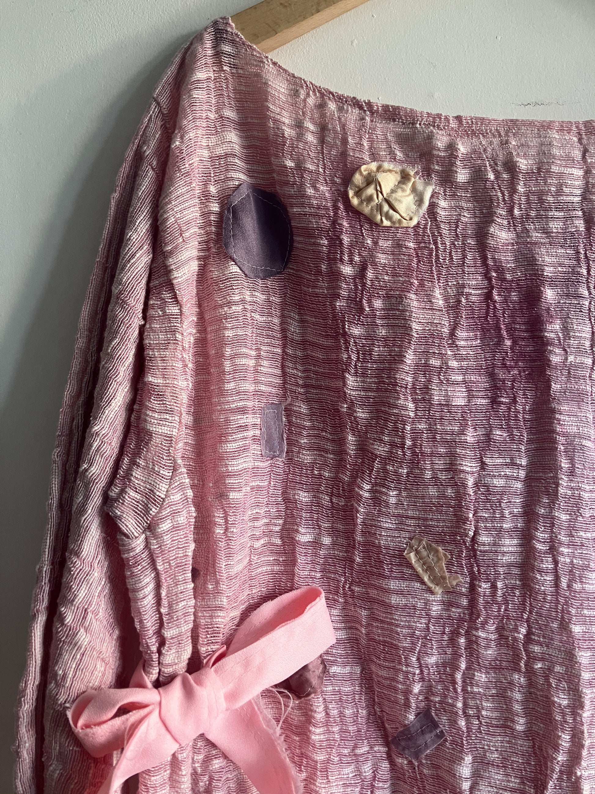 コチニール染めしたピンクのコットンガーゼの生地に、ドットのアップリケやリボンで装飾されたトップス。