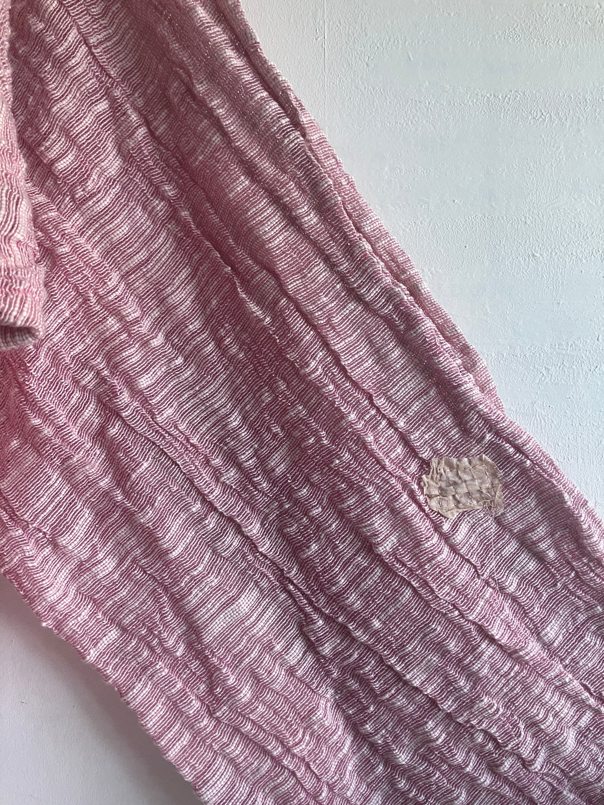 ところどころに、黒いシミのような部分がありますが、汚れではなくコチニール染め特有の変色で紫色になっている部分です。あらかじめご了承ください。