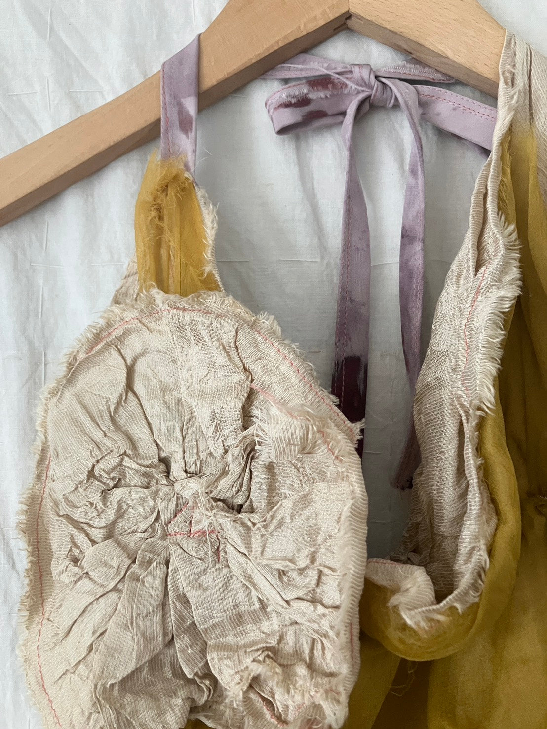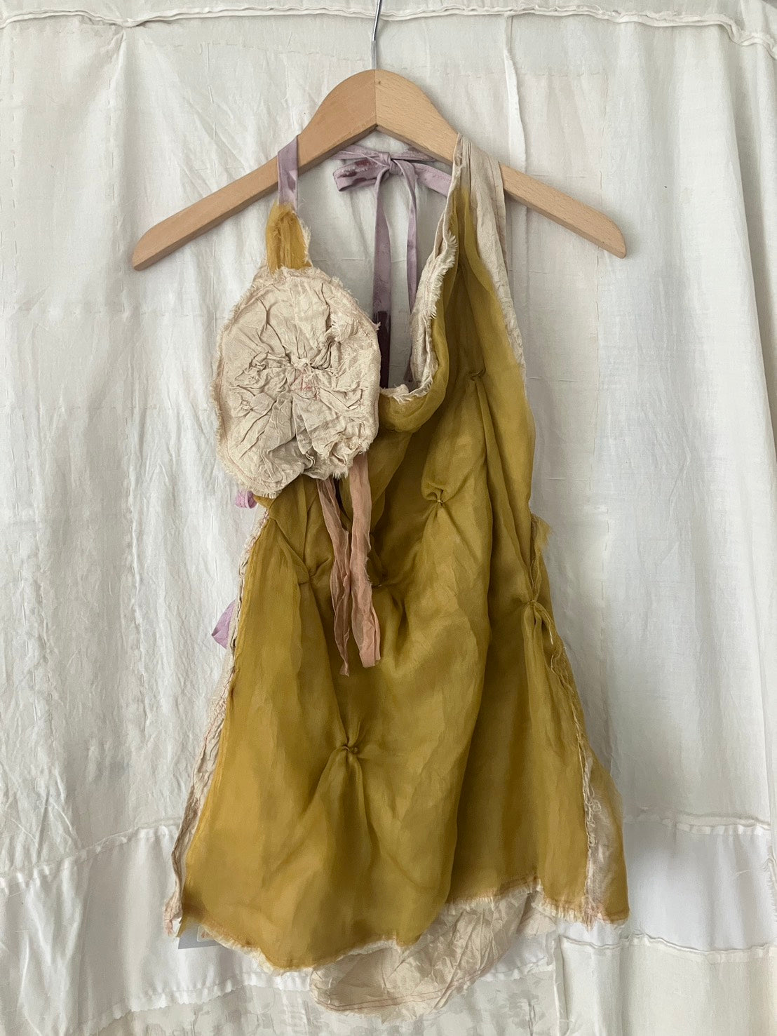 植物性染料で手染めし、お花のようなアップリケや絞りの装飾が手作業で施してあります。ホルター部分の紐までオリジナルの染色模様で、細部まで見惚れてしまうかわいさです。