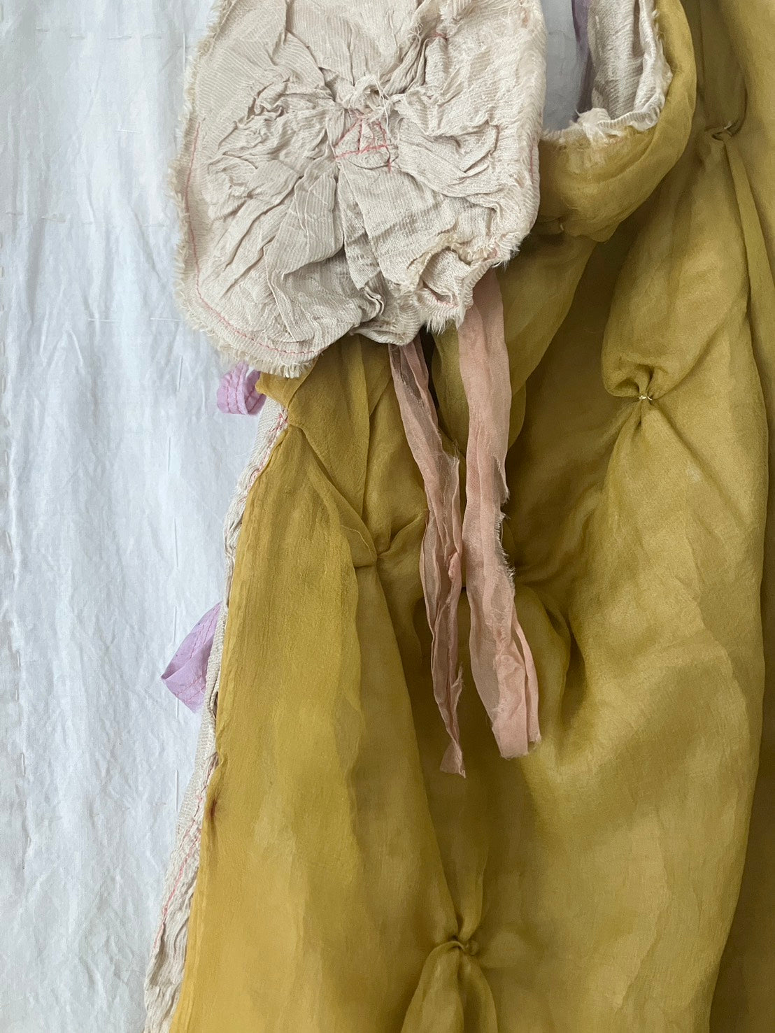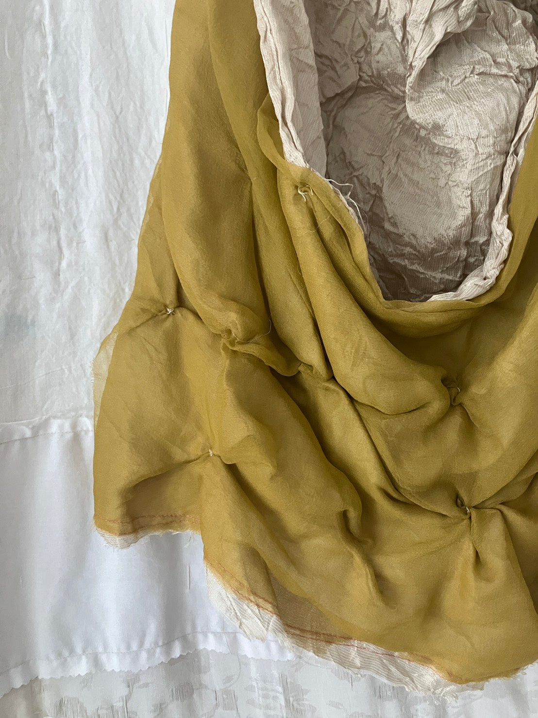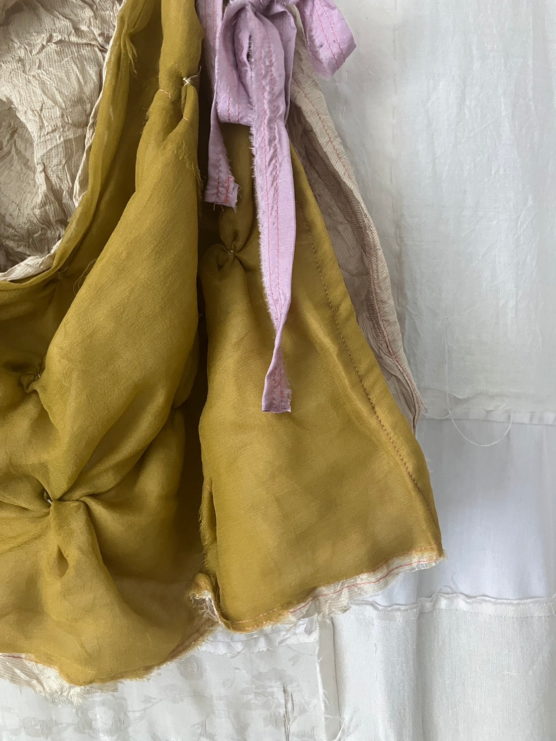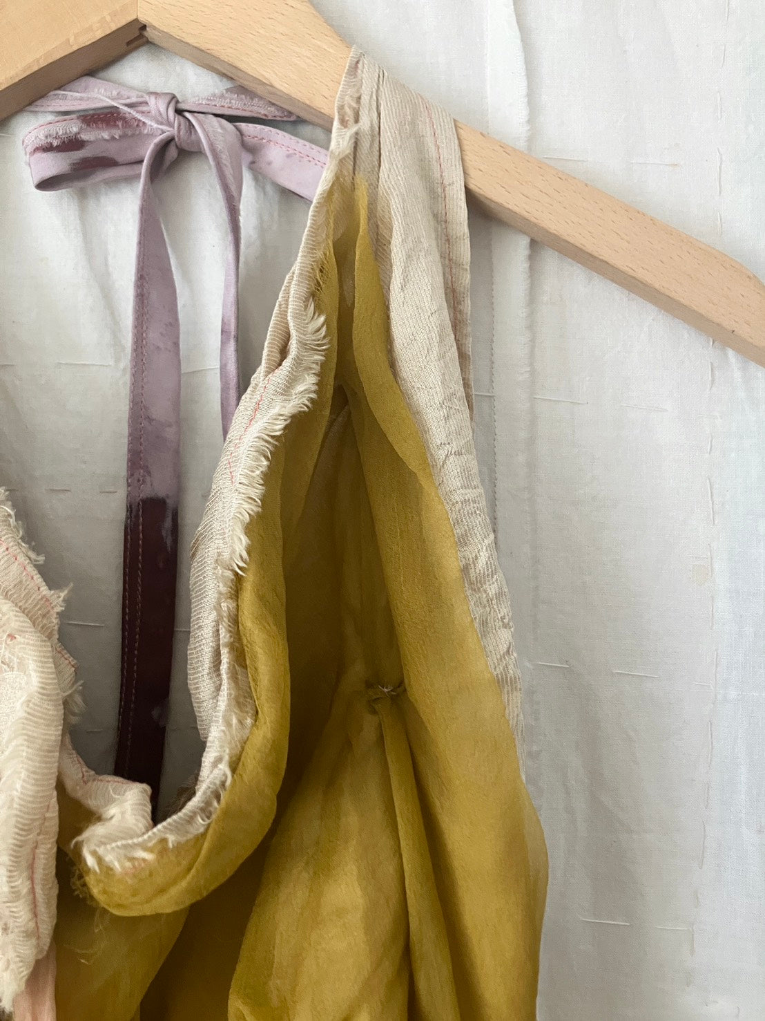 デッドストック・アップサイクル生地のみを使用し、自然染料を使った手染色、絞りやパッチワーク等の手仕事が詰まっています。作品は全て本人の手作りで、一点ものです。