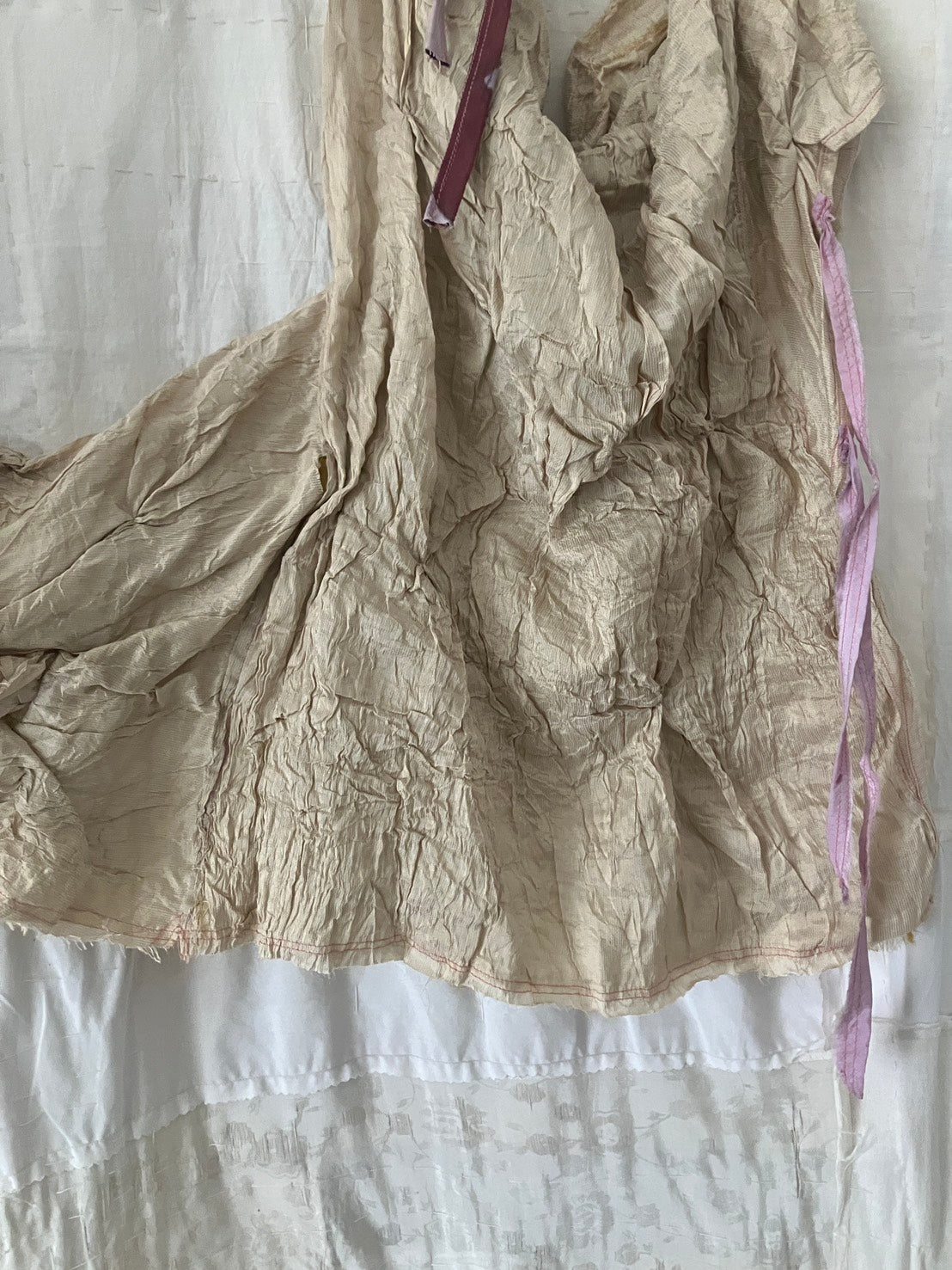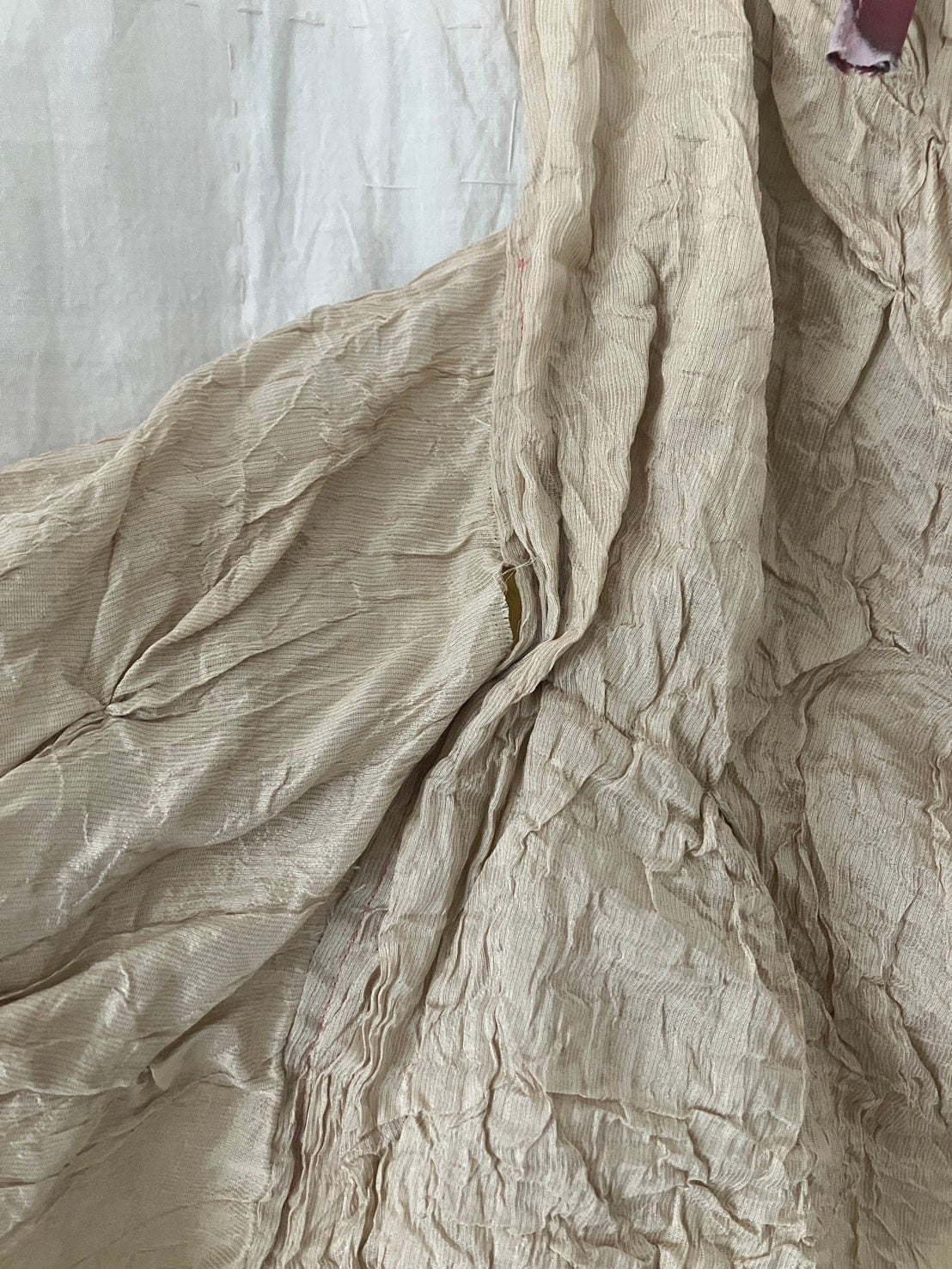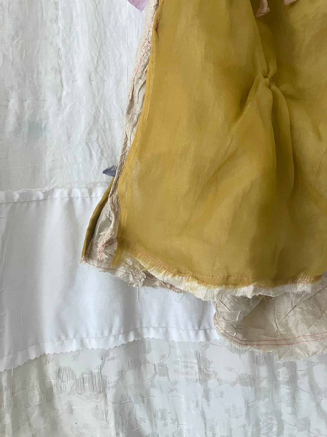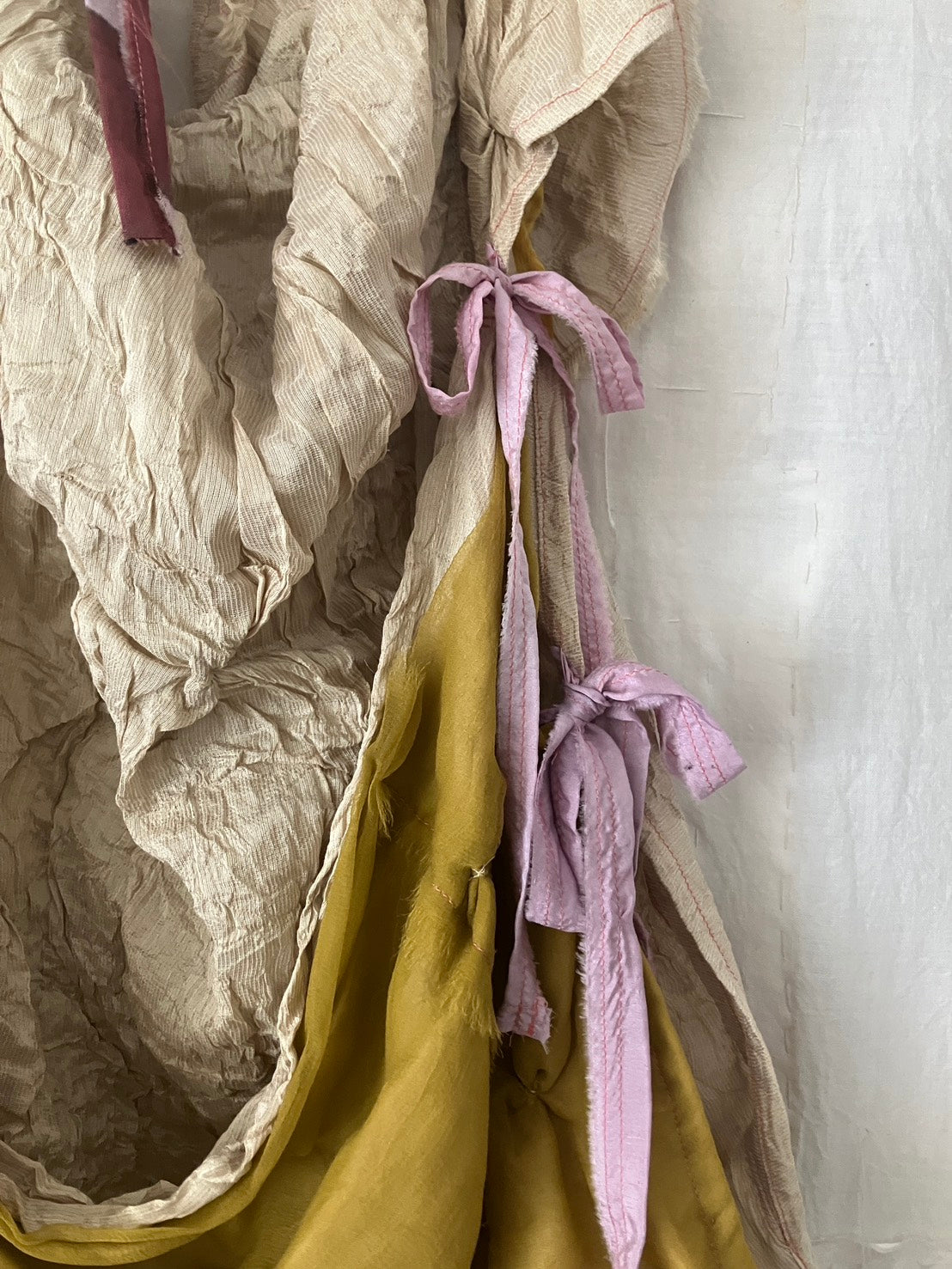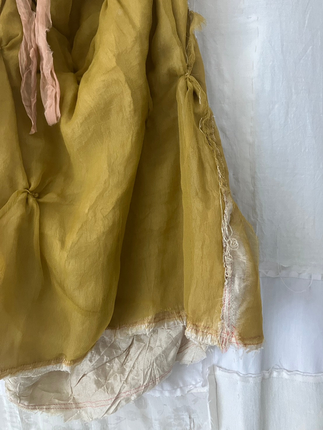 デッドストック・アップサイクル生地のみを使用し、自然染料を使った手染色、絞りやパッチワーク等の手仕事が詰まっています。作品は全て本人の手作りで、一点ものです。
