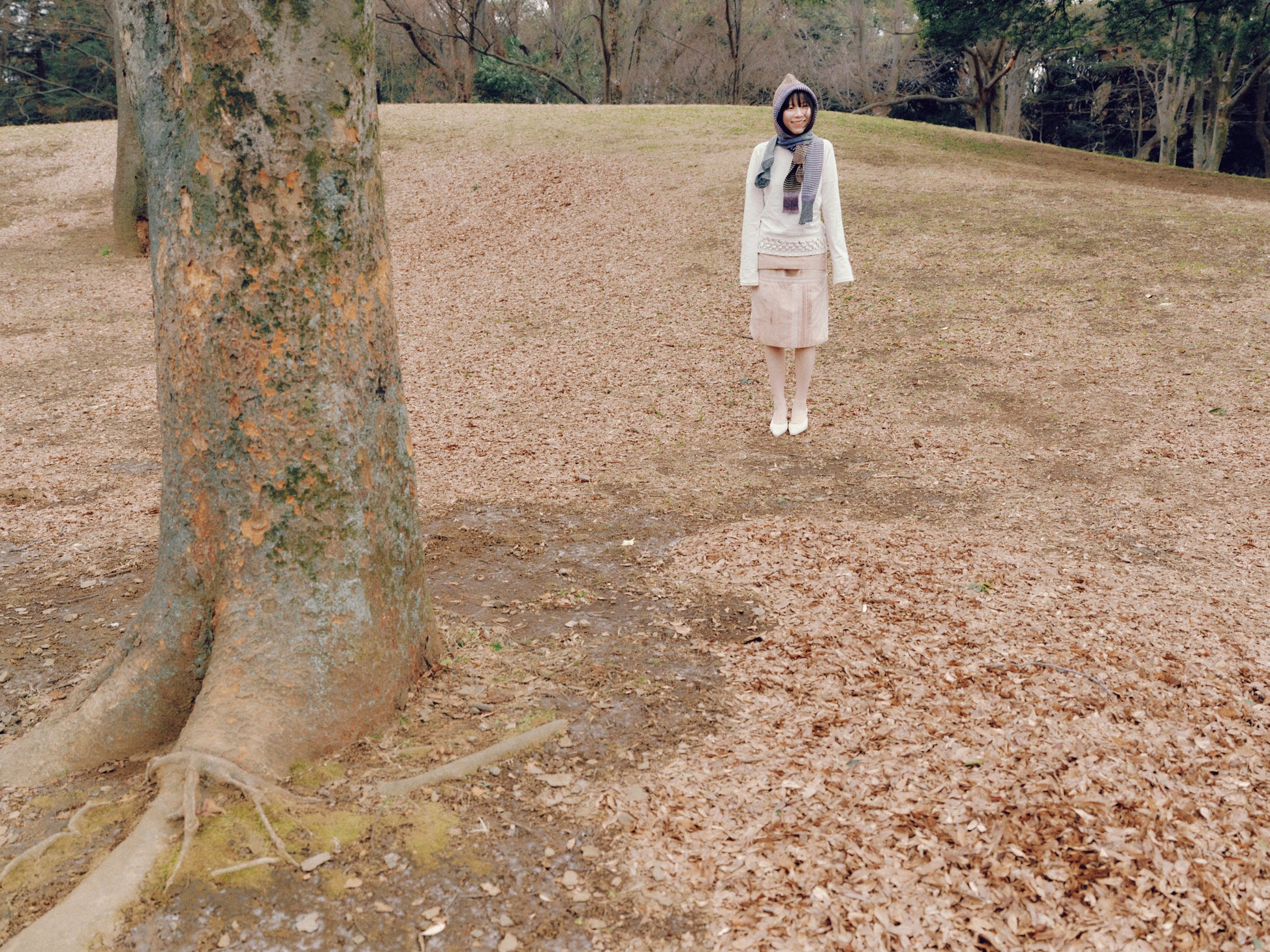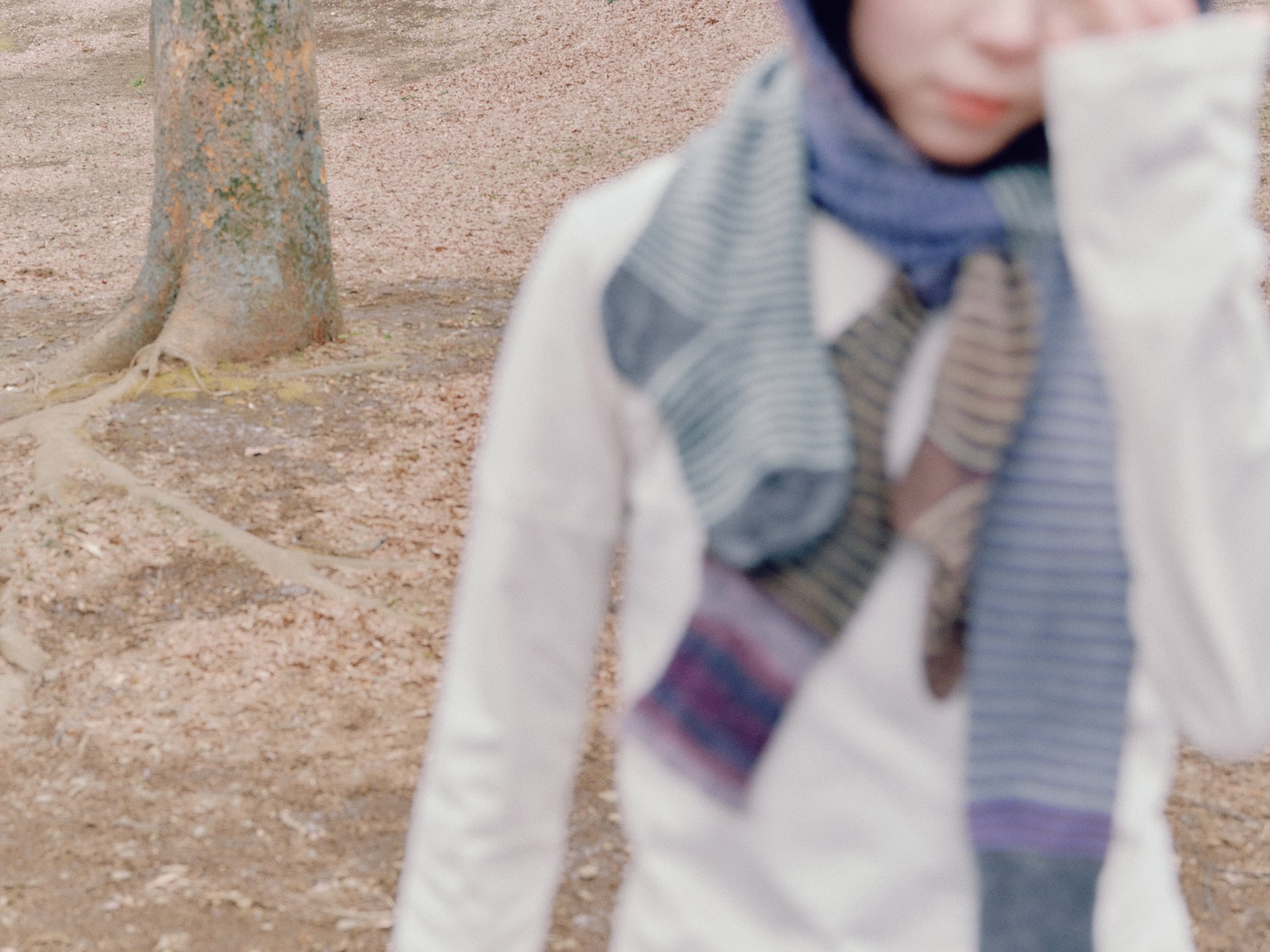 さまざまな色や素材の毛糸を組み合わせて、長い片足の靴下のようになっています。とても軽量ですが、ふわふわとしていて暖かく、コートと一緒に真冬にも、かろやかな羽織と一緒に春先にも愛用できそうです。