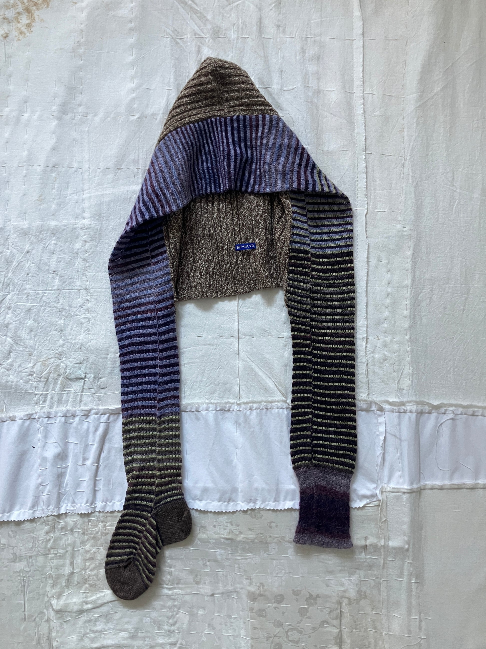 ちゃんと脱いだはずの靴下の片方が見当たらない。誰もが一度は体験したことがあるはずの、この体験に思考を巡らせるGhostly Sock Odysseyプロジェクトから生まれたマフラーにフードが付属したデザイン。