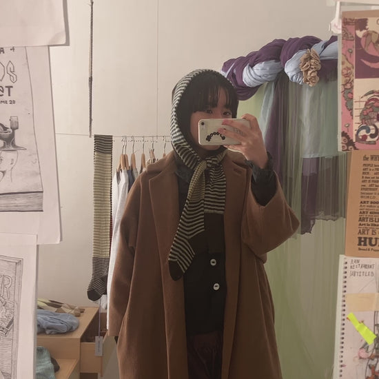 とても軽量で、ふわふわとしていて暖かく、スカーフ部分の結び方を工夫することで様々なスタイルのフードを楽しめます。フード部分は2色の対照的な糸を一緒に編み込むことで、繊細な混色調が表現されています。
