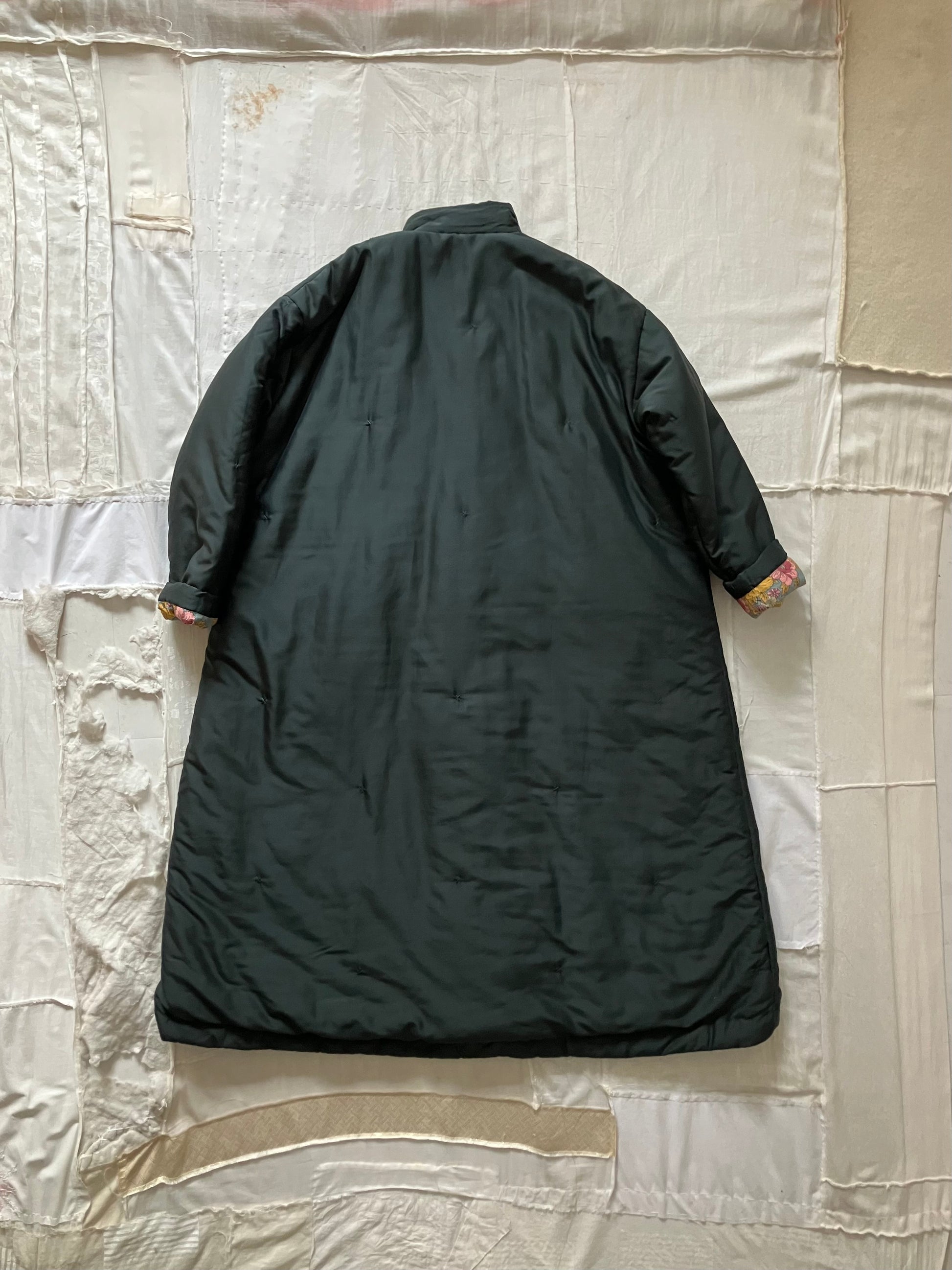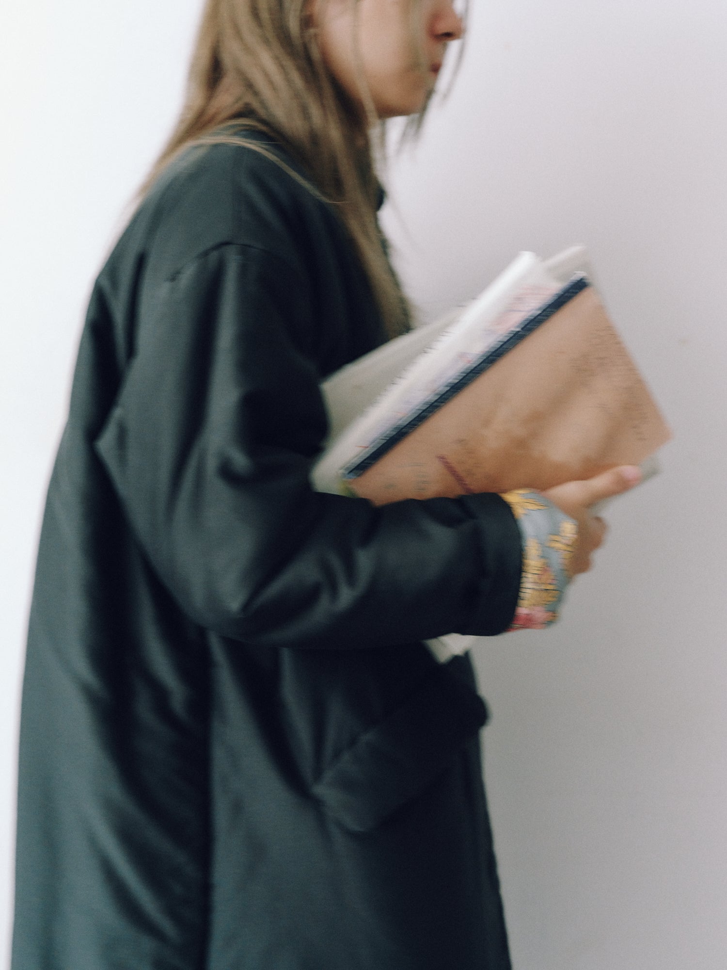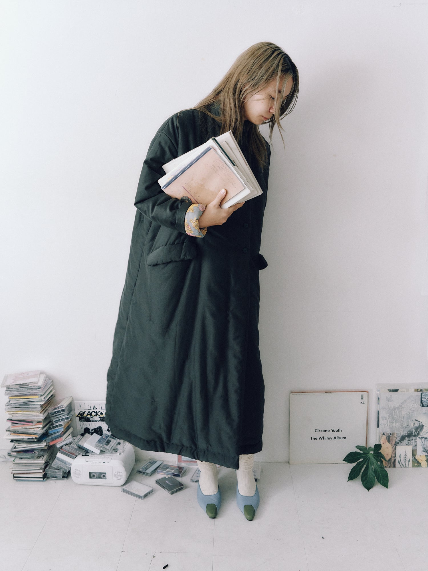 「着る人に寄り添う美しさ、あなただけの秘密の瞬間を創り出す服づくりを大切にしています。cuddle coatの裏地には最も美しい花柄シルクコットンを使用しました。風が吹いて裾がめくれ上がるまで誰にも見えない、明るく陽気な花々が隠されています。ゆったりとしたひととき、袖口の内側を覗き込み、あなただけのためにあるその魅力を再確認する姿を想像します。」