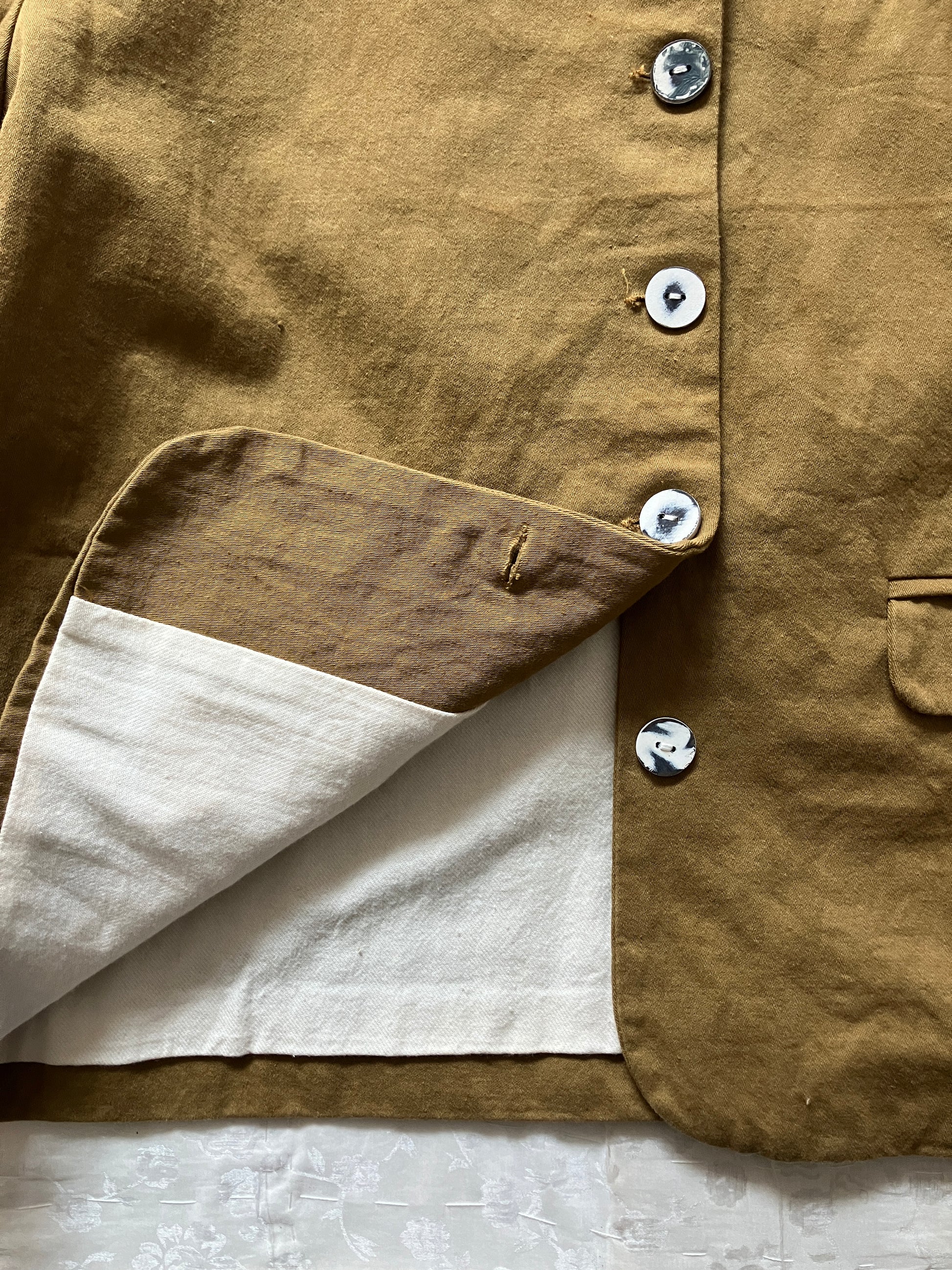 首元はトップまでボタンで閉められるようになっていて、手作りの木製ボタンの表情が、デザインにちいさな魅力をプラスしています。