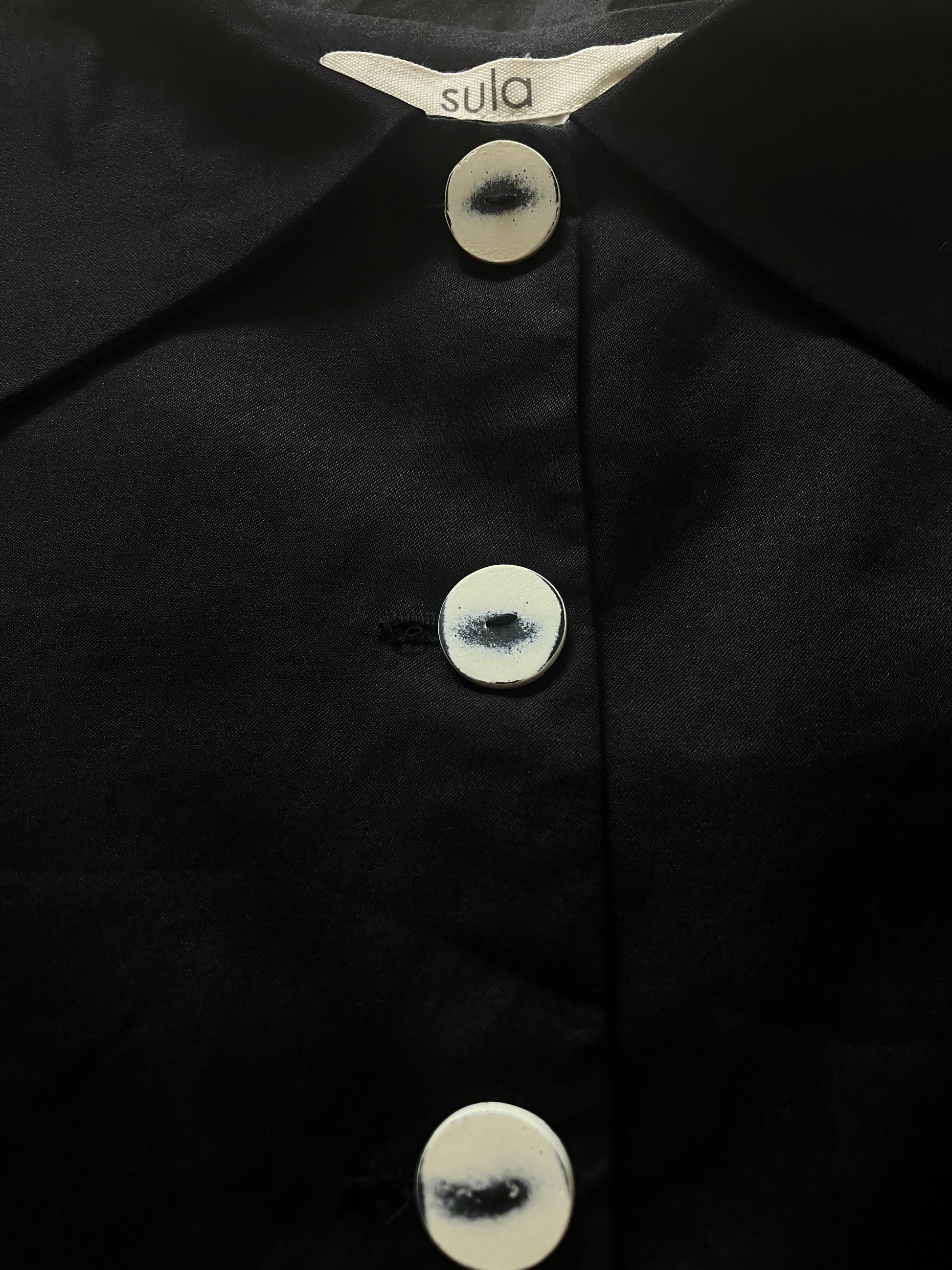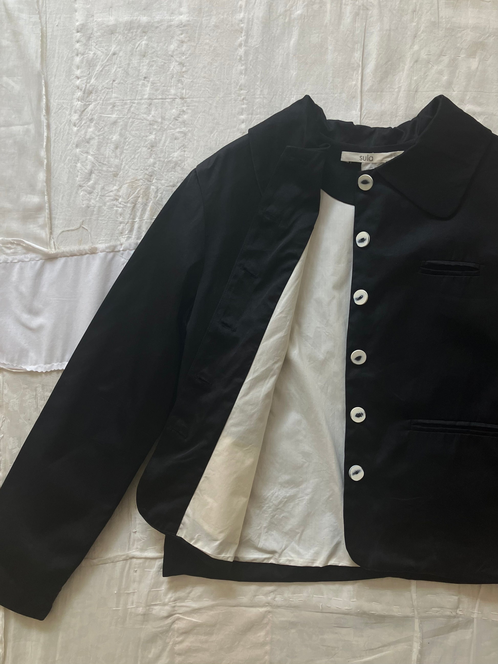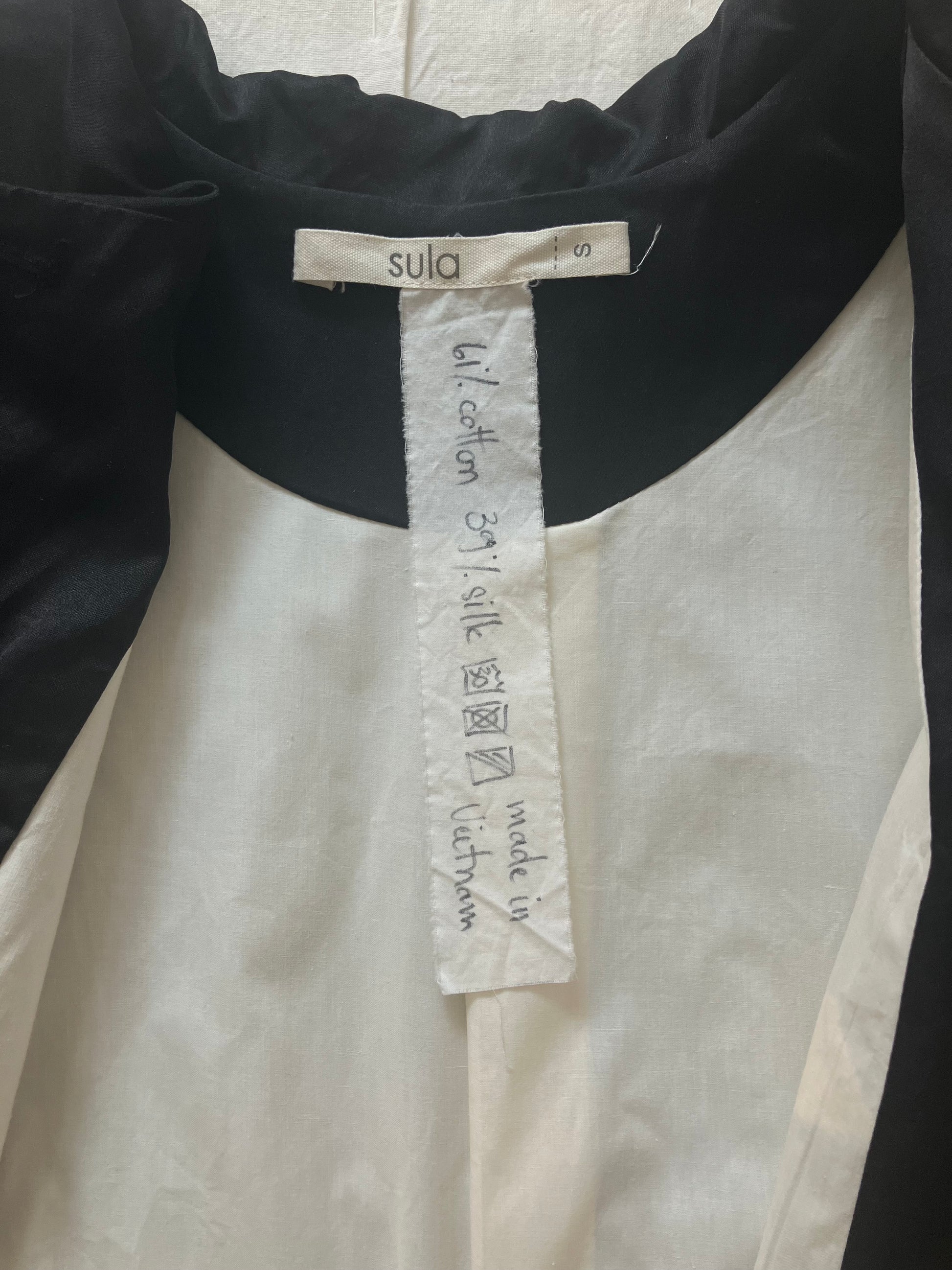 パリッとしていて厚みのあるコットンシルクで、控えめな艶感もあります。混ざりけのないブラックですが、sula独特の洗い晒しのような風合いのある生地です。真っ白なコットン生地で裏地を仕立てています。