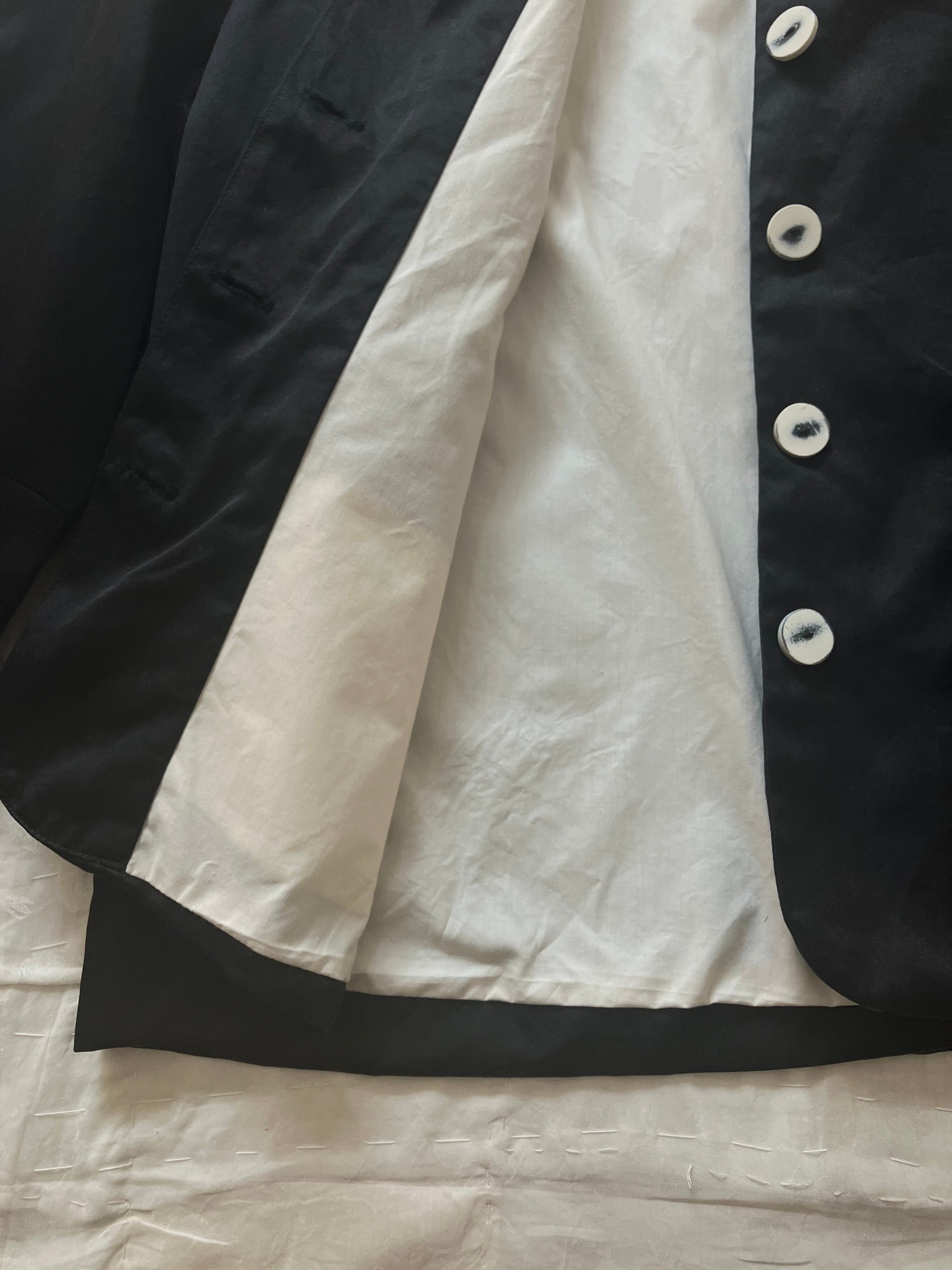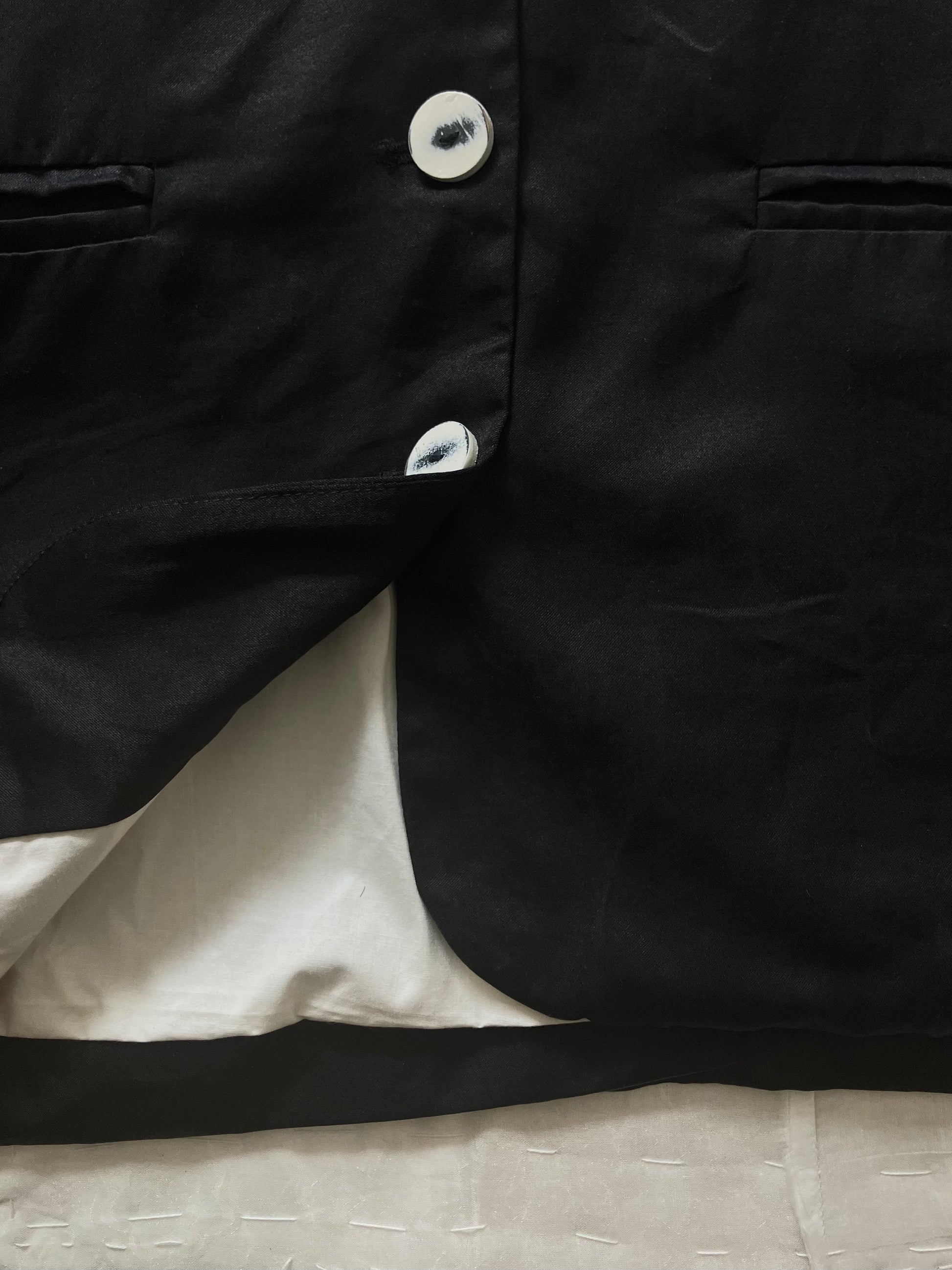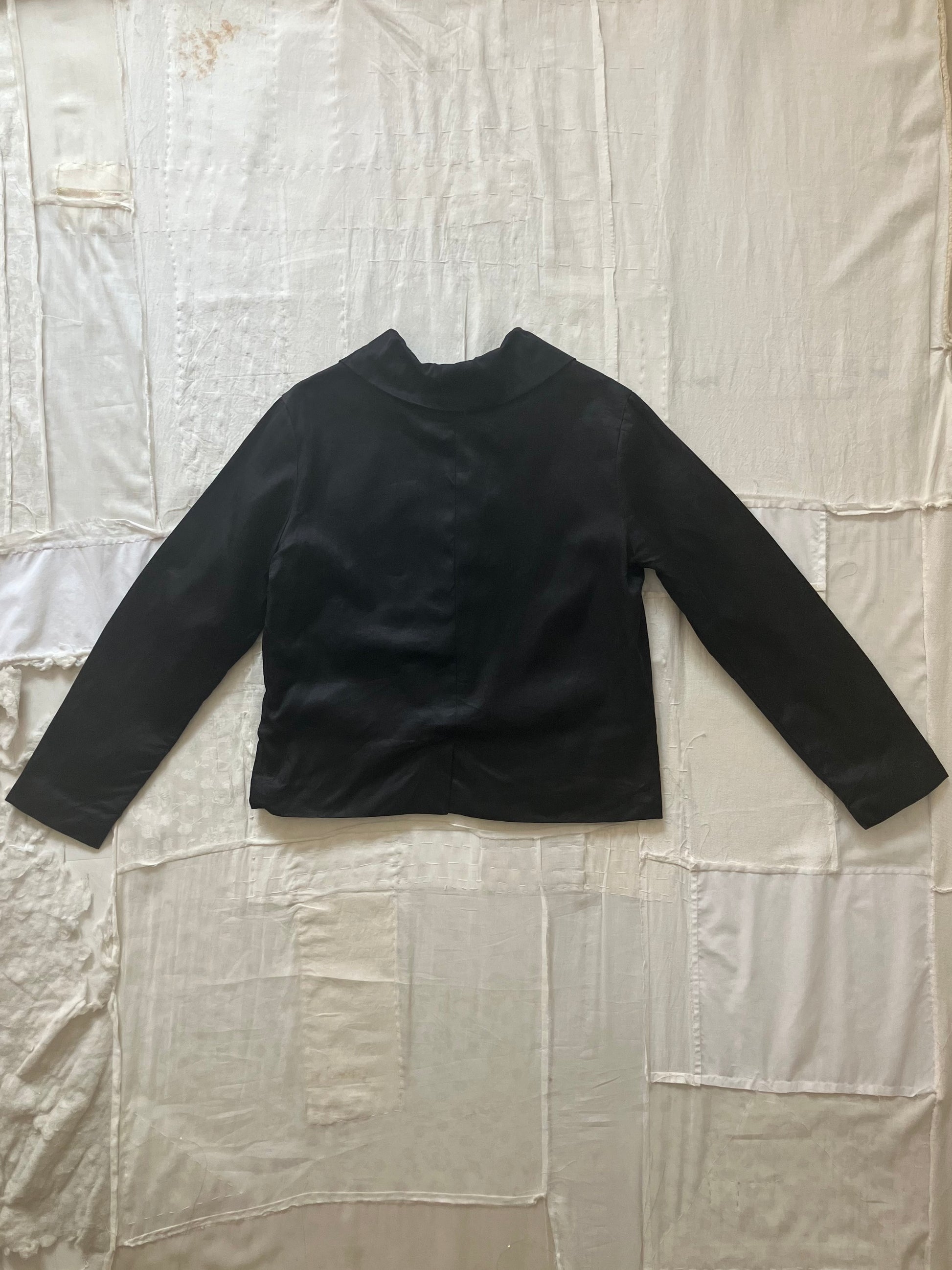 パリッとしていて厚みのあるコットンシルクで、控えめな艶感もあります。混ざりけのないブラックですが、sula独特の洗い晒しのような風合いのある生地です。真っ白なコットン生地で裏地を仕立てています。