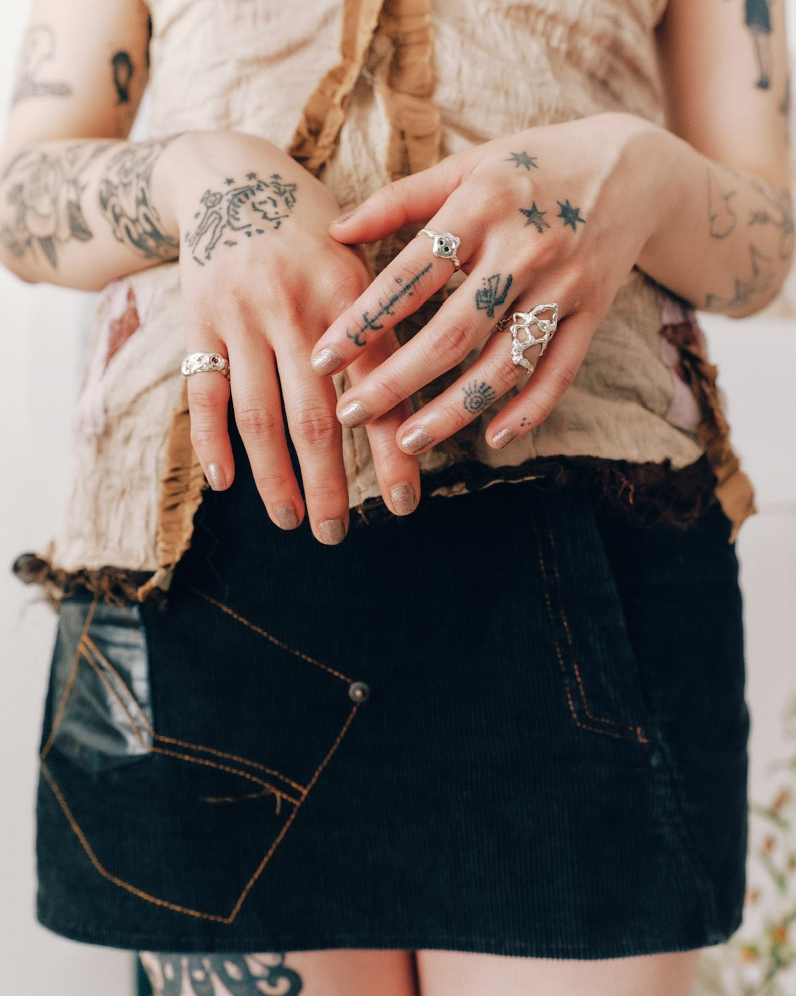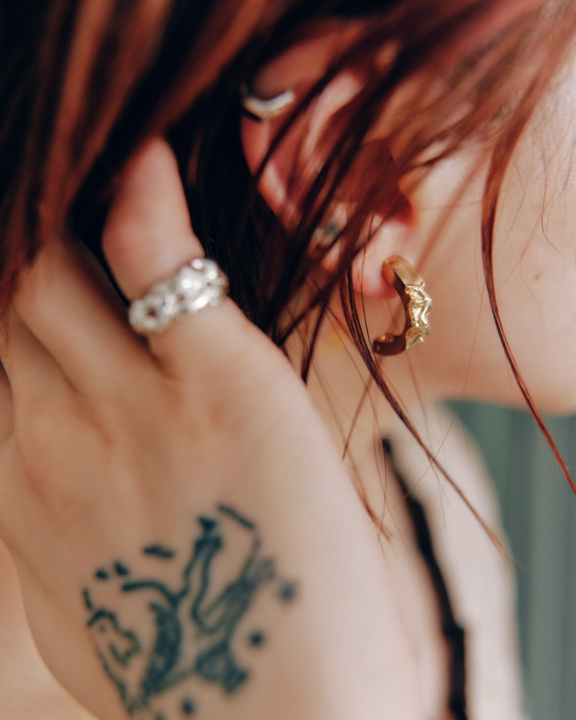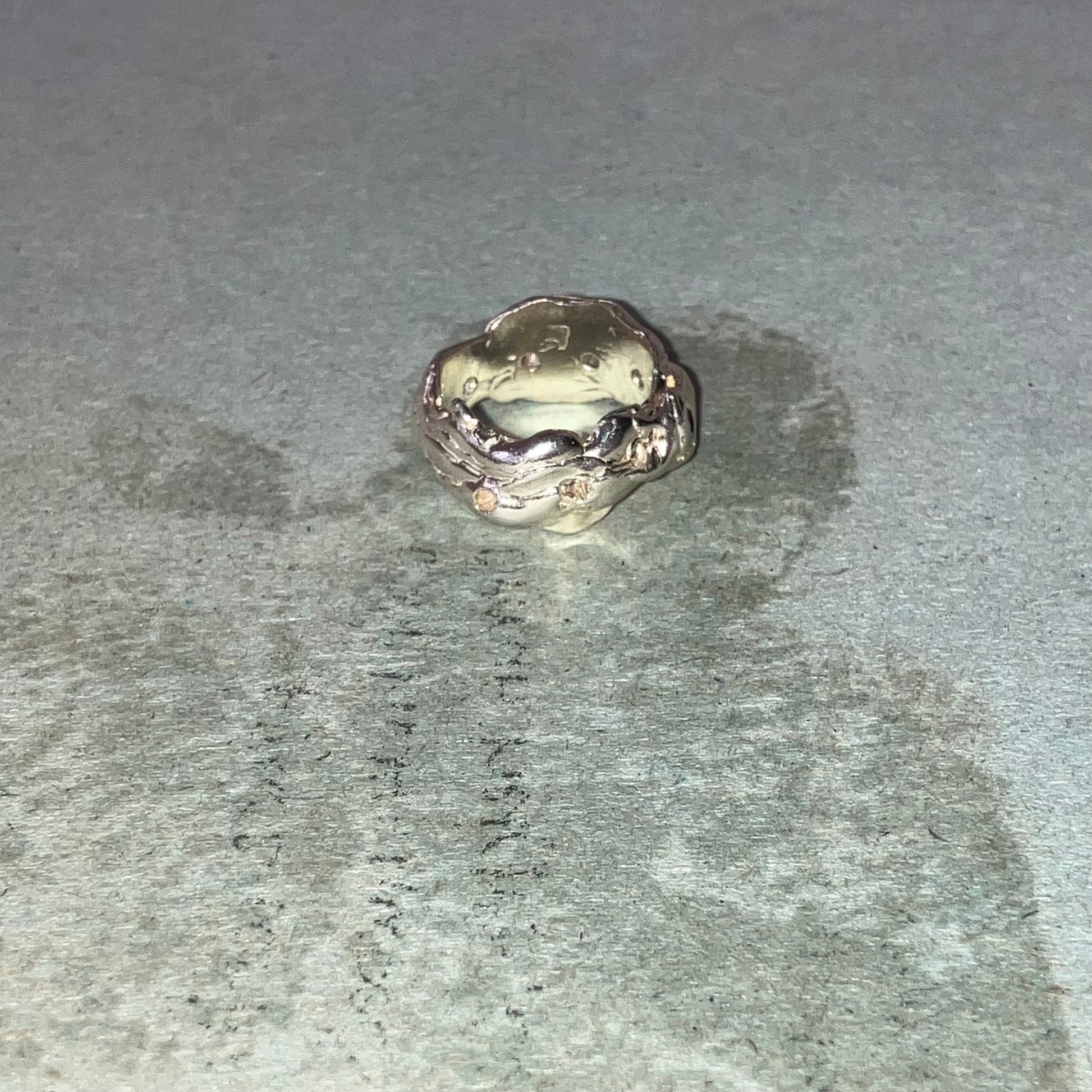 でこぼこと動きのあるフォルムや、小さなストーンの輝きなど、繊細な魅力のある一点ものですが、それぞれにどこか力強い印象も感じます。