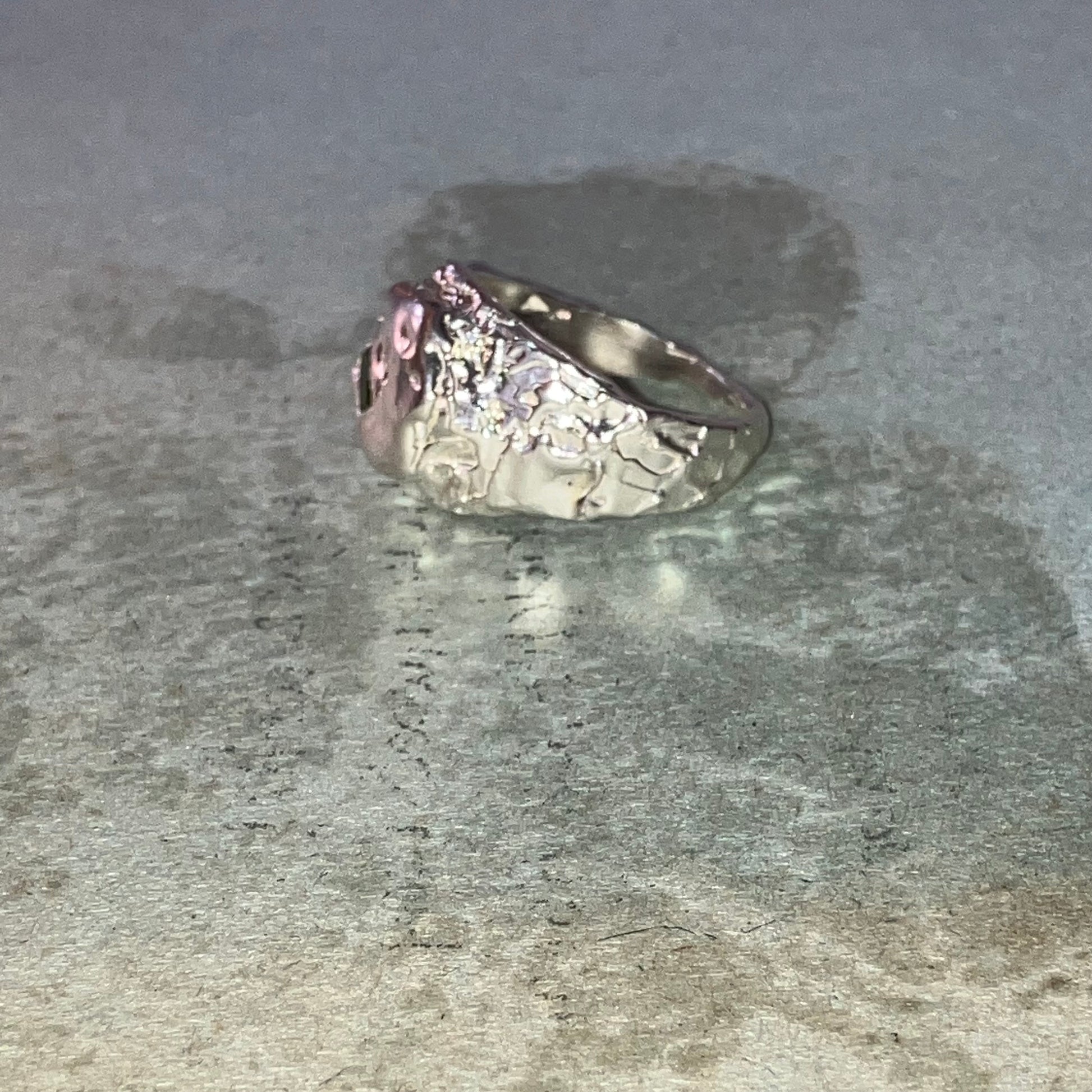 ストーンが埋め込まれた立体的なシルエットのリング。
