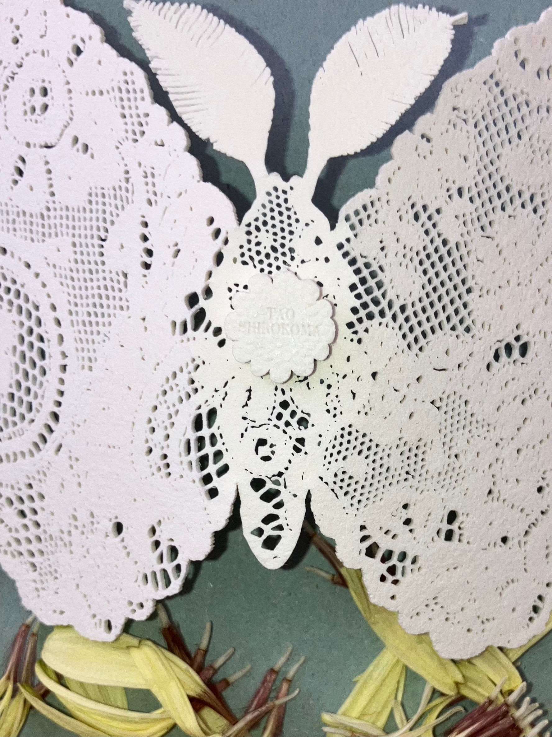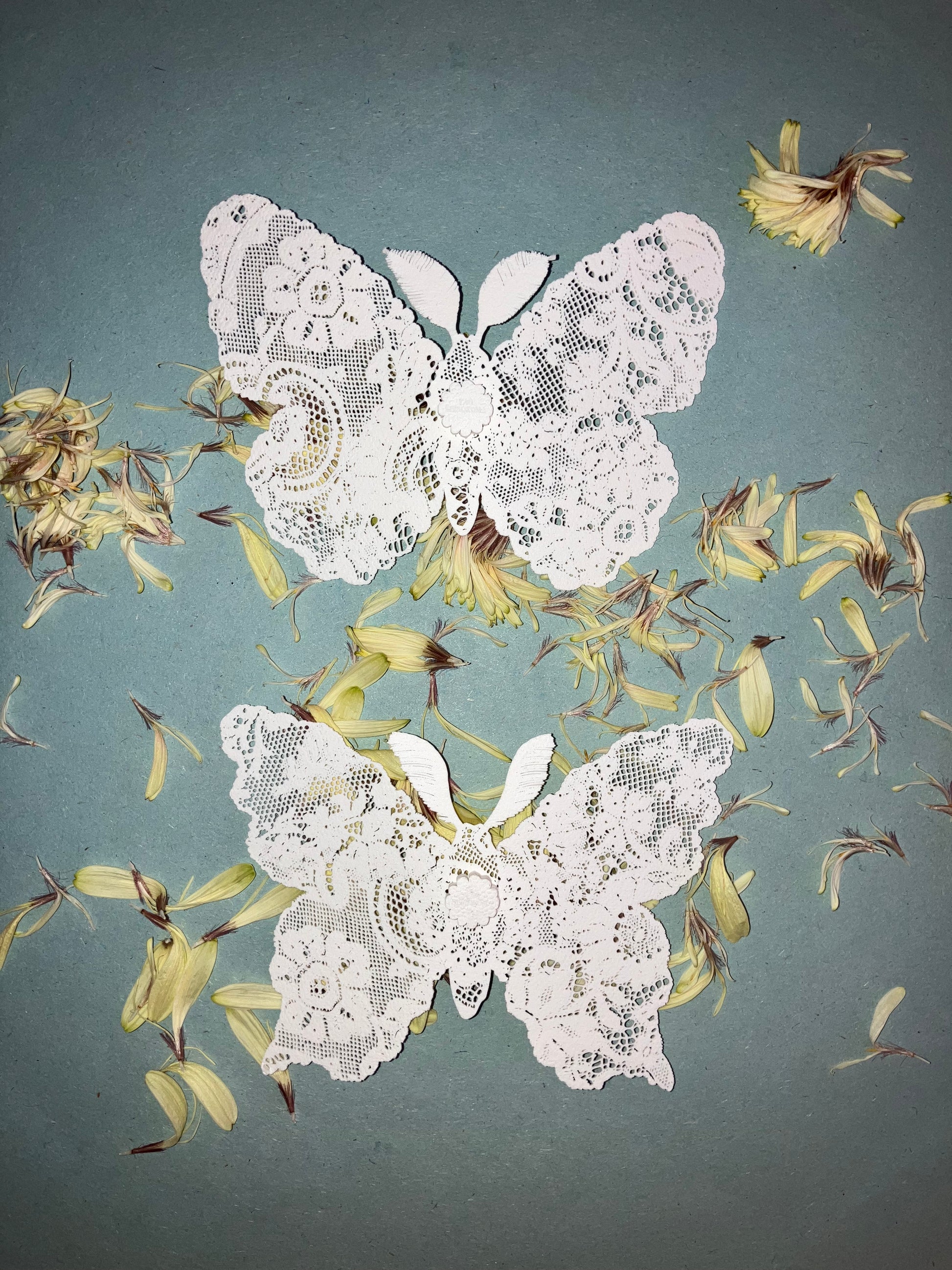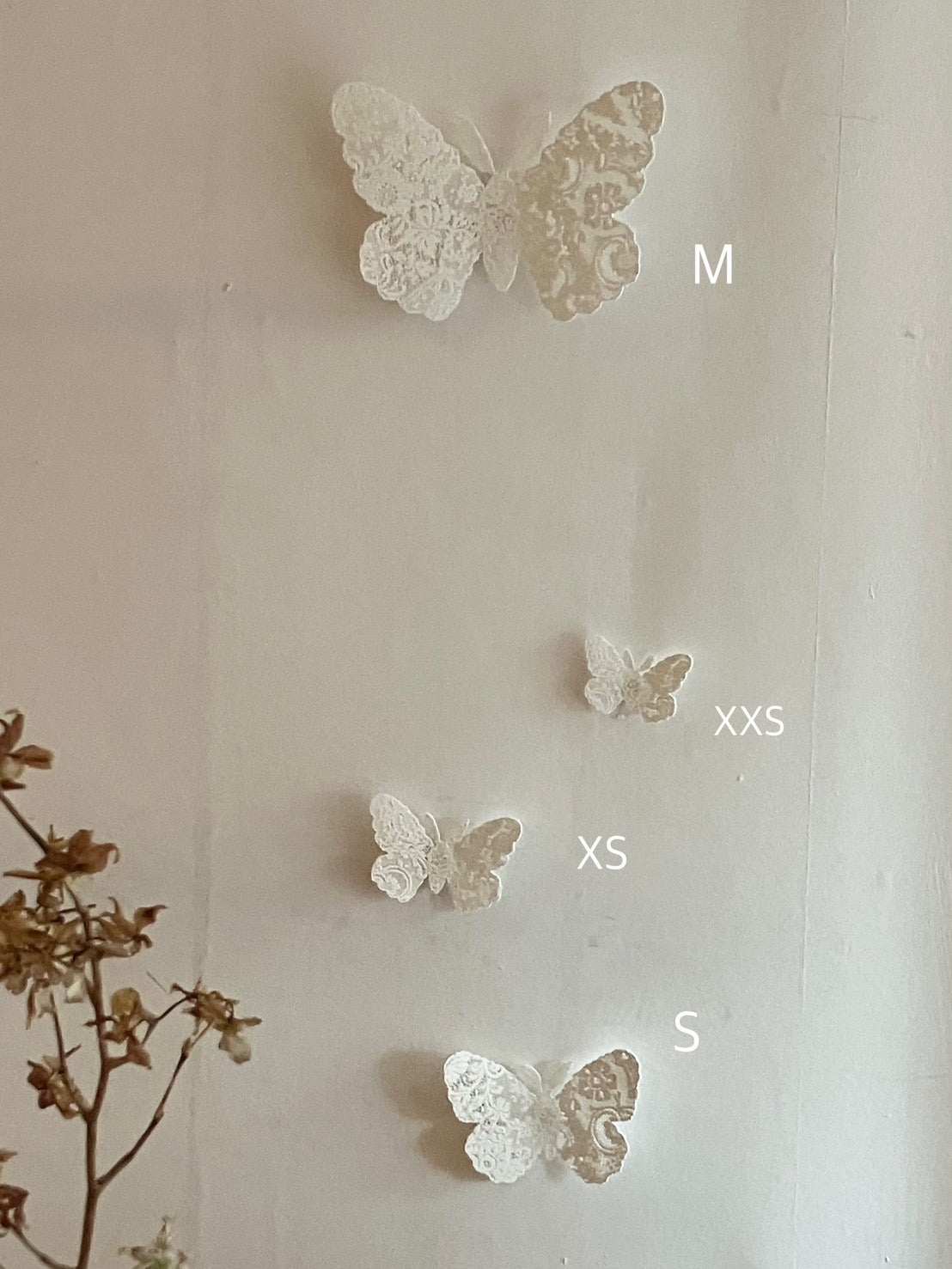 1は、羽がシャープで比較的「蝶」らしいシルエット、2は、羽が丸みを帯びていて比較的「蛾」らしいシルエットです。レース模様や羽以外の要素にも、ひとつひとつほのかに違いがございます。どんなものが届くかお楽しみに、個体差をご了承いただけますと幸いです。❤︎